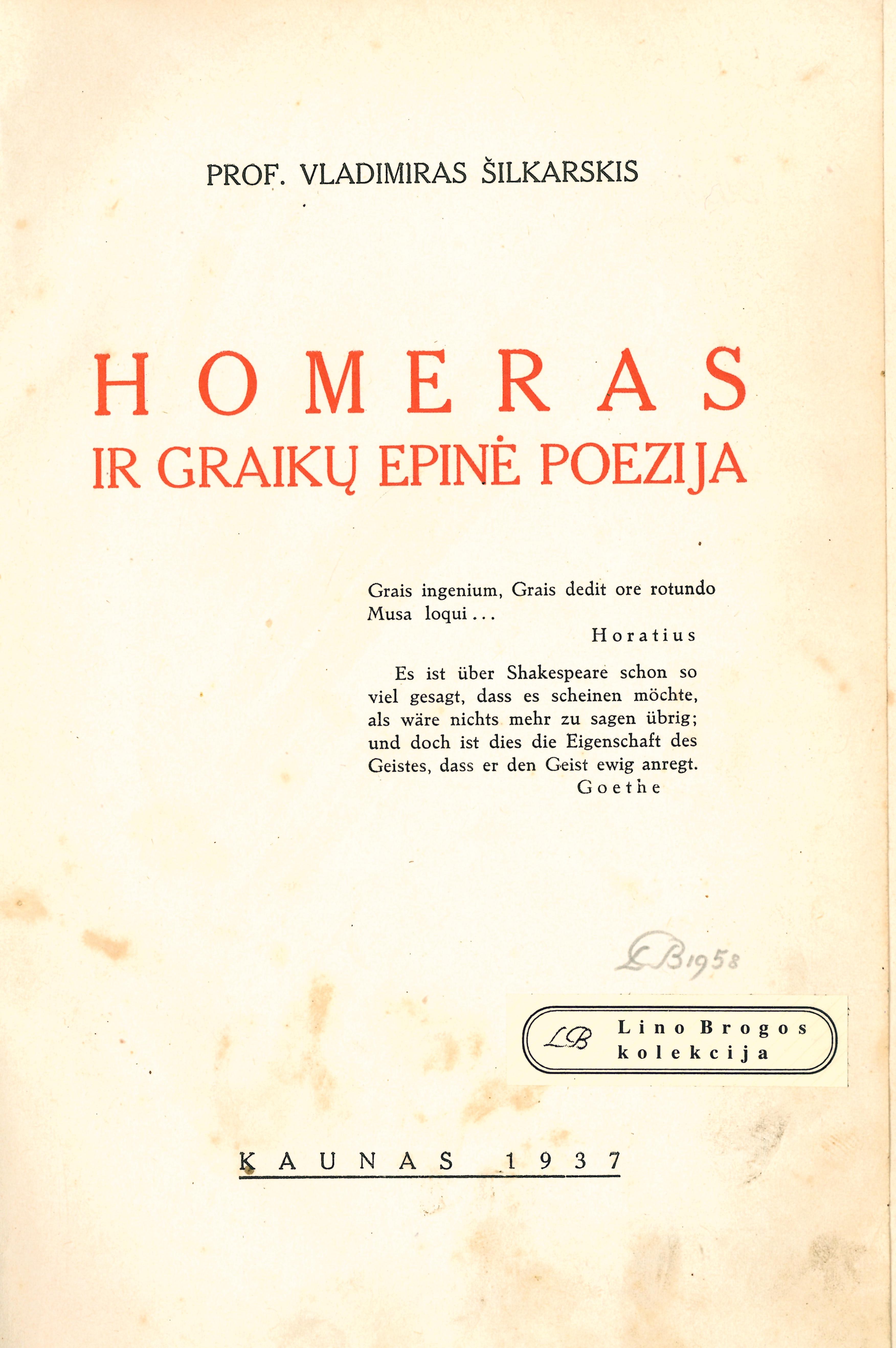 | Antraštė | Homeras ir graikų epinė poezija (1937) |