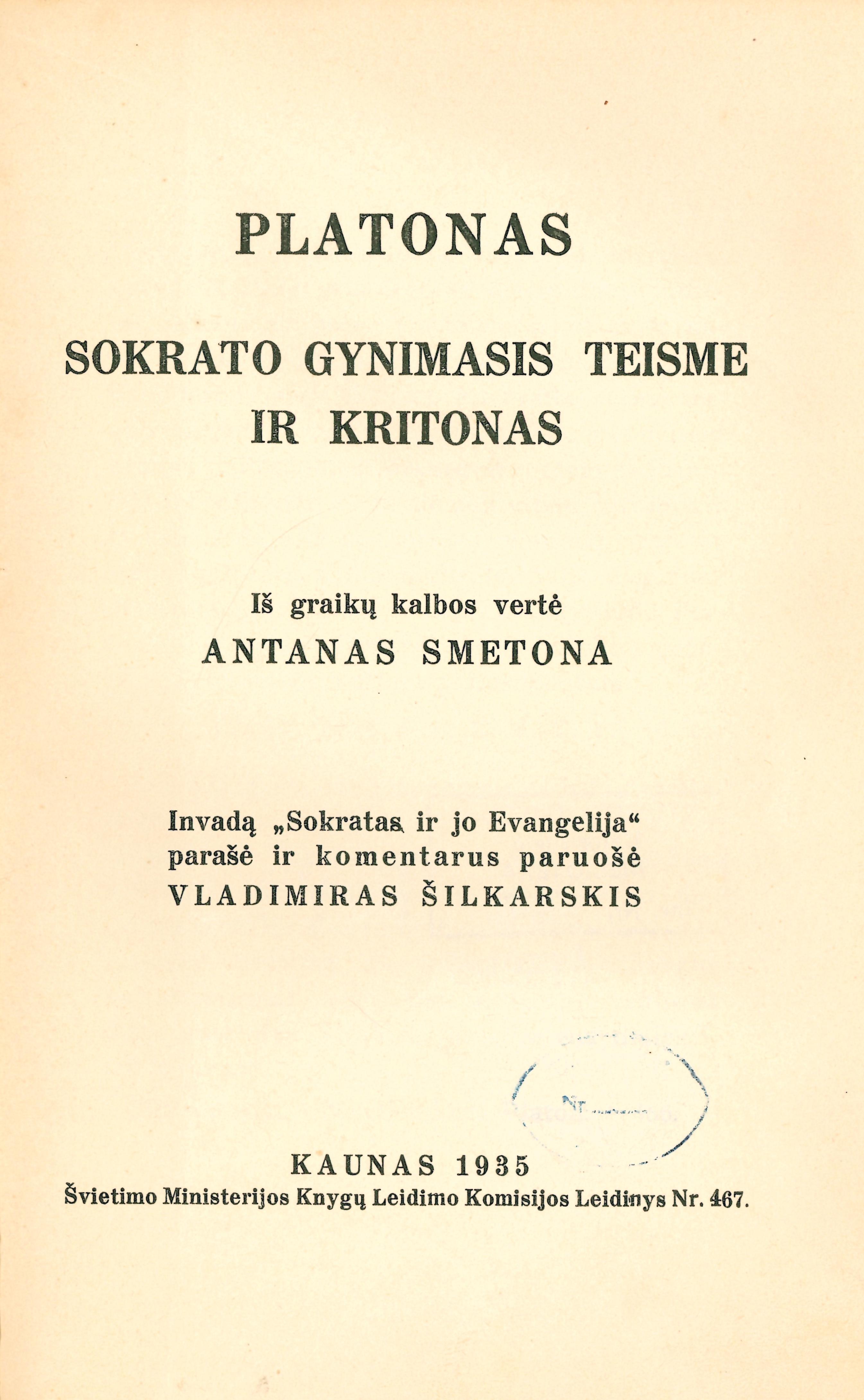 | Platonasiš graikų kalbos vertė Antanas Smetona; invadą "Sokratas ir jo evangelija" parašė ir komentarus paruošė Vladimiras Šilkarskis | |