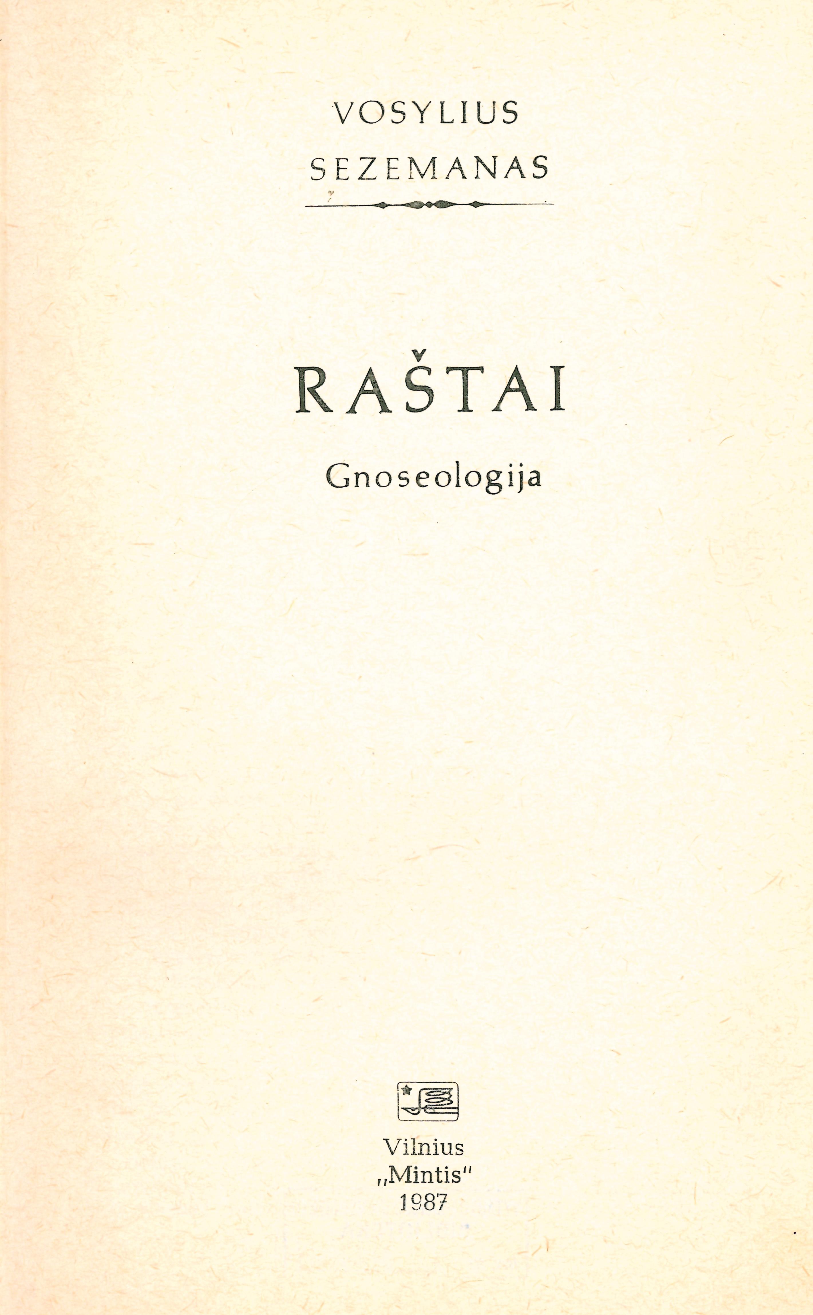 Raštai : gnoseologija / Vosylius Sezemanas ; parengė Albinas Lozuraitis. – Vilnius : Mintis, 1987. – 383 p. : iliustr., portr. – (Iš Lietuvos filosofijos palikimo)