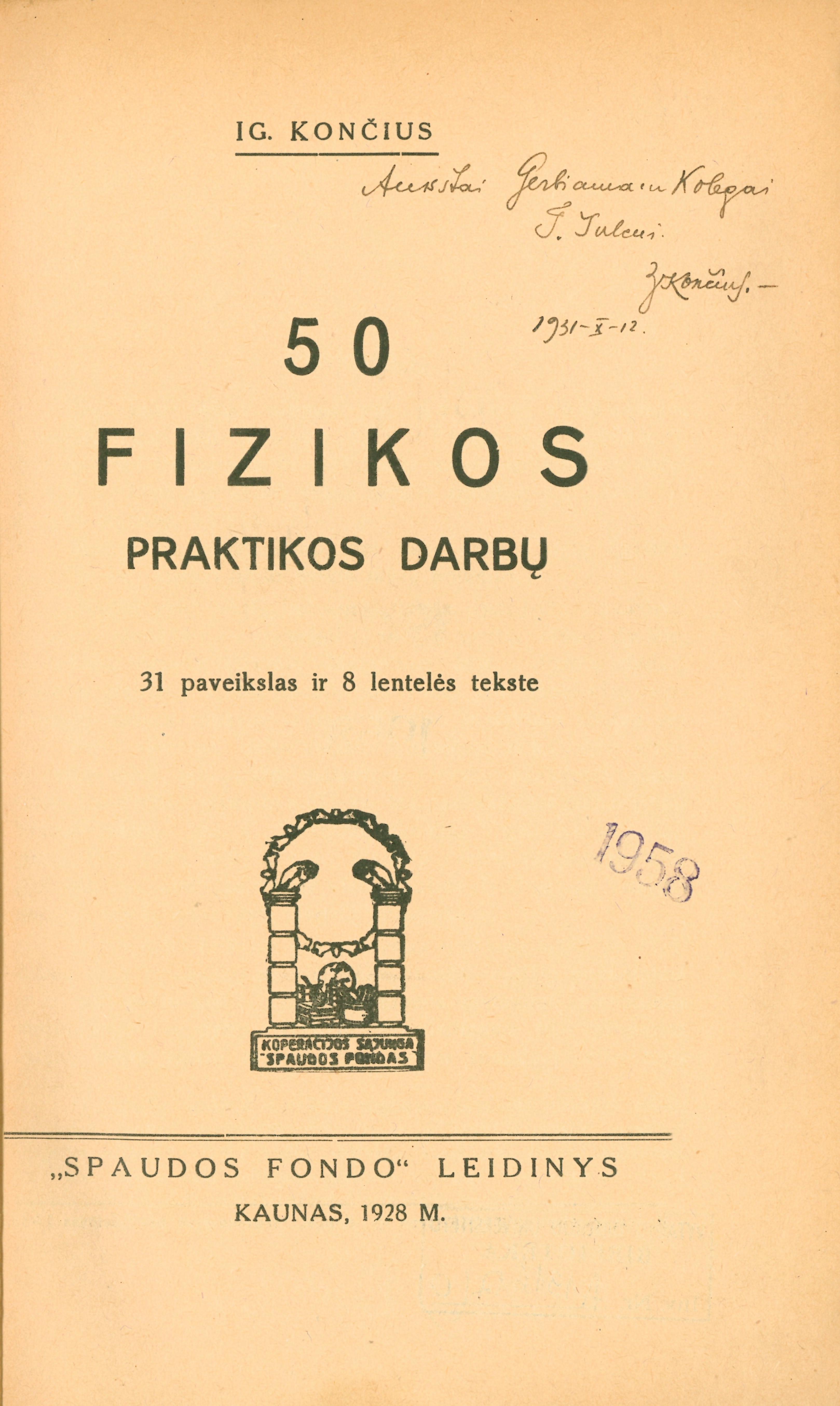 50 fizikos praktikos darbų : 31 paveikslas ir 8 lentelės tekste / Ig. Končius. – Kaunas : Spaudos fondas, 1928. – 84 p. : iliustracijos, lentelės.