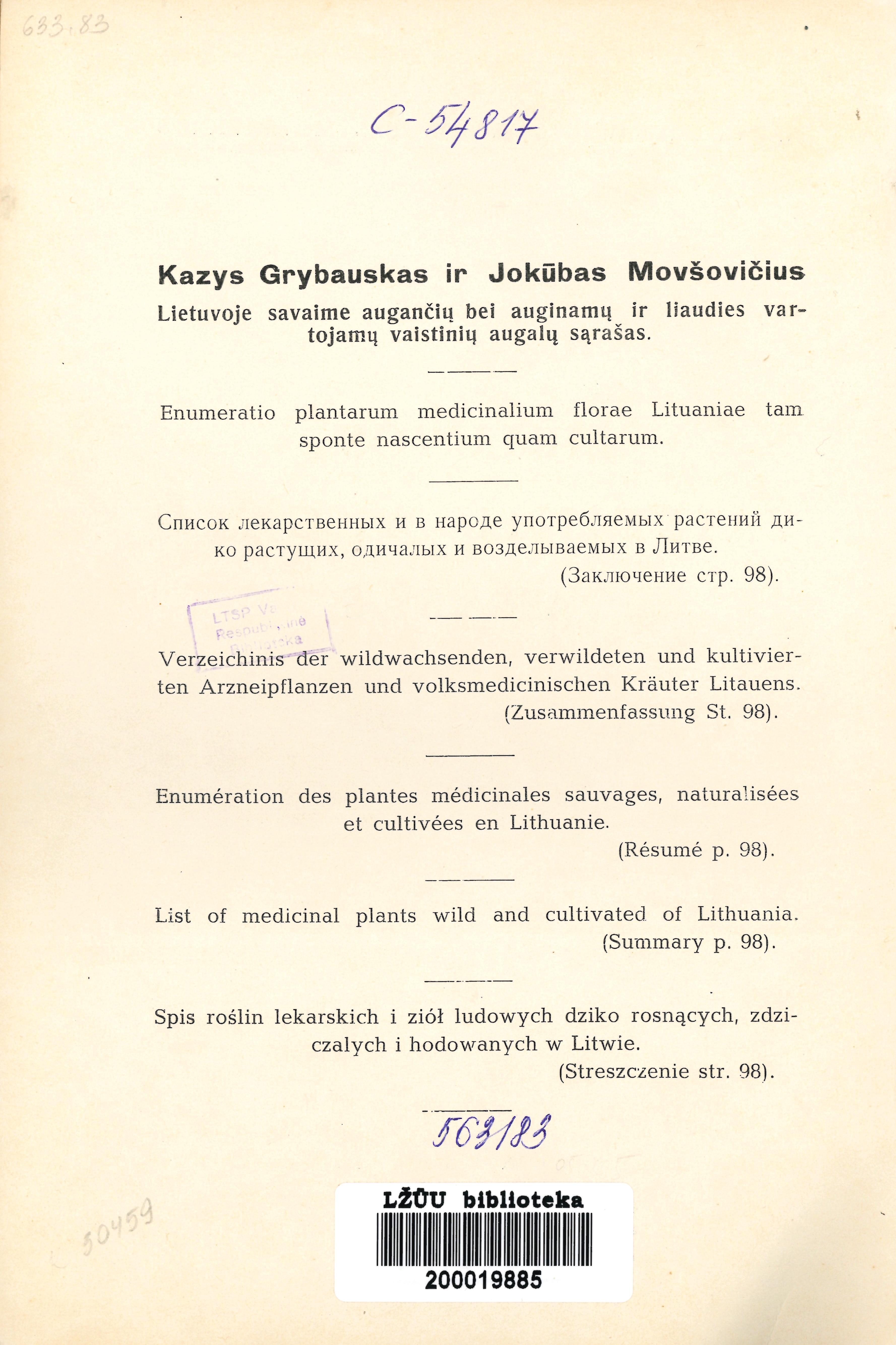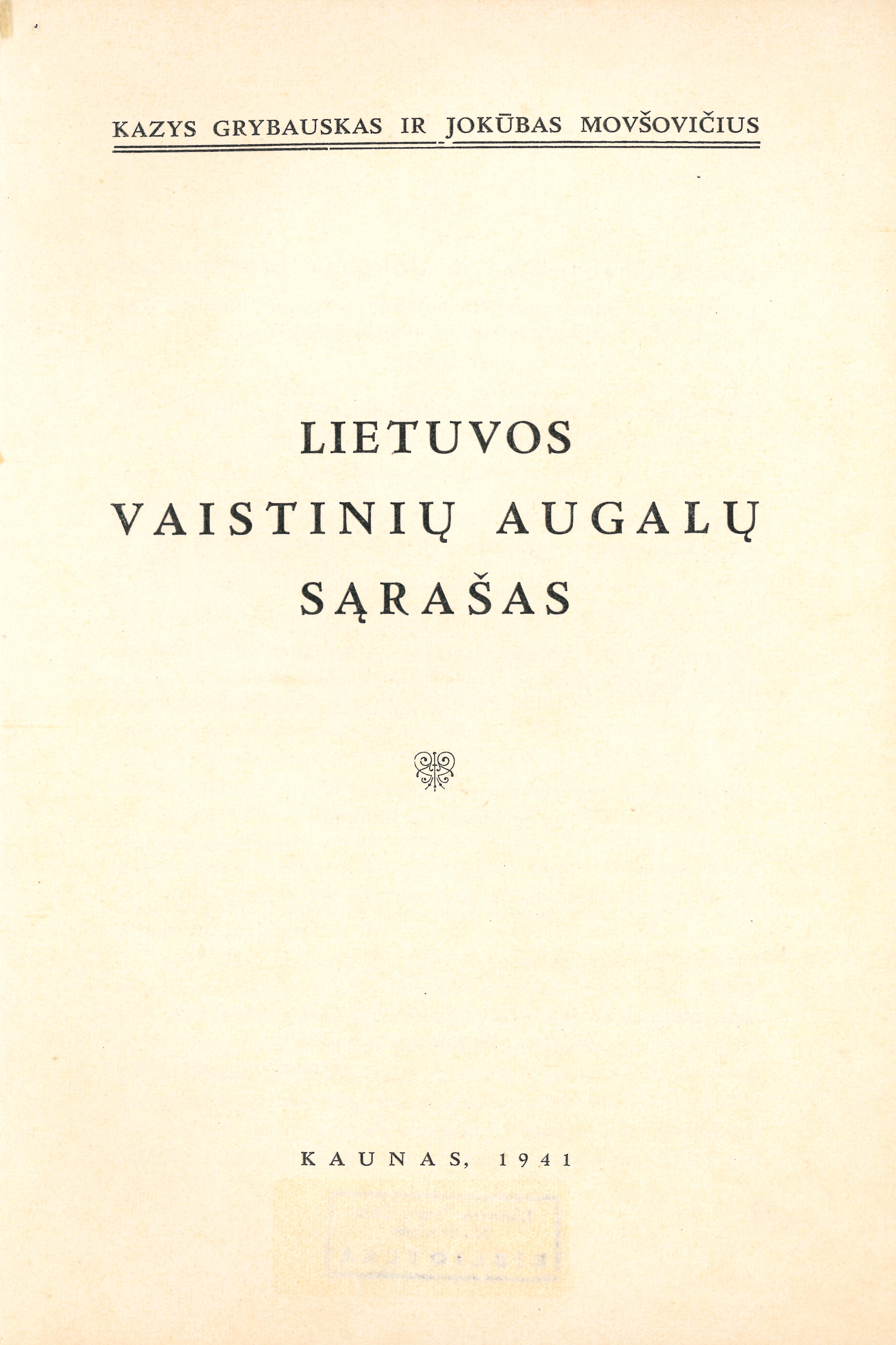 Lietuvoje savaime augančių bei auginamų ir liaudies vartojamų vaistinių augalų sąrašas / Kazys Grybauskas ir Jokūbas Movšovičius. – Kaunas, 1941. – 128 p. – Santr. rus., vok., pranc., angl., lenk. – Viršelio antraštė „Lietuvos vaistinių augalų sąrašas“.