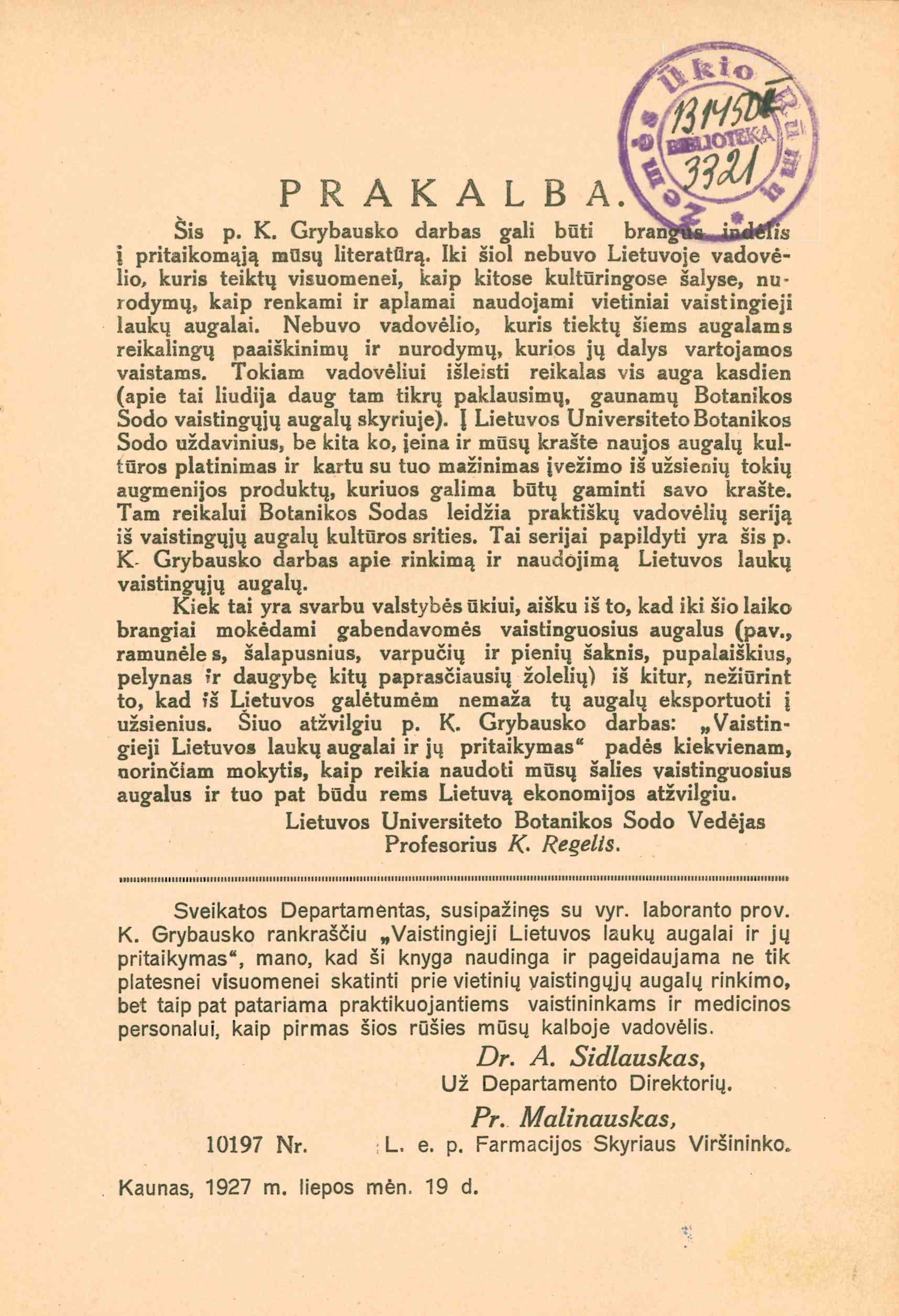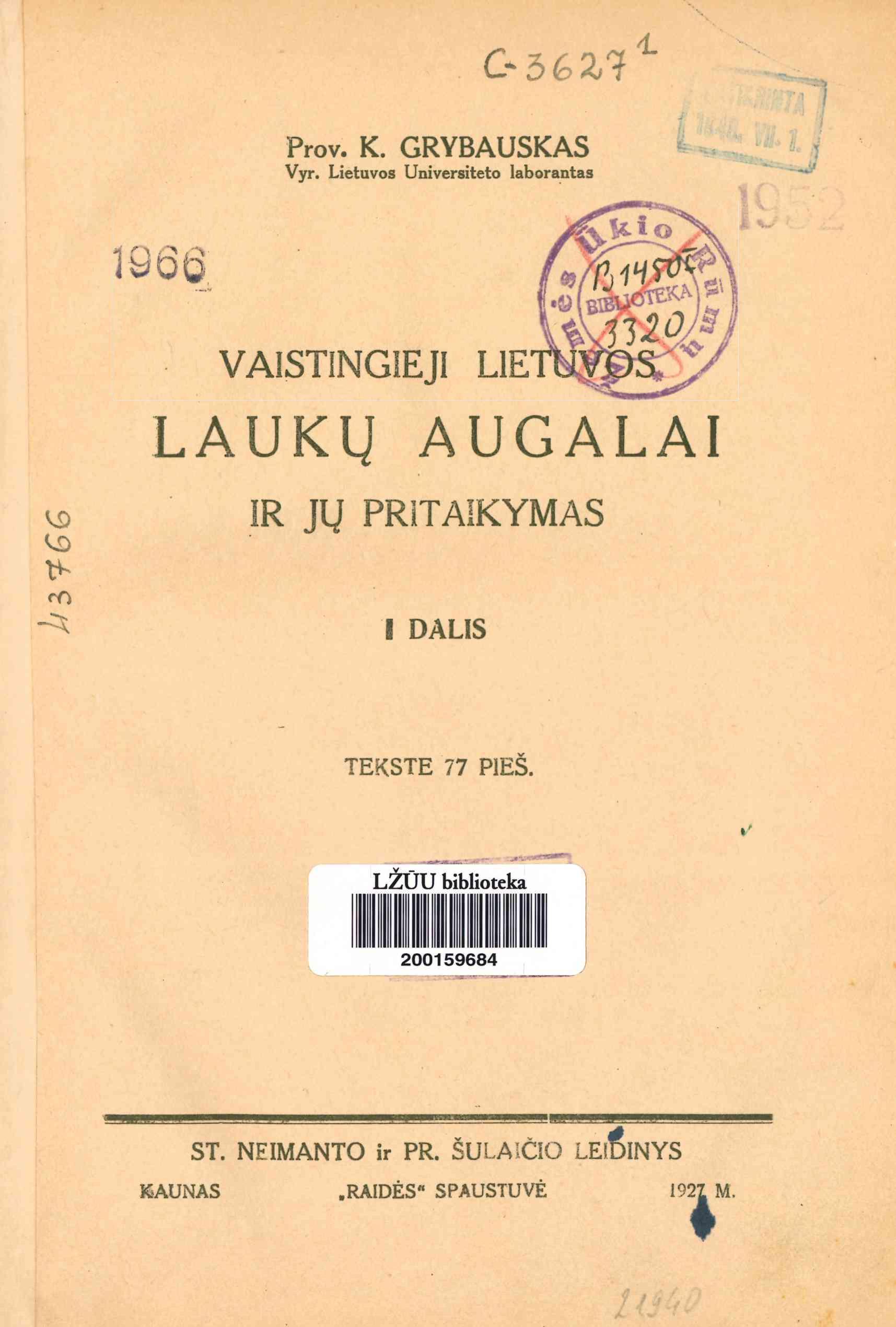 Vaistingieji Lietuvos laukų augalai ir jų pritaikymas / K. Grybauskas. – Kaunas, 1927-1935. – 2 tomai : iliustracijos. – Antro tomo bendroji antraštė „Vaistingieji Lietuvos augalai“.