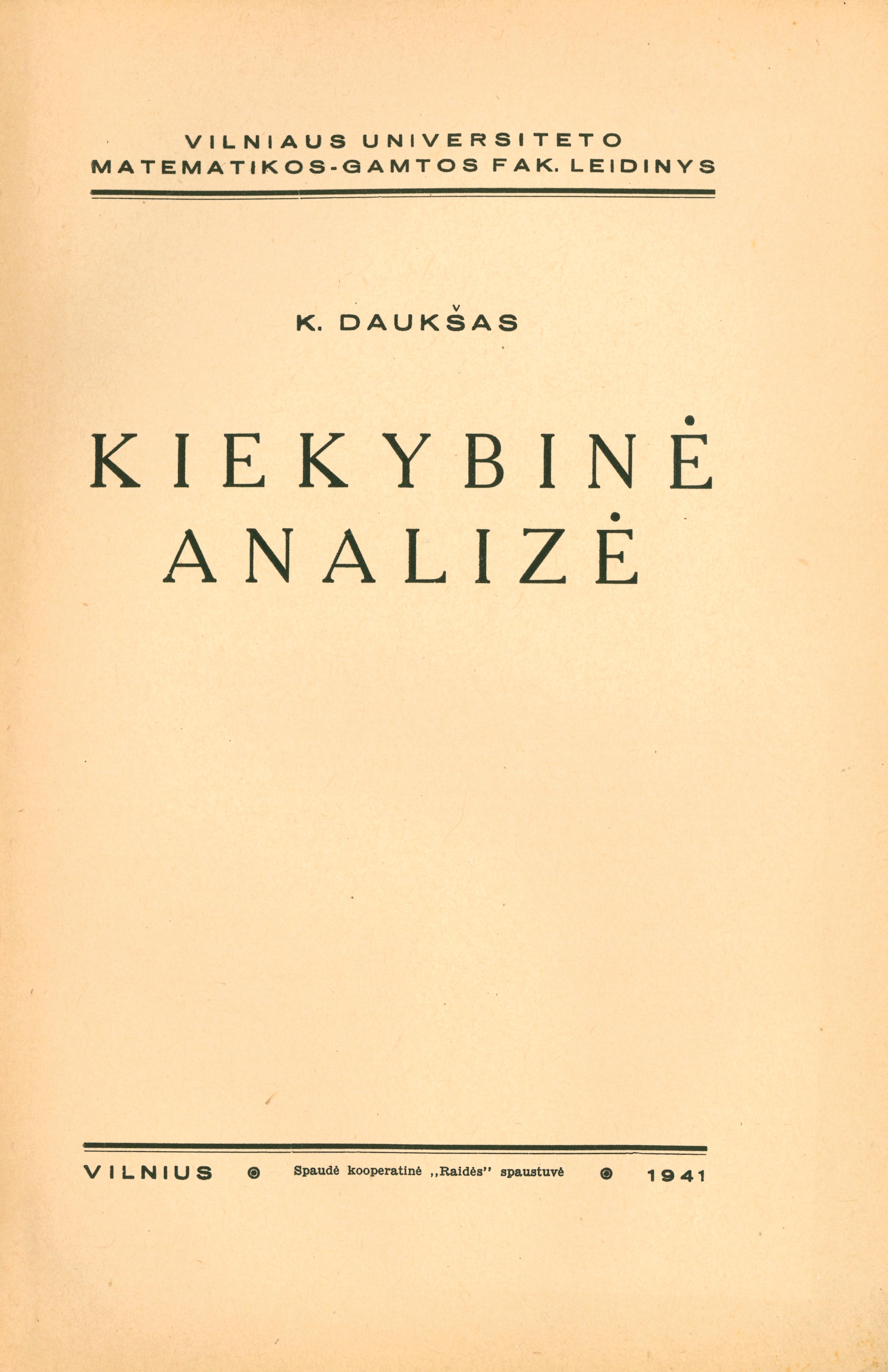 Kiekybinė analizė / K. Daukšas. – Vilnius : Vilniaus universiteto Matematikos-gamtos fakultetas, 1941. – XIII, 392 p. : iliustracijos.