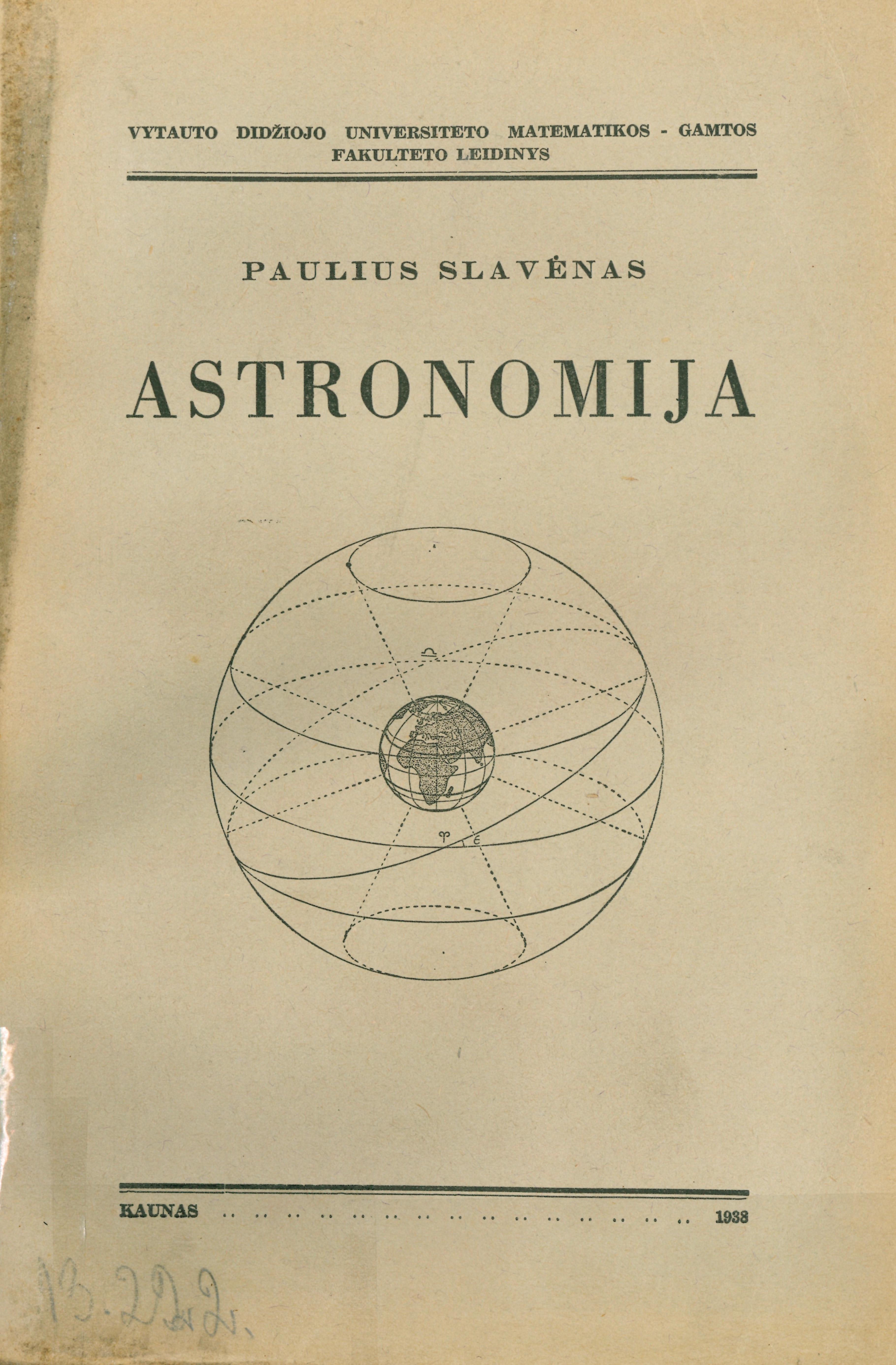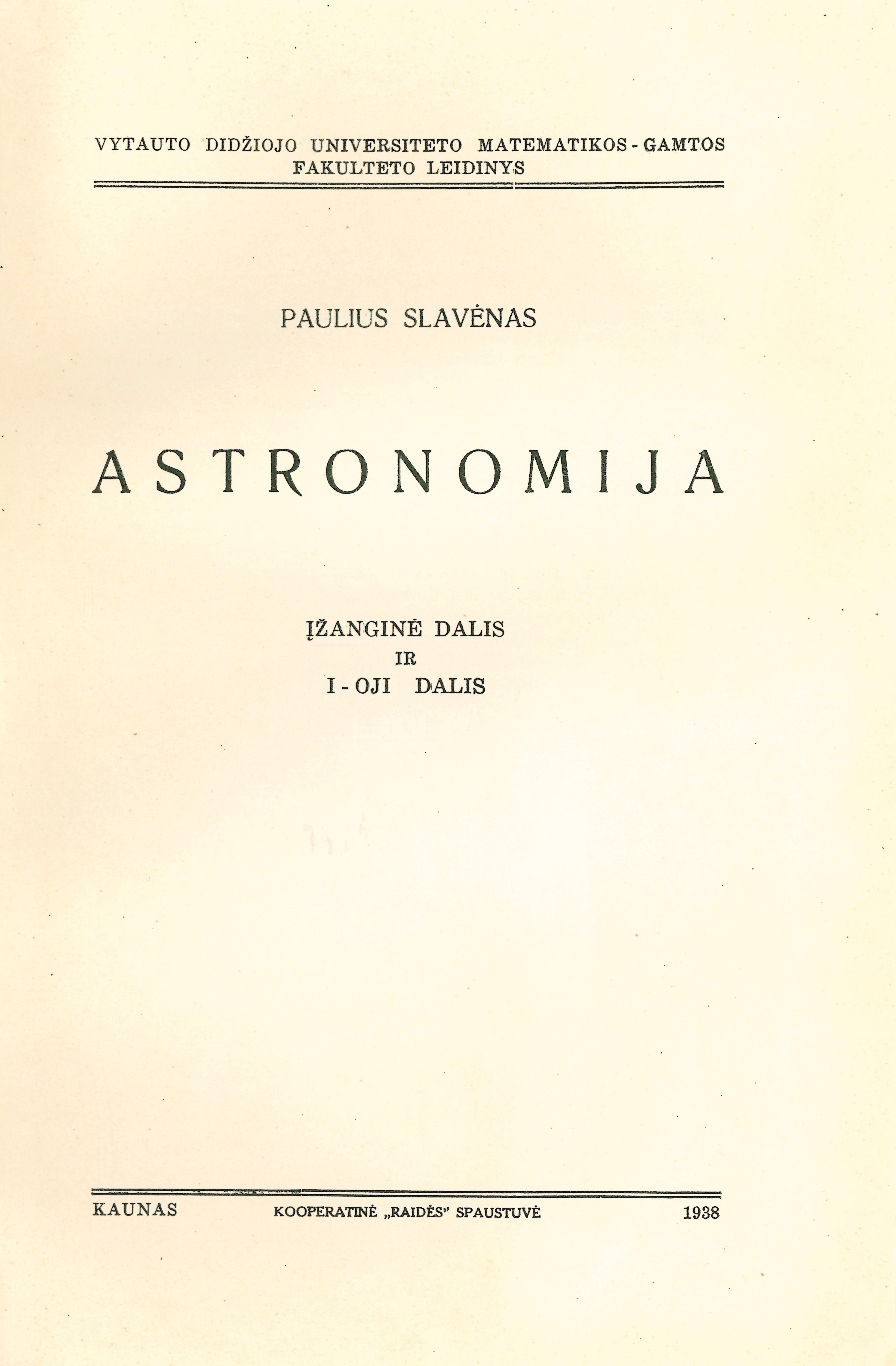 Astronomija : įžanginė dalis ir I-oji dalis / Paulius Slavėnas. – Kaunas : VDU Matematikos-gamtos fakultetas, 1938. – 315 p. : iliustracijos.