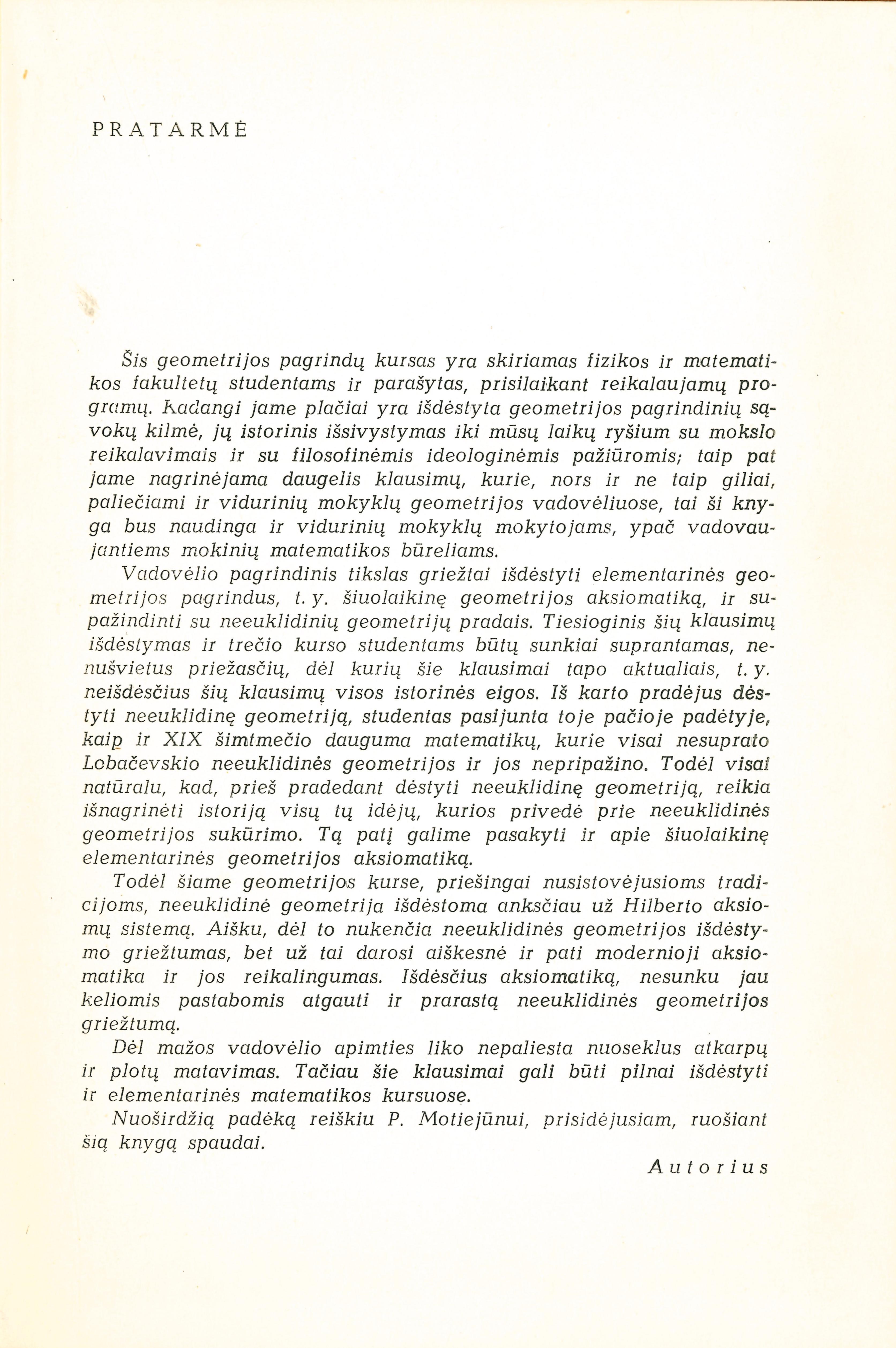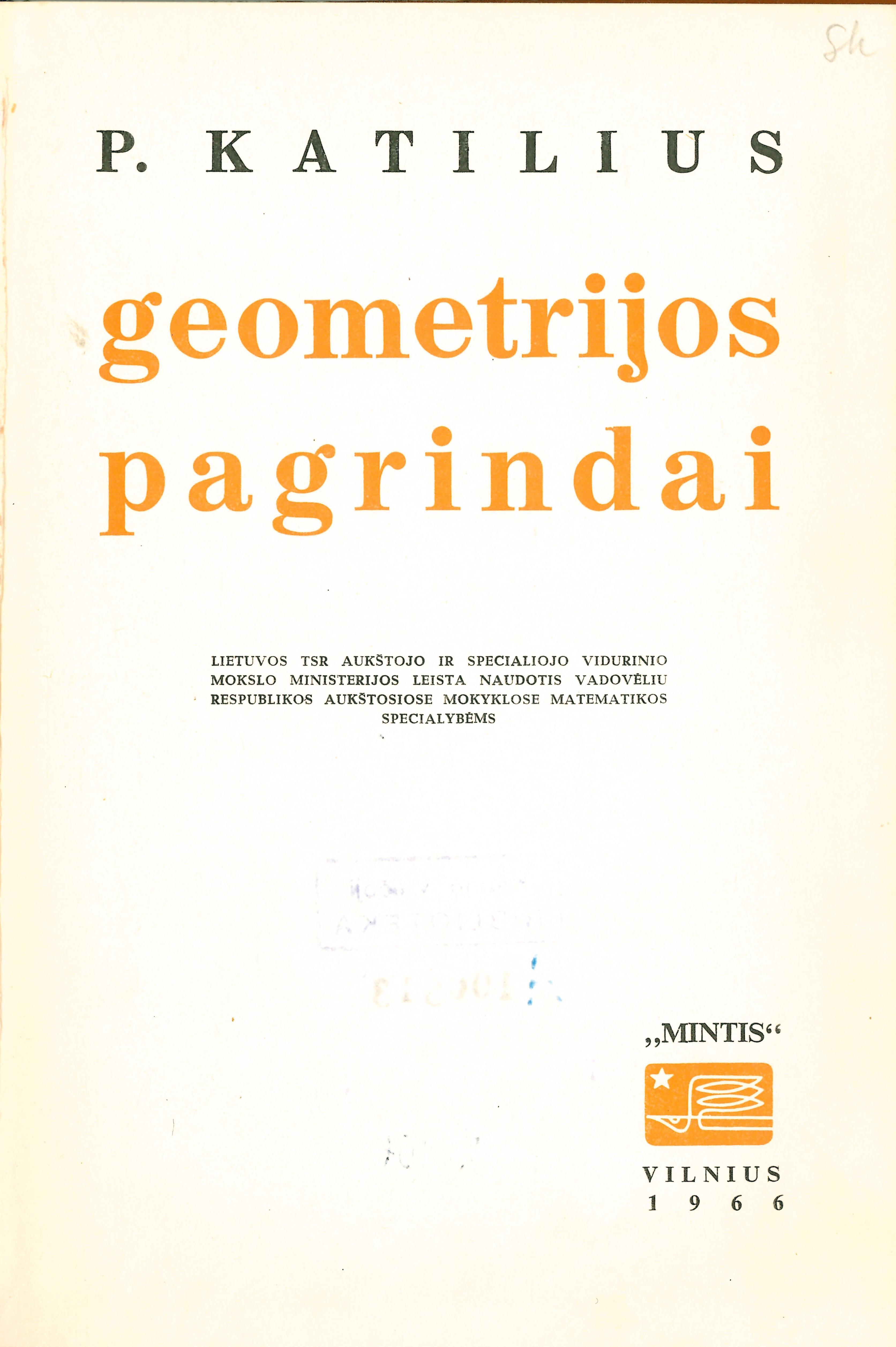 Geometrijos pagrindai : [vadovėlis respublikos aukštosiose mokyklose matematikos specialybėms] / P. Katilius. – Vilnius : Mintis, 1966. – 293 p. : brėžiniai.