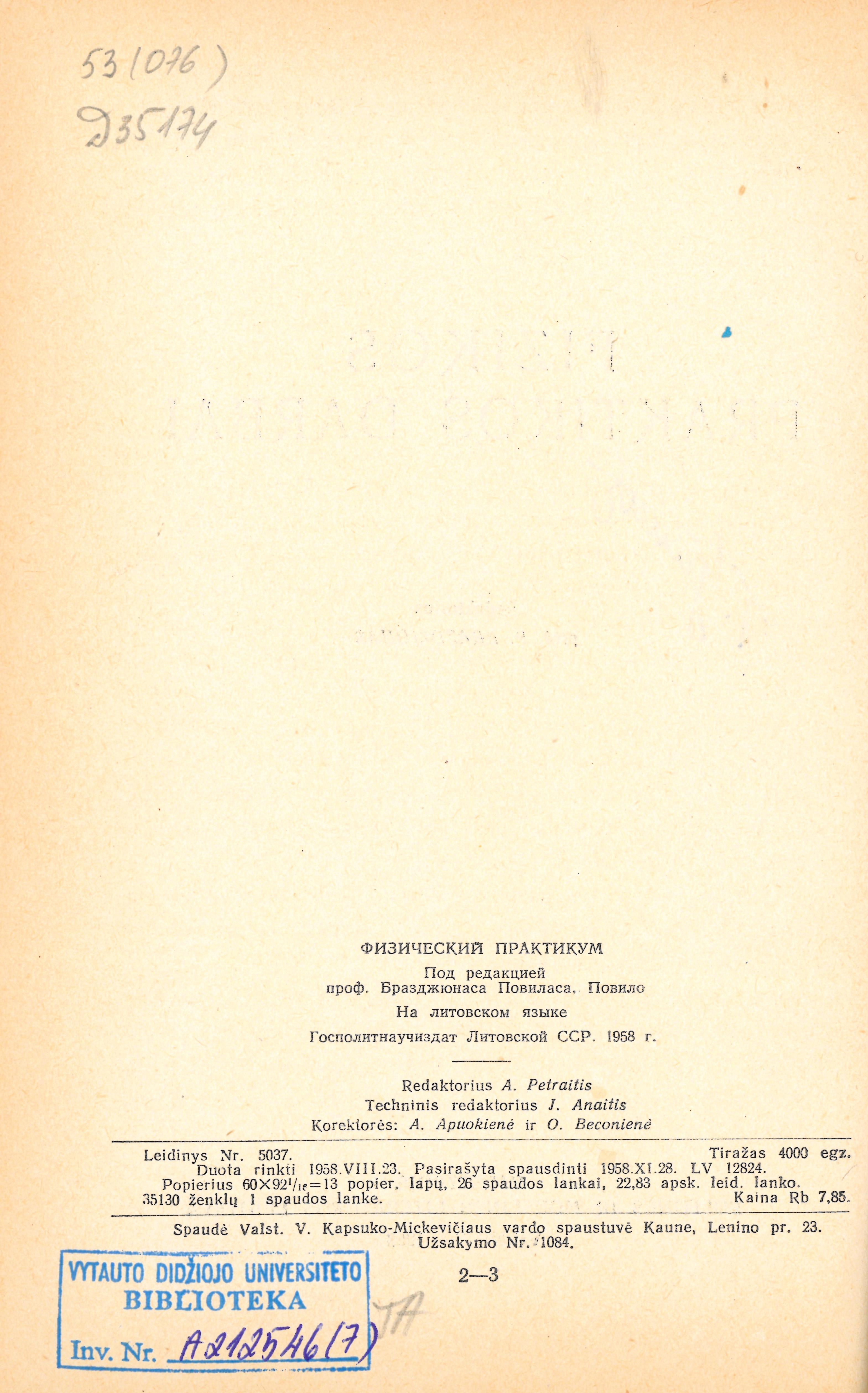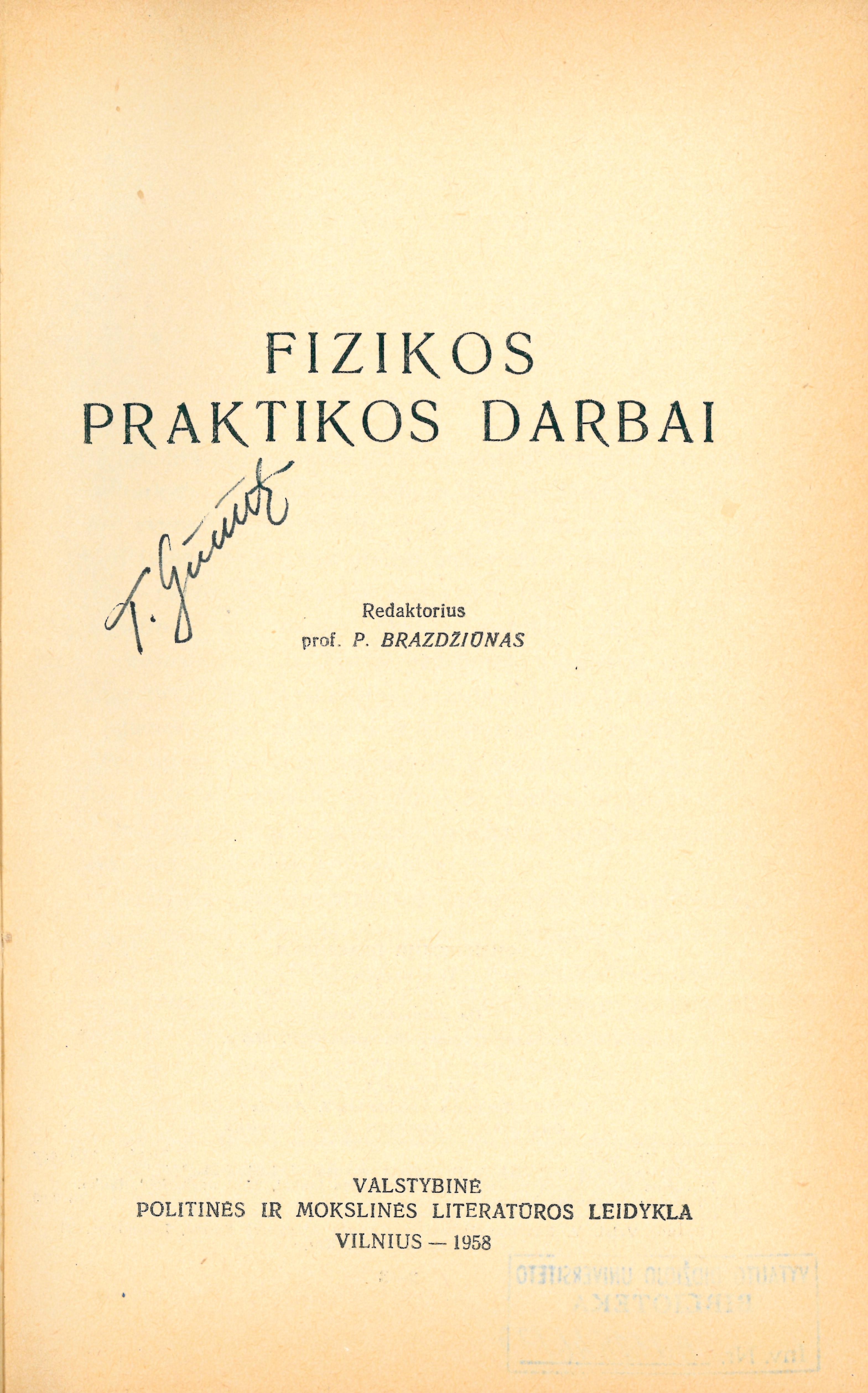 Fizikos praktikos darbai / redaktorius P. Brazdžiūnas. – Vilnius : Valstybinė politinės ir mokslinės literatūros leidykla, 1958. – 415 p. : iliustracijos.
