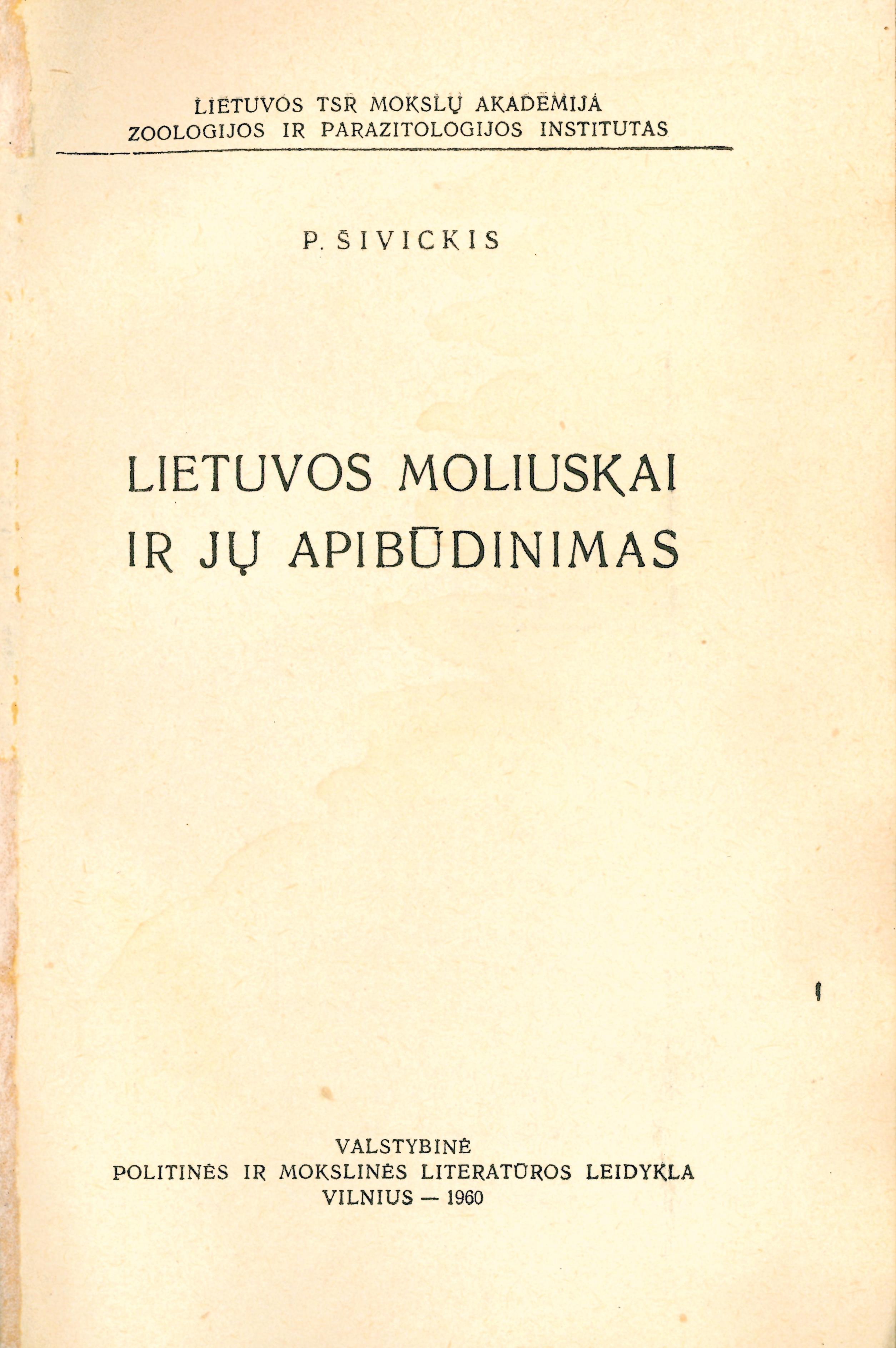 Lietuvos moliuskai ir jų apibūdinimas / P. Šivickis ; Lietuvos TSR mokslų akademija. Zoologijos ir parazitologijos institutas. – Vilnius : Valstybinė politinės ir mokslinės literatūros leidykla, 1960. – 351 p. : iliustracijos.