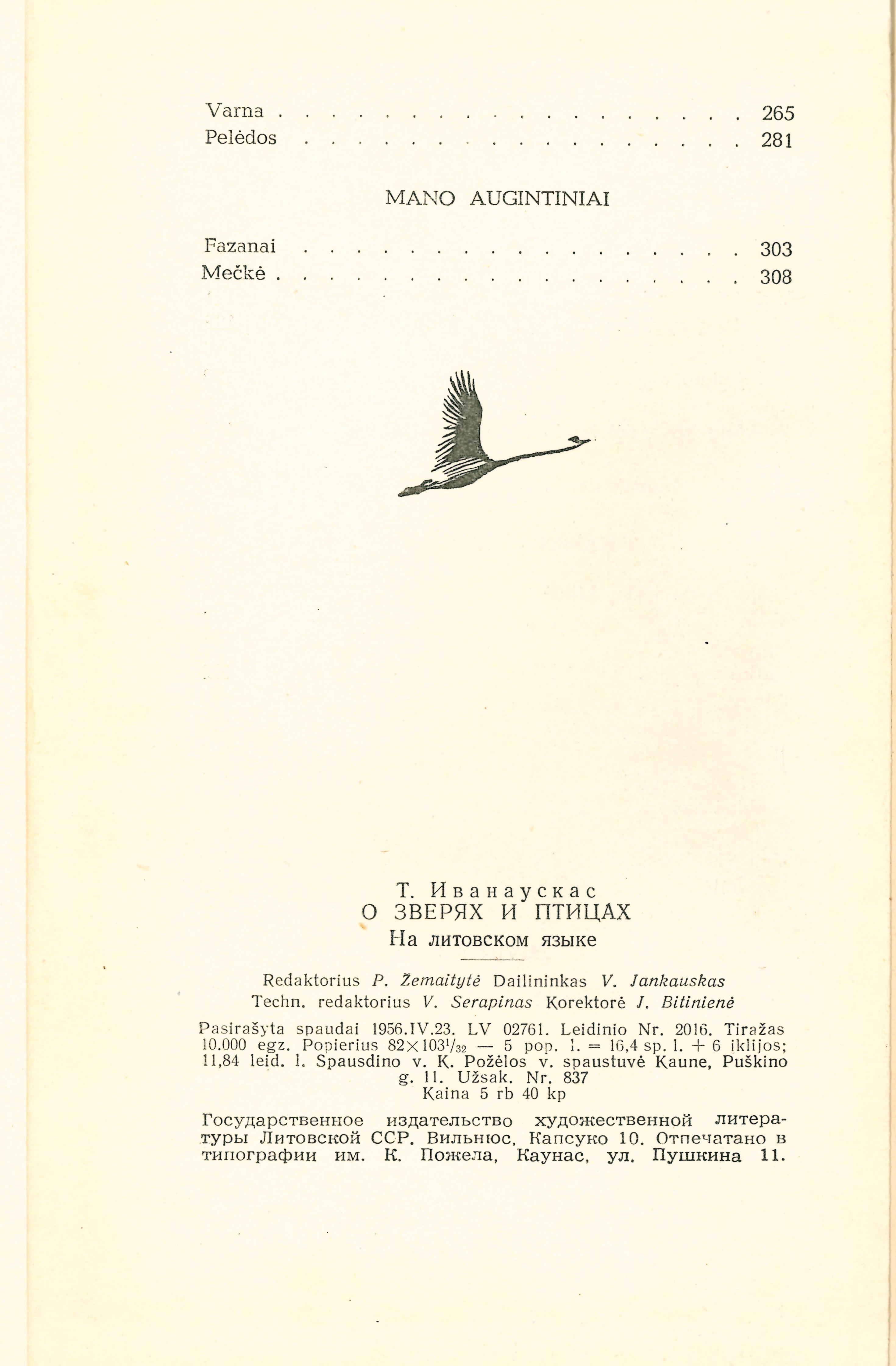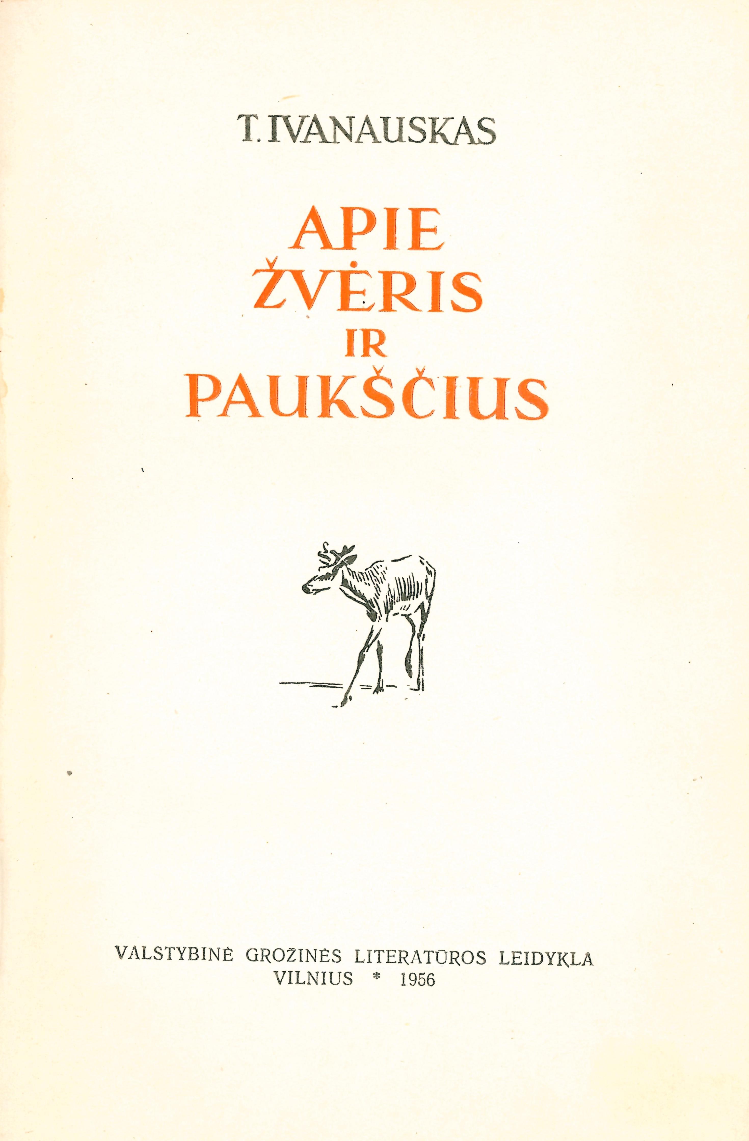 Apie žvėris ir paukščius / T. Ivanauskas. – Vilnius : Valstybinė grožinės literatūros leidykla, 1956. – 319 p., 6 iliustruoti lap. : iliustracijos.