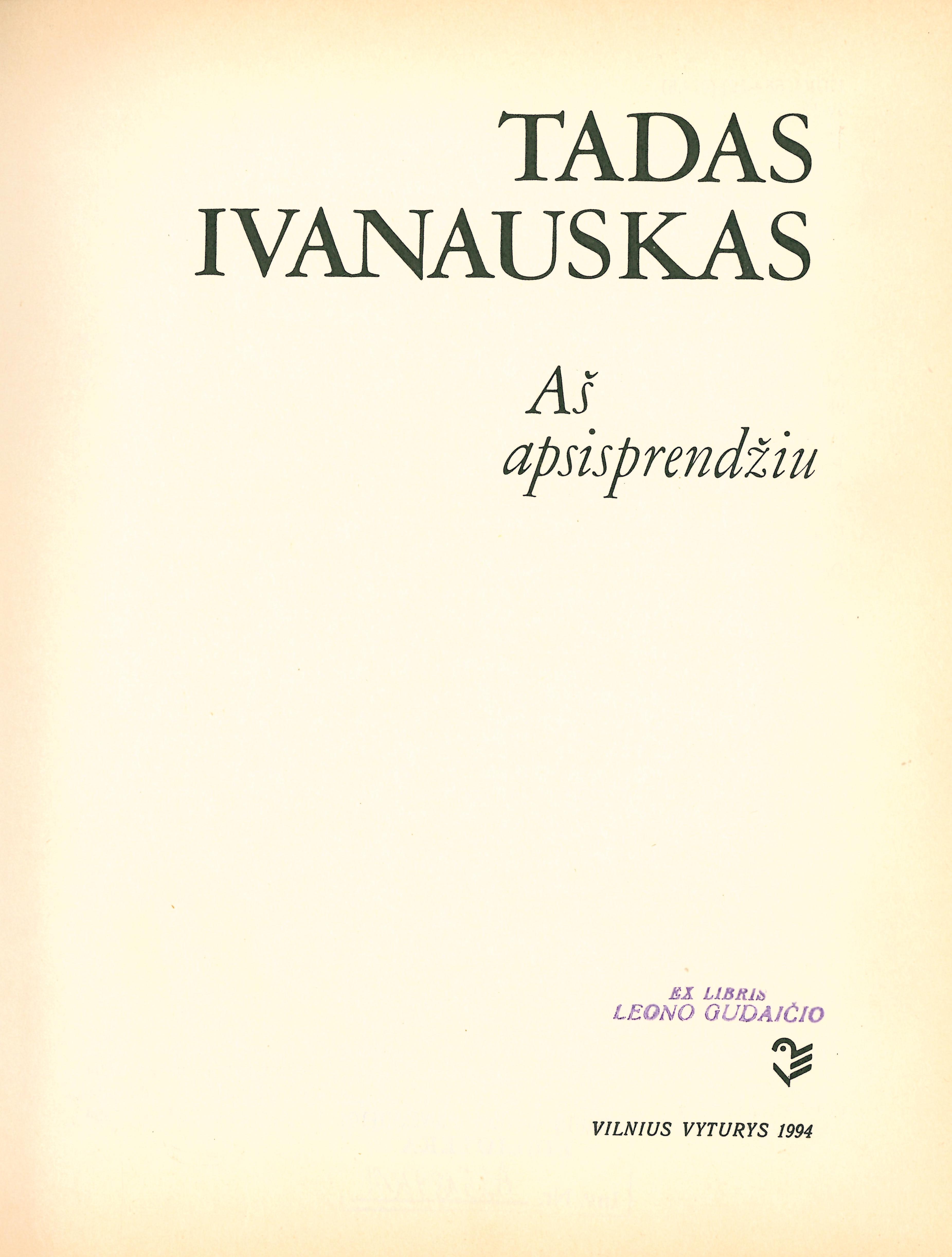 Aš apsisprendžiu : atsiminimai / Tadas Ivanauskas ; sudarytojas R. Budrys. – Vilnius : Vyturys, 1994. – 233 p. : iliustracijos.