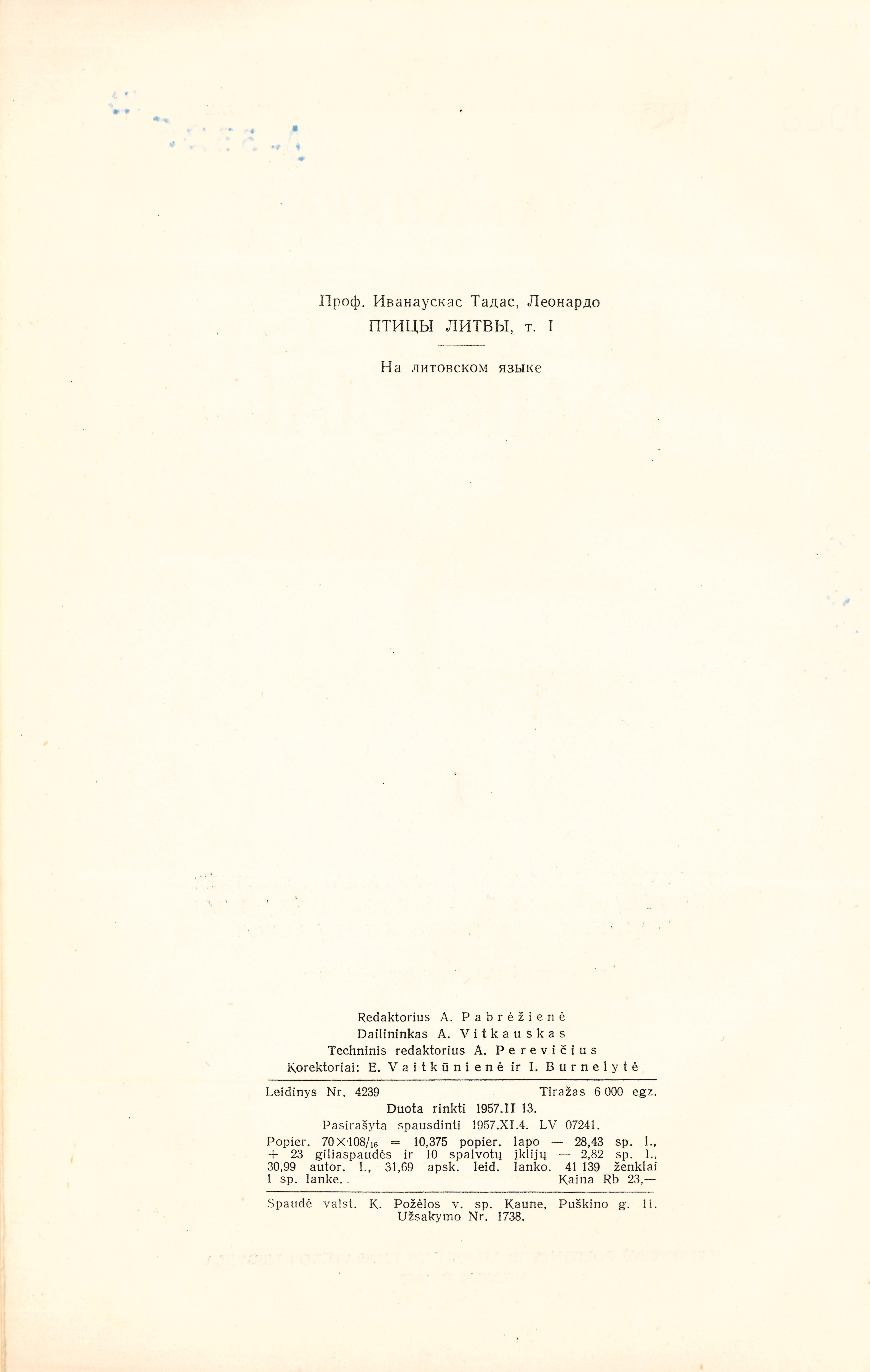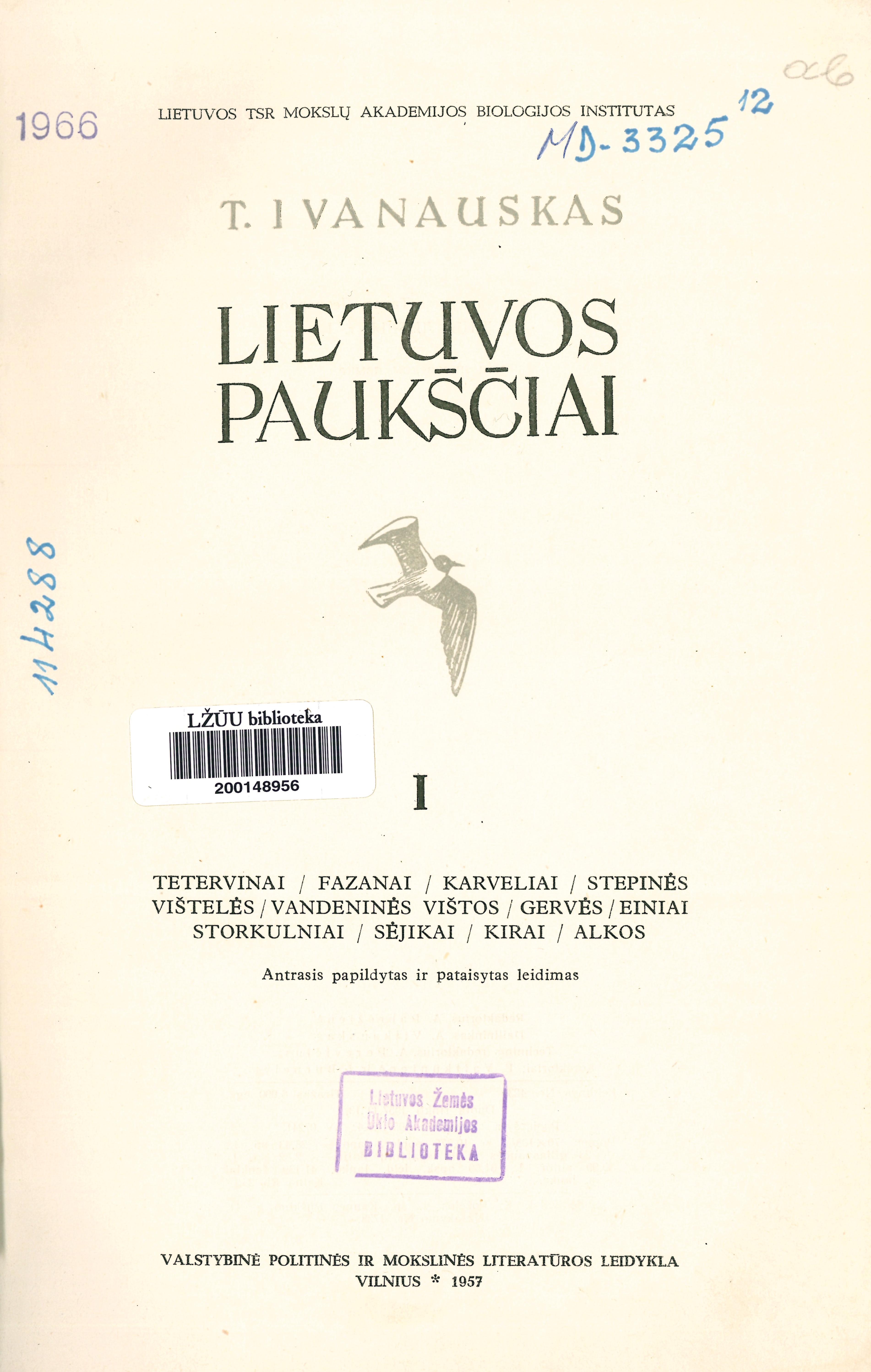 Lietuvos paukščiai / T. Ivanauskas ; Lietuvos TSR mokslų akademijos biologijos institutas. – 2-asis, papild. ir patais. leid. – Vilnius : Valstybinė politinės ir mokslinės literatūros leidykla, 1957-1964. – 3 dalys.