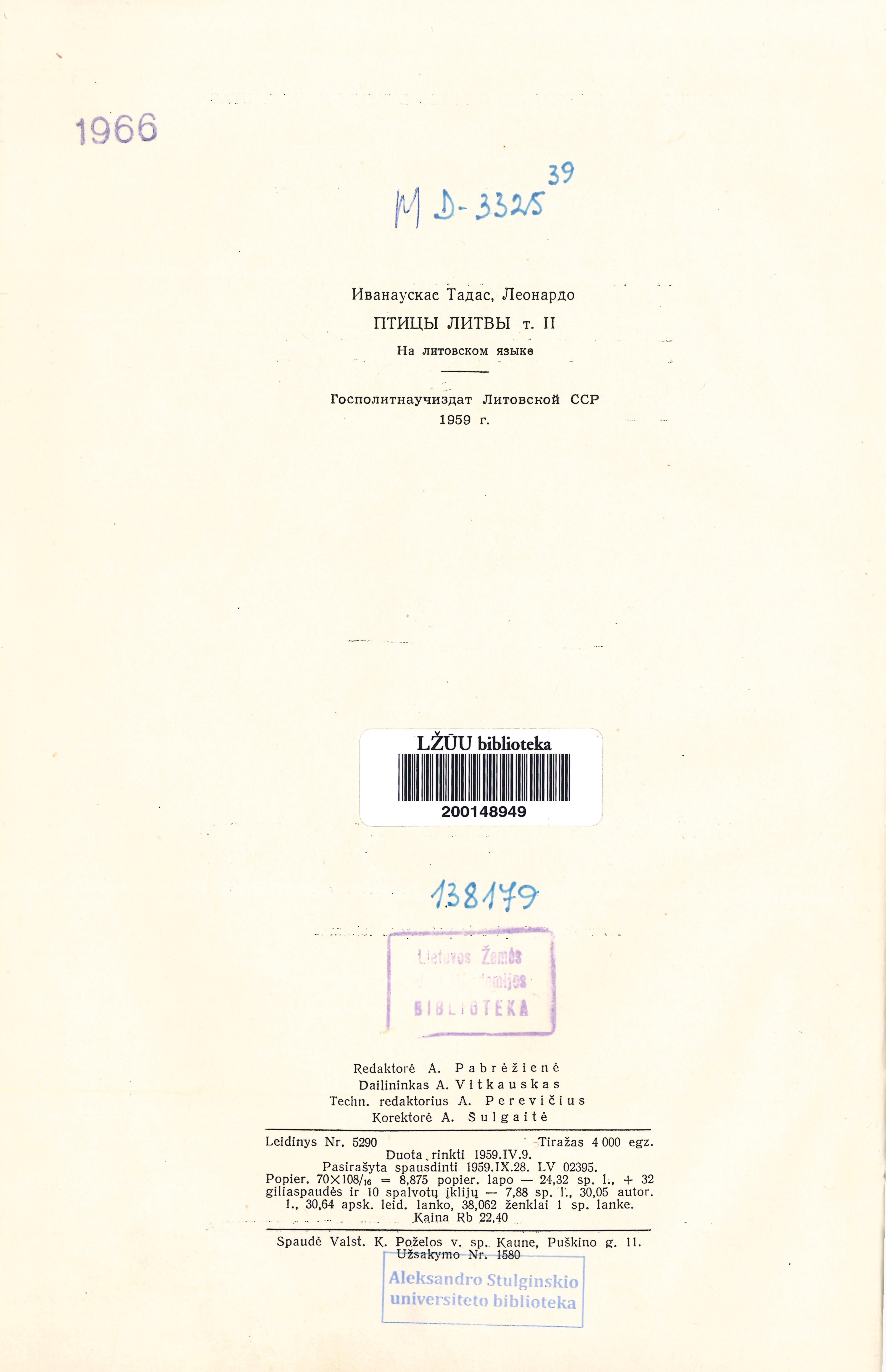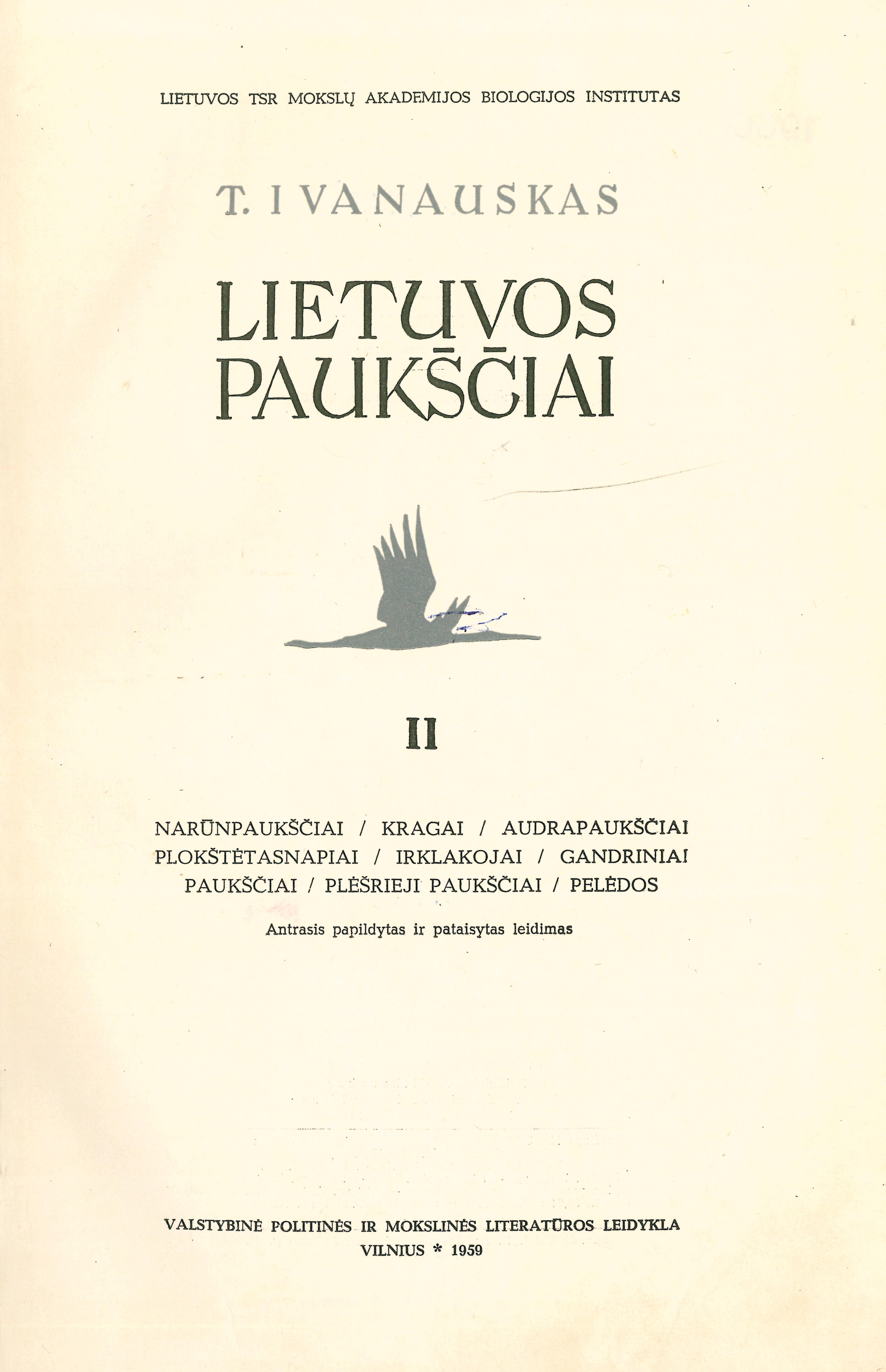 Lietuvos paukščiai / T. Ivanauskas ; Lietuvos TSR mokslų akademijos biologijos institutas. – 2-asis, papild. ir patais. leid. – Vilnius : Valstybinė politinės ir mokslinės literatūros leidykla, 1957-1964. – 3 dalys.