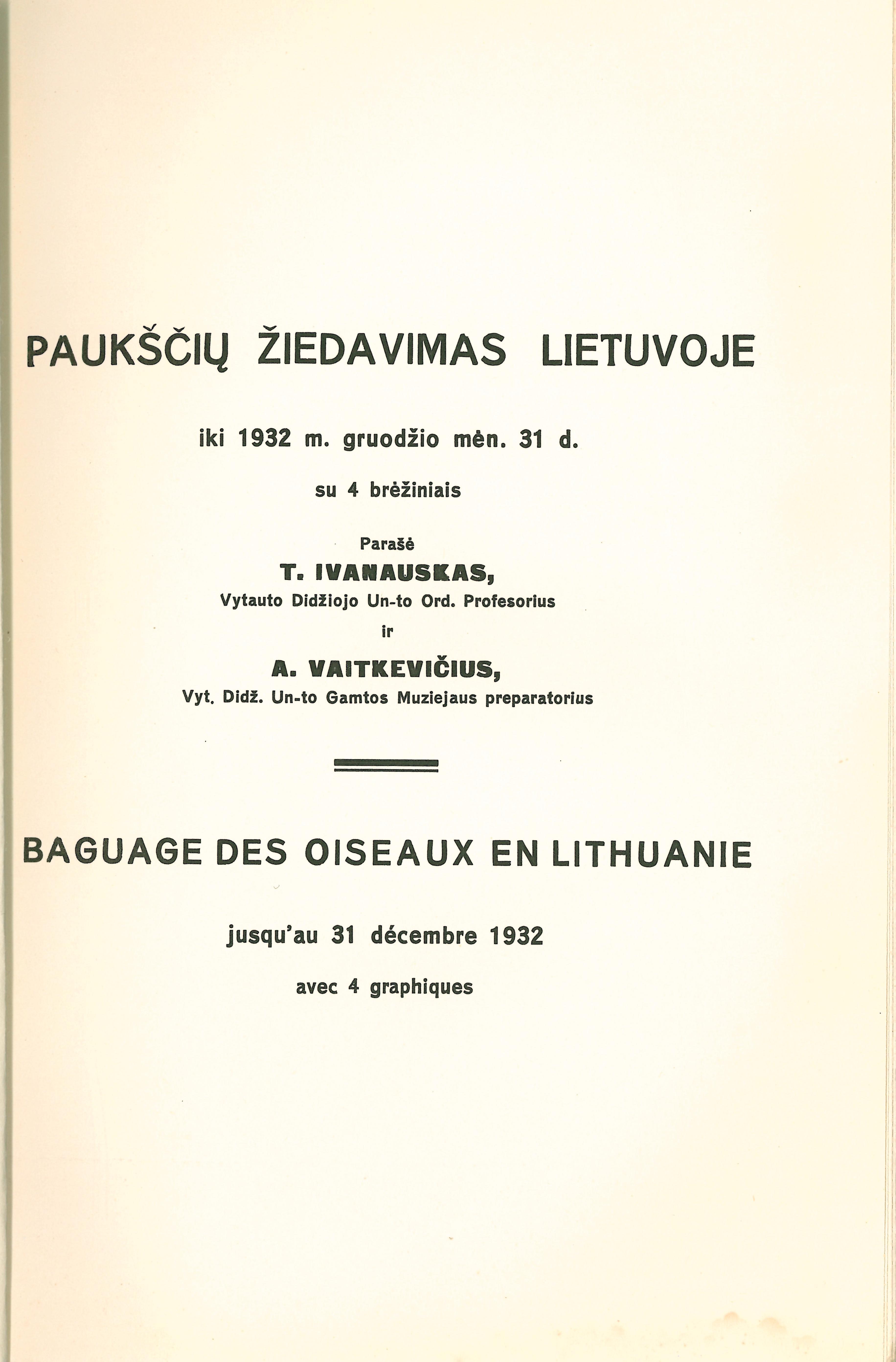 Paukščių žiedavimas Lietuvoje iki 1932 m. gruodžio mėn. 31 d. = Baguage des oiseaux en Lithuanie : su 4 brėžiniais / parašė T. Ivanauskas ir A. Vaitkevičius. – Kaunas, 1933. – 318-361 p. : žml. – Atspausdinta iš: V.D.U. Matematikos-gamtos fakulteto darbai, 1932-1933, t. 7, sąs. 3. – Gretutinis tekstas prancūzų kalba.