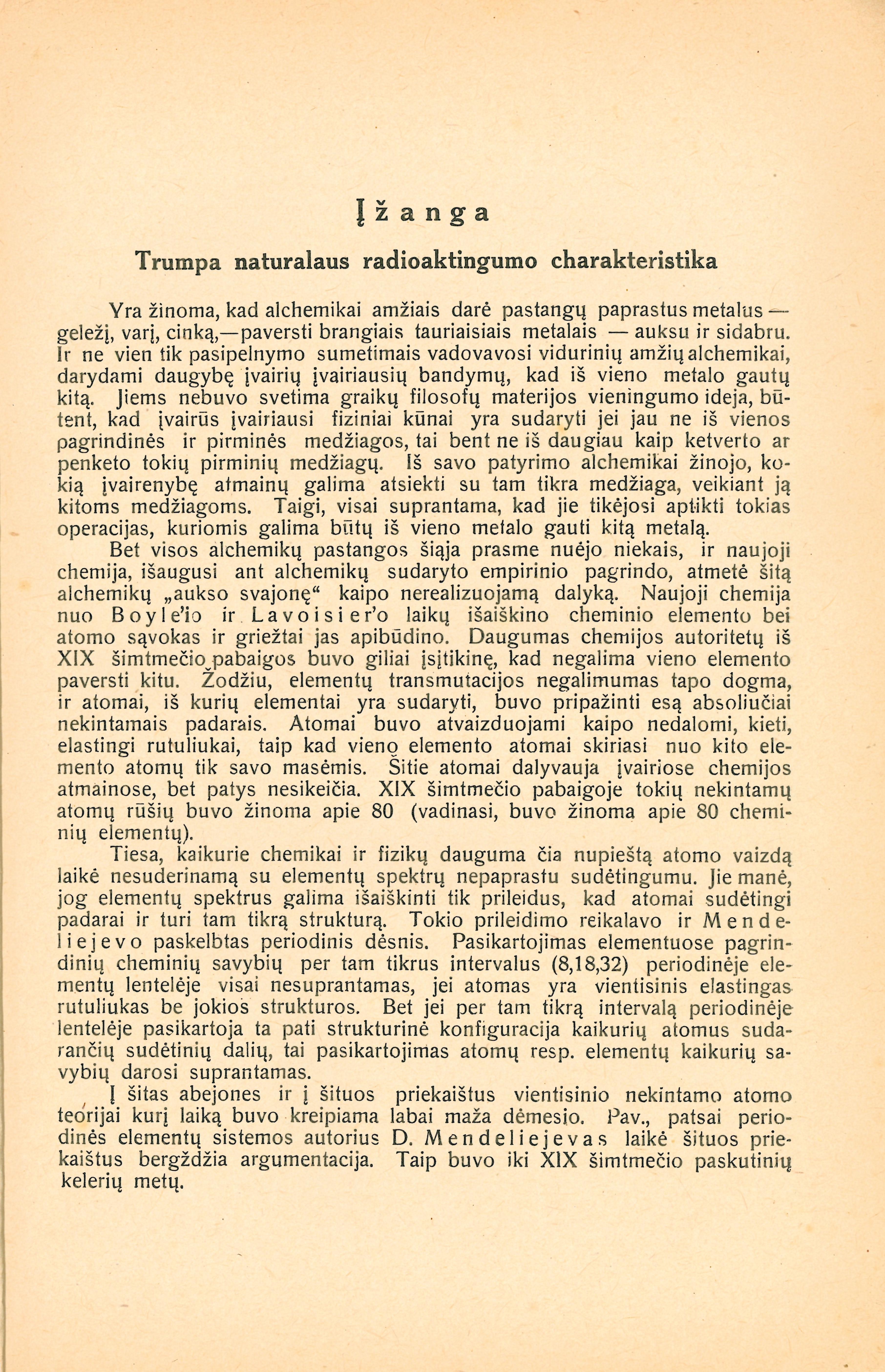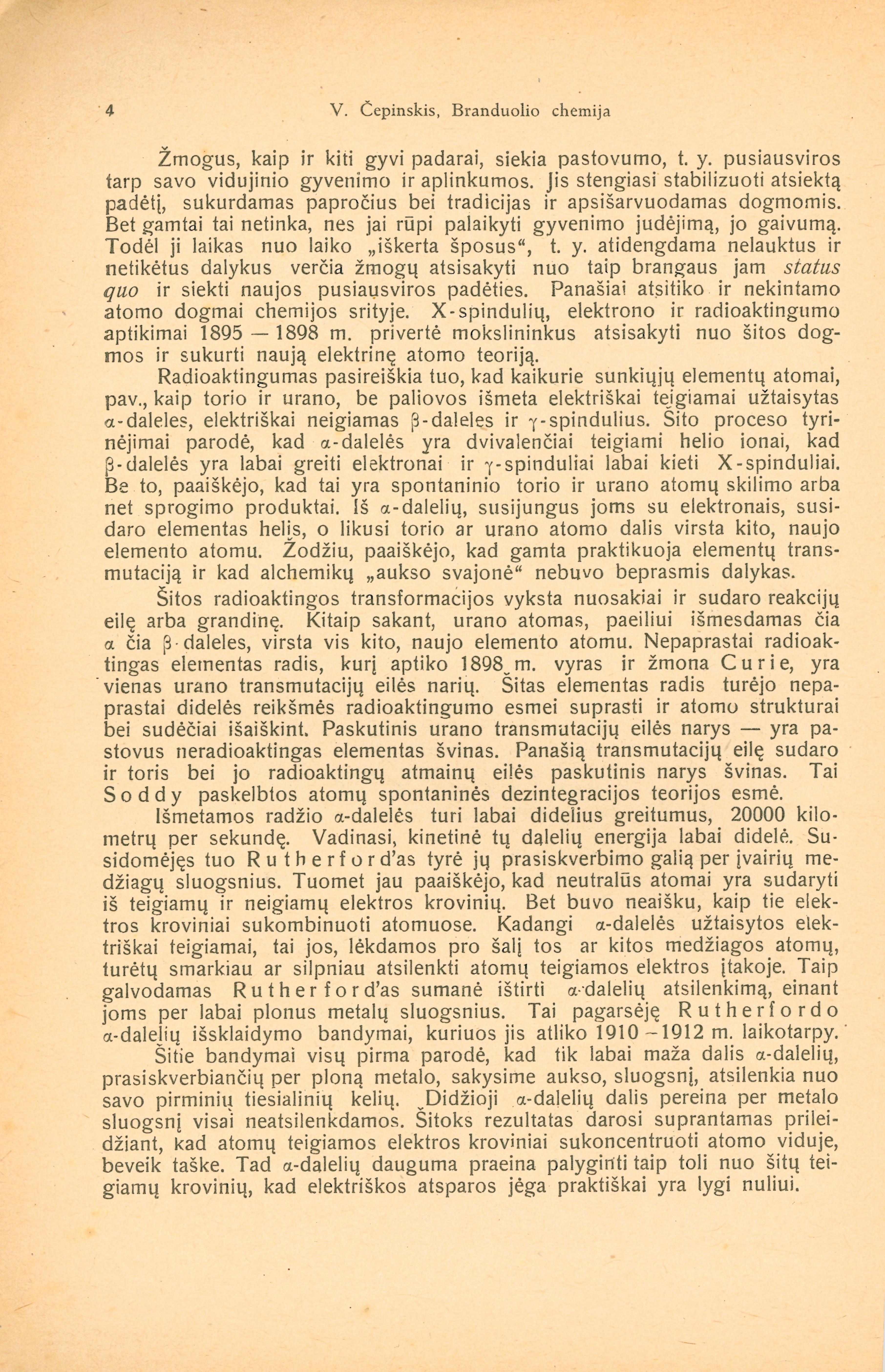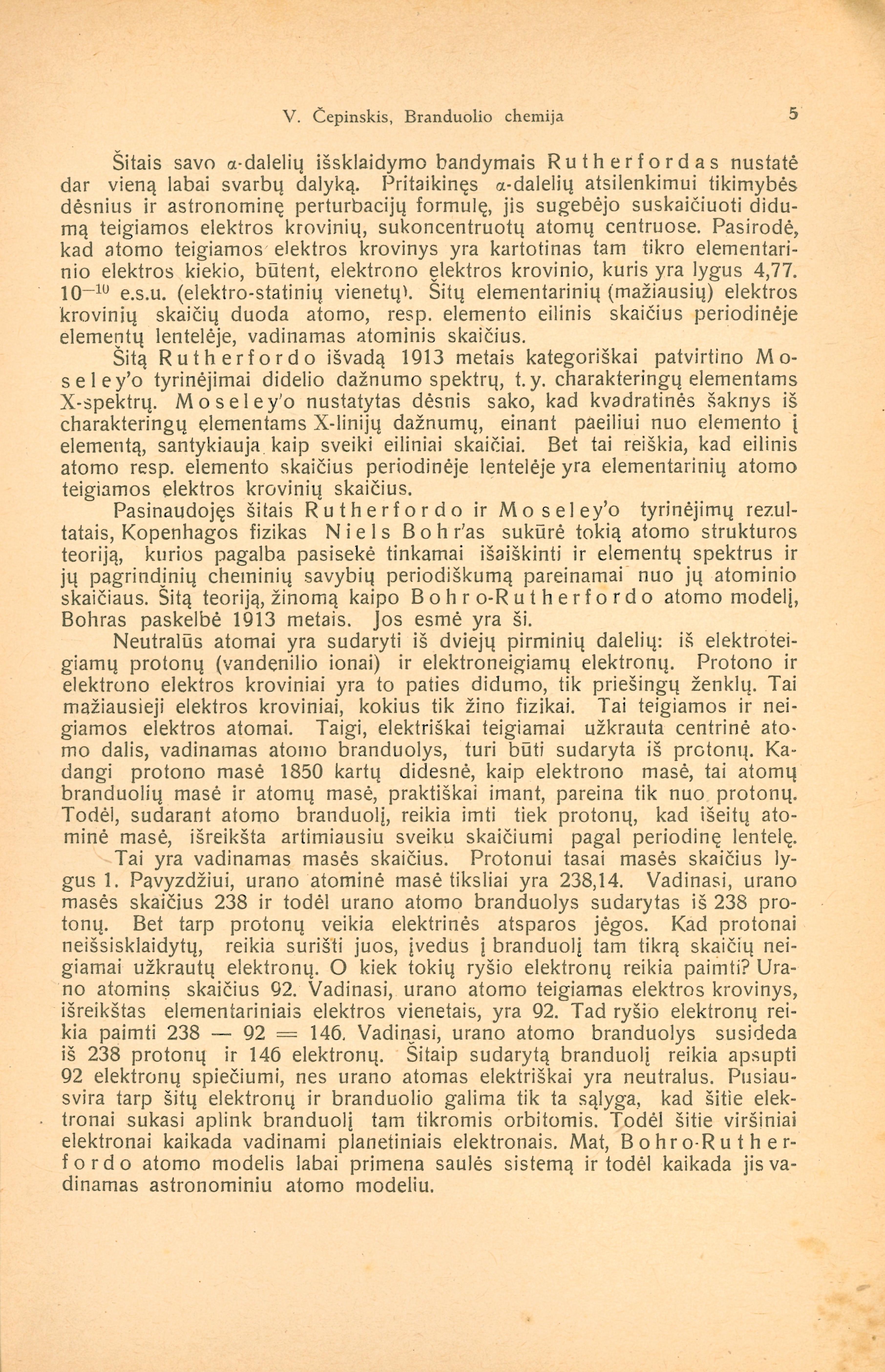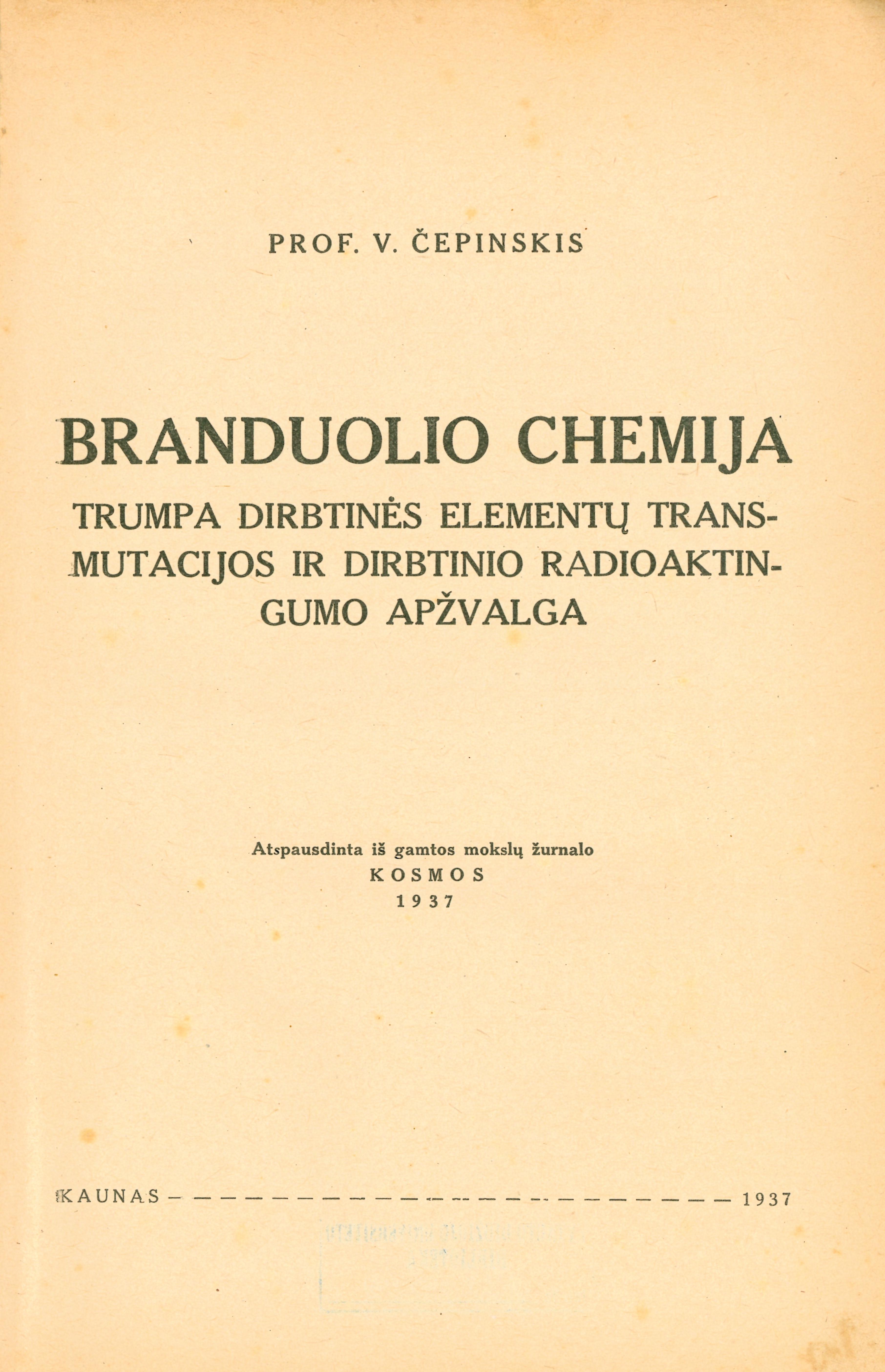 Branduolio chemija : trumpa dirbtinės elementų transmutacijos ir dirbtinio radioaktingumo apžvalga / V. Čepinskis. – Kaunas, 1937. – 52 p. : iliustracijos. – Atspausdinta iš gamtos ir gretimų mokslų žurnalo „Kosmos“, 1937.