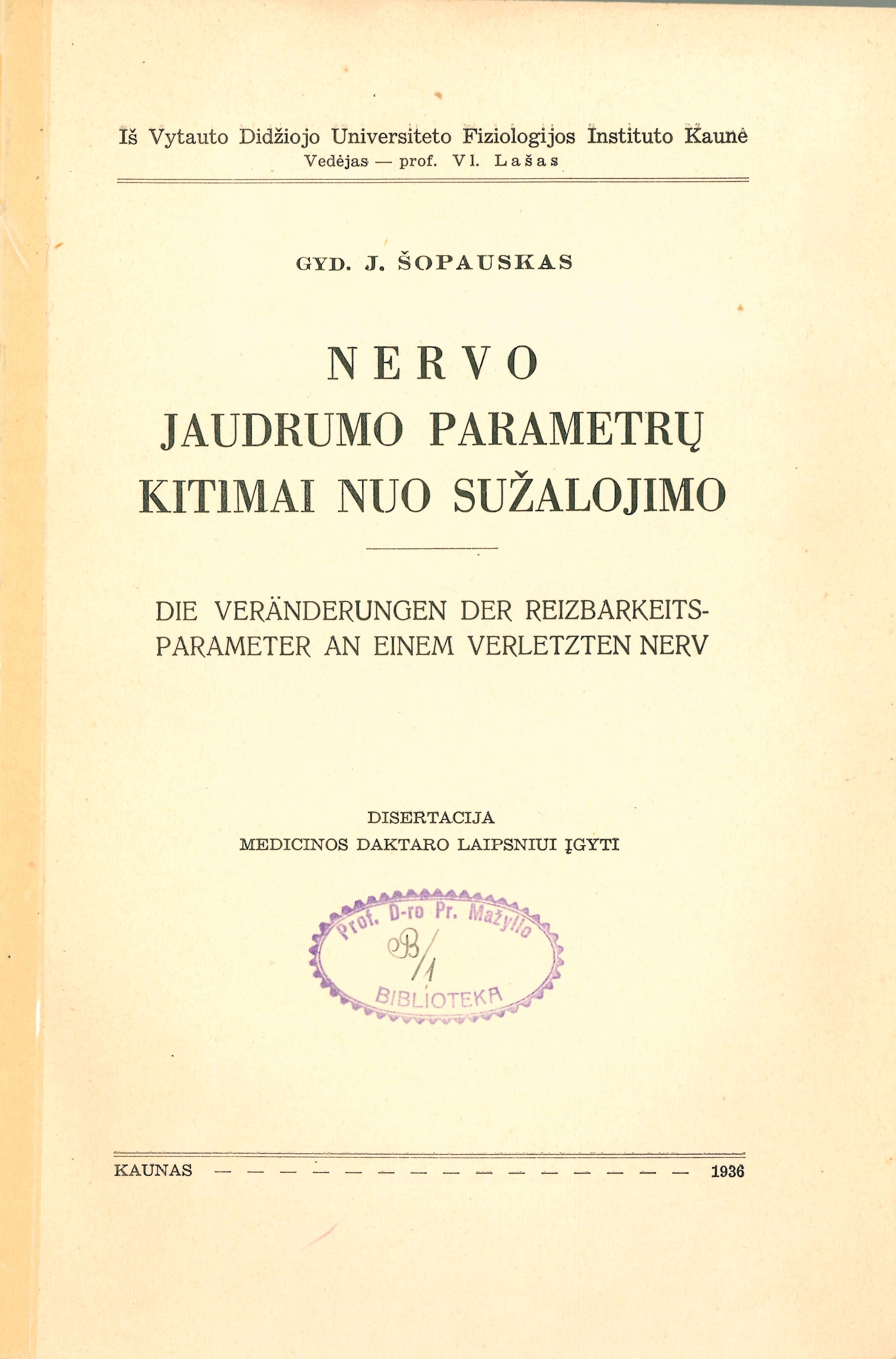 Nervo jaudrumo parametrų kitimai nuo sužalojimo : disertacija medicinos daktaro laipsniui įgyti = Die Veränderungen der Reizbarkeitsparameter an einem verletzten Nerv / J. Šopauskas. – Kaunas, 1936. – 188 p.