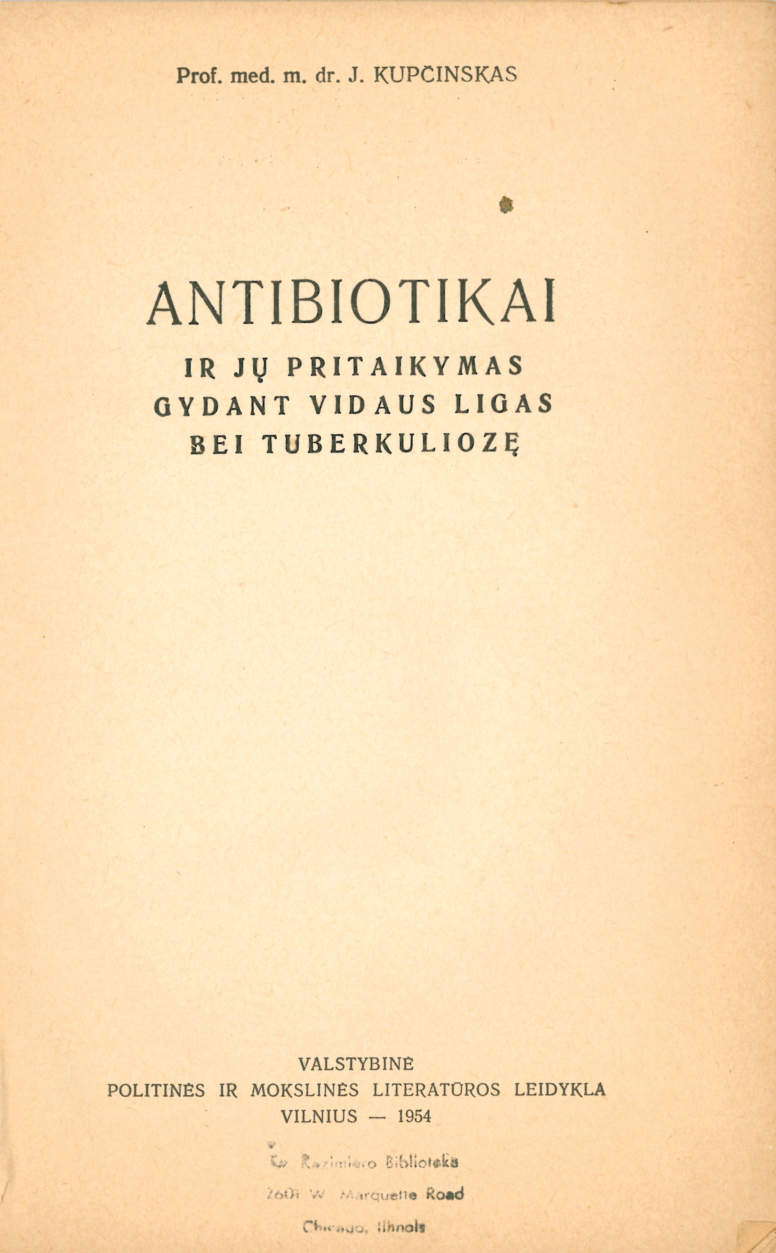 Antibiotikai ir jų pritaikymas gydant vidaus ligas bei tuberkuliozę / Juozas Kupčinskas. – Vilnius : Valstybinės politinės ir mokslinės literatūros leidykla, 1954. – 99 p.