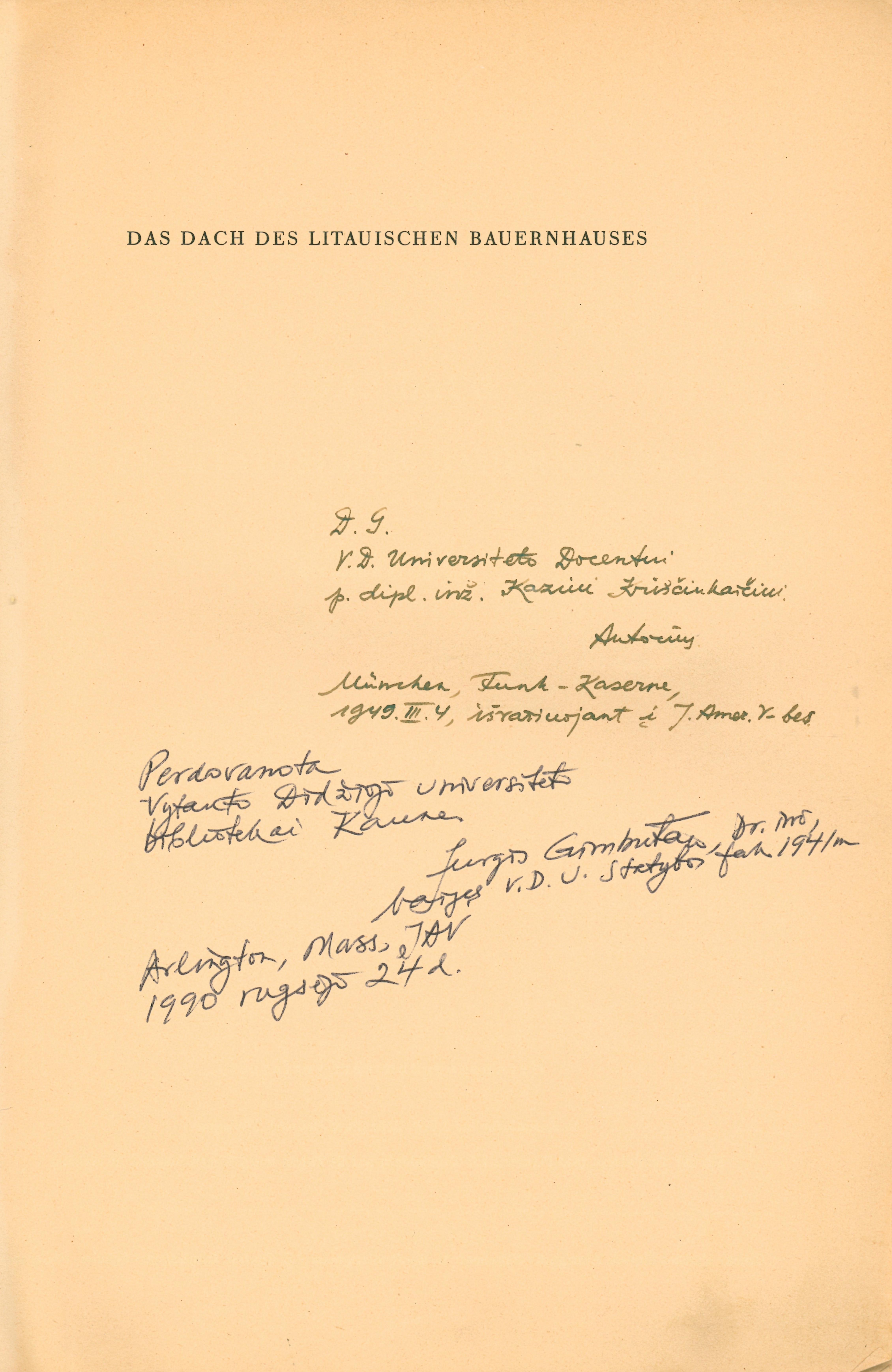 Das Dach des litauischen Bauernhauses aus dem 19. Jahrhundert : ein Beitrag zur Geschichte des Holzbaues / Jurgis Gimbutas. – Stuttgart : Der Verfasser, 1948. – 104 p., 24 iliustruoti p.