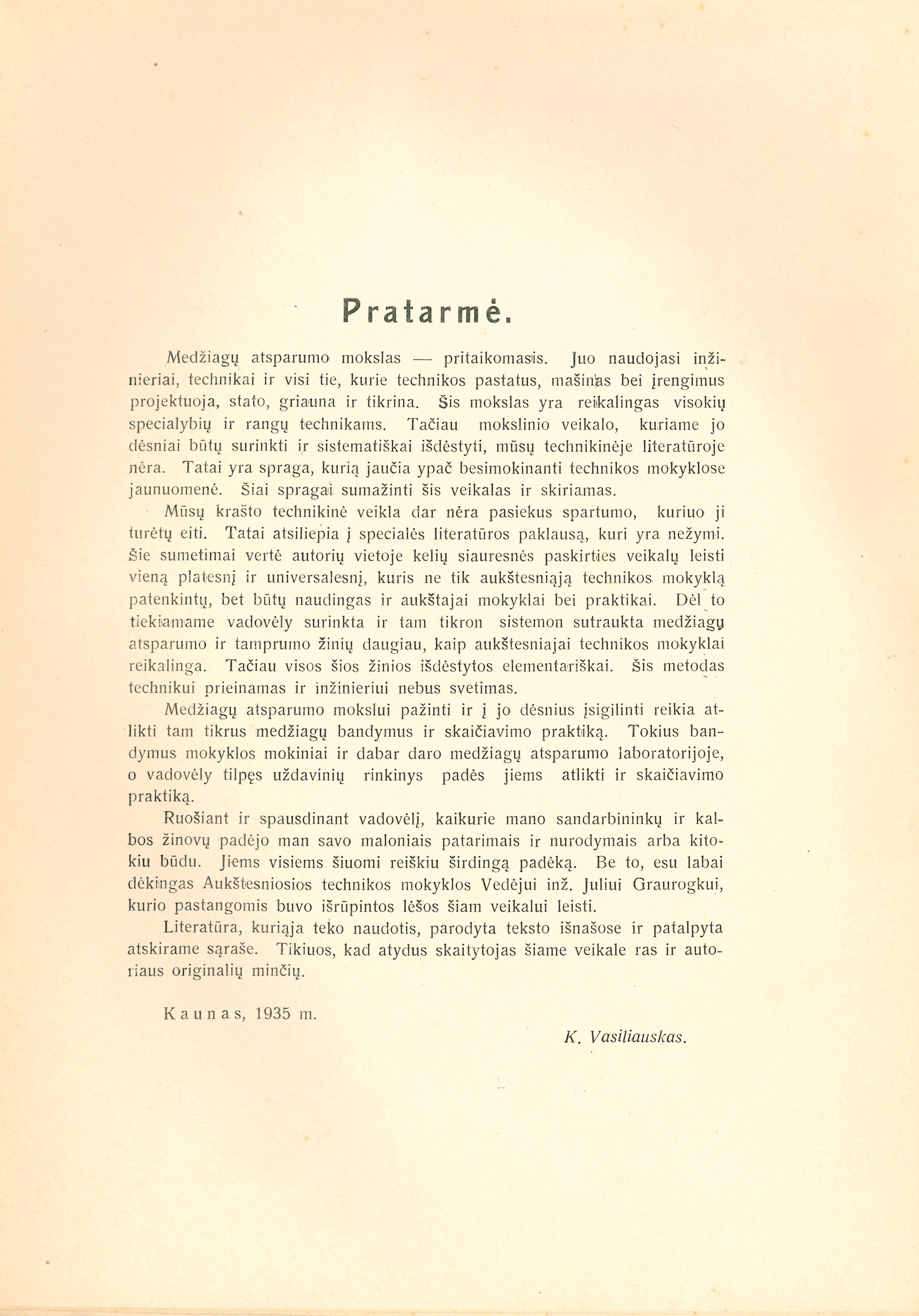 Elementarinis medžiagų atsparumo kursas : vadovėlis mokyklai ir gyvenimui ... su skaitlingais brėžiniais, lentelėmis, uždaviniais ir išspręstais pavyzdžiais / inž. Kazimieras Vasiliauskas. – Kaunas : Aukštesnioji technikos mokykla, 1935. – 476 p.