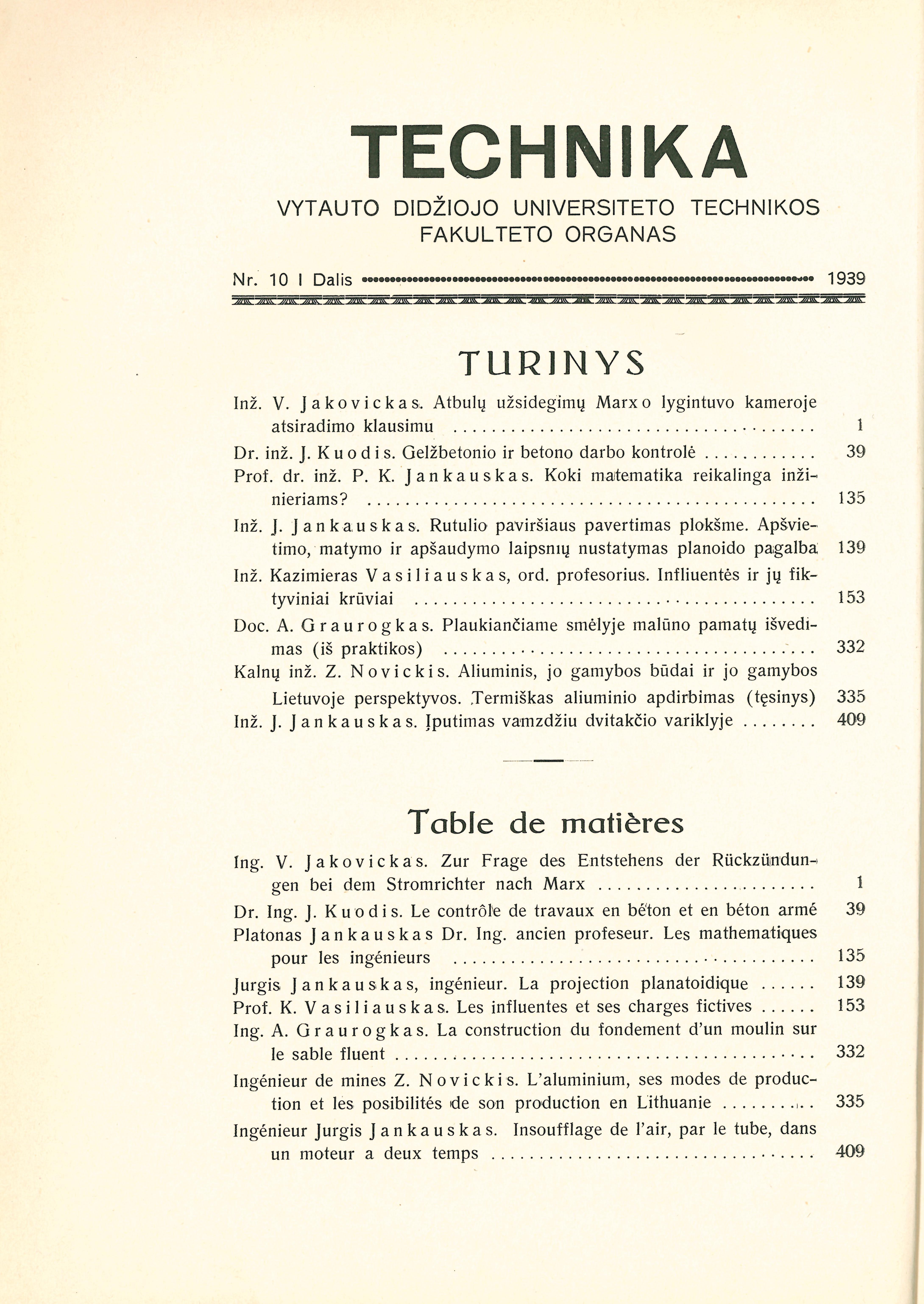 | Jakovickas Vladas. Atbulų užsidegimų Marx o lygintuvo kameroje atsiradimo klausimu (p. 1-38); Kuodis Jonas. Gelžbetonio ir betono darbo kontrolė (p. 39-134); Jankauskas Platonas. Koki matematika reikalinga inžinieriams? (p. 135-138); Jankauskas Jurgis. Rutulio paviršiaus pavertimas plokšme. Apšvietimo, matymo ir apšaudymo laipsnių nustatymas planoido pagalba (p. 139-152); Vasiliauskas Kazimieras. Infliuentės ir jų fiktyviniai krūviai (p. 153-331); Graurogkas Antanas. Plaukiančiame smėlyje malūno pamatų išvedimas (iš praktikos) (p. 332-334); Novickis Zigmas. Aliuminis, jo gamybos būdai ir jo gamybos Lietuvoje perspektyvos. D. 3 (p. 335-408); Jankauskas Jurgis. Įpūtimas vamzdžiu dvitakčio variklyje. D. 1 (p. 409-427) | |