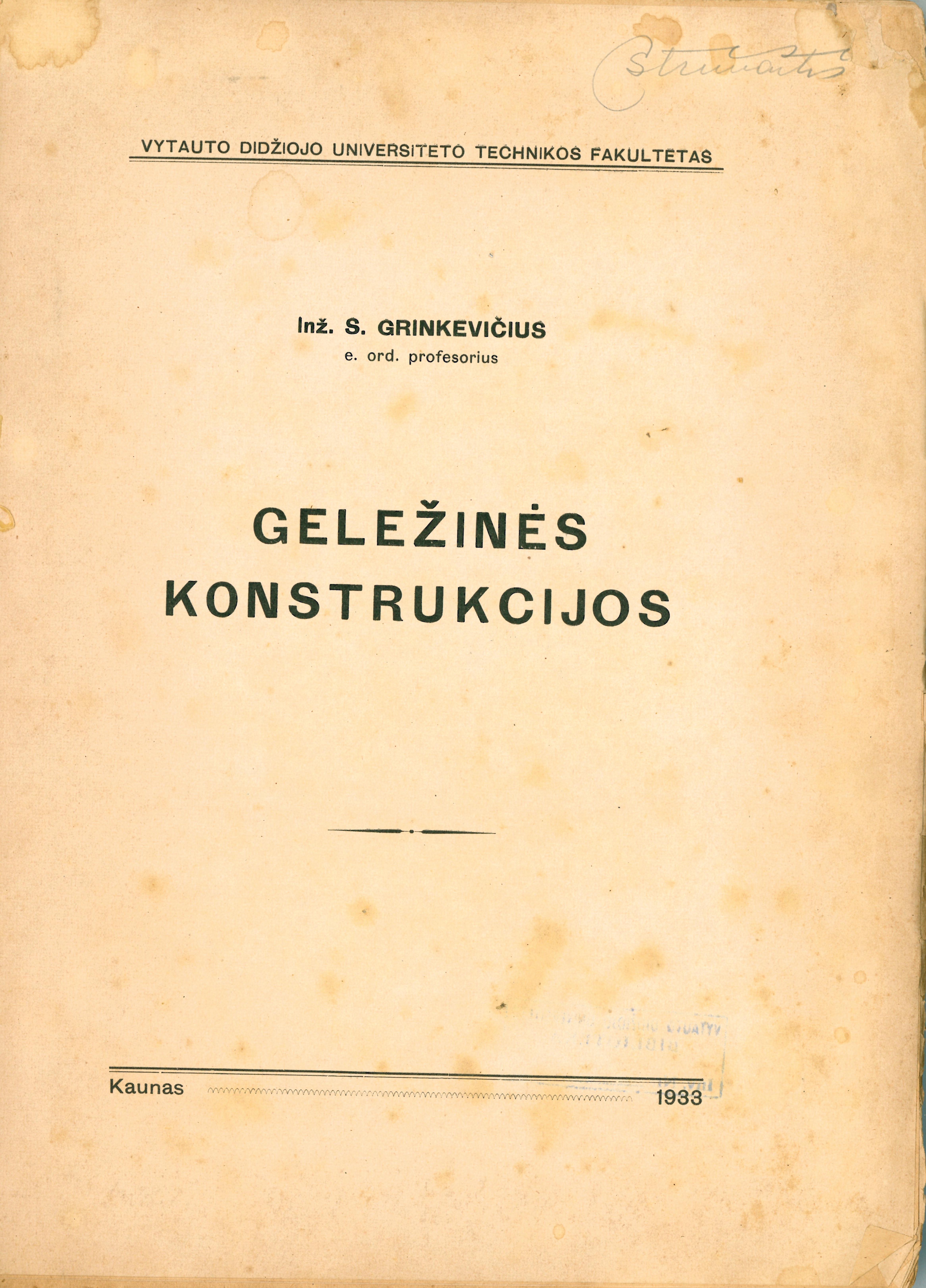 Geležinės konstrukcijos / inž. S. Grinkevičius. – Kaunas : Vytauto Didžiojo universiteto technikos fakultetas, 1933. – 226 p.