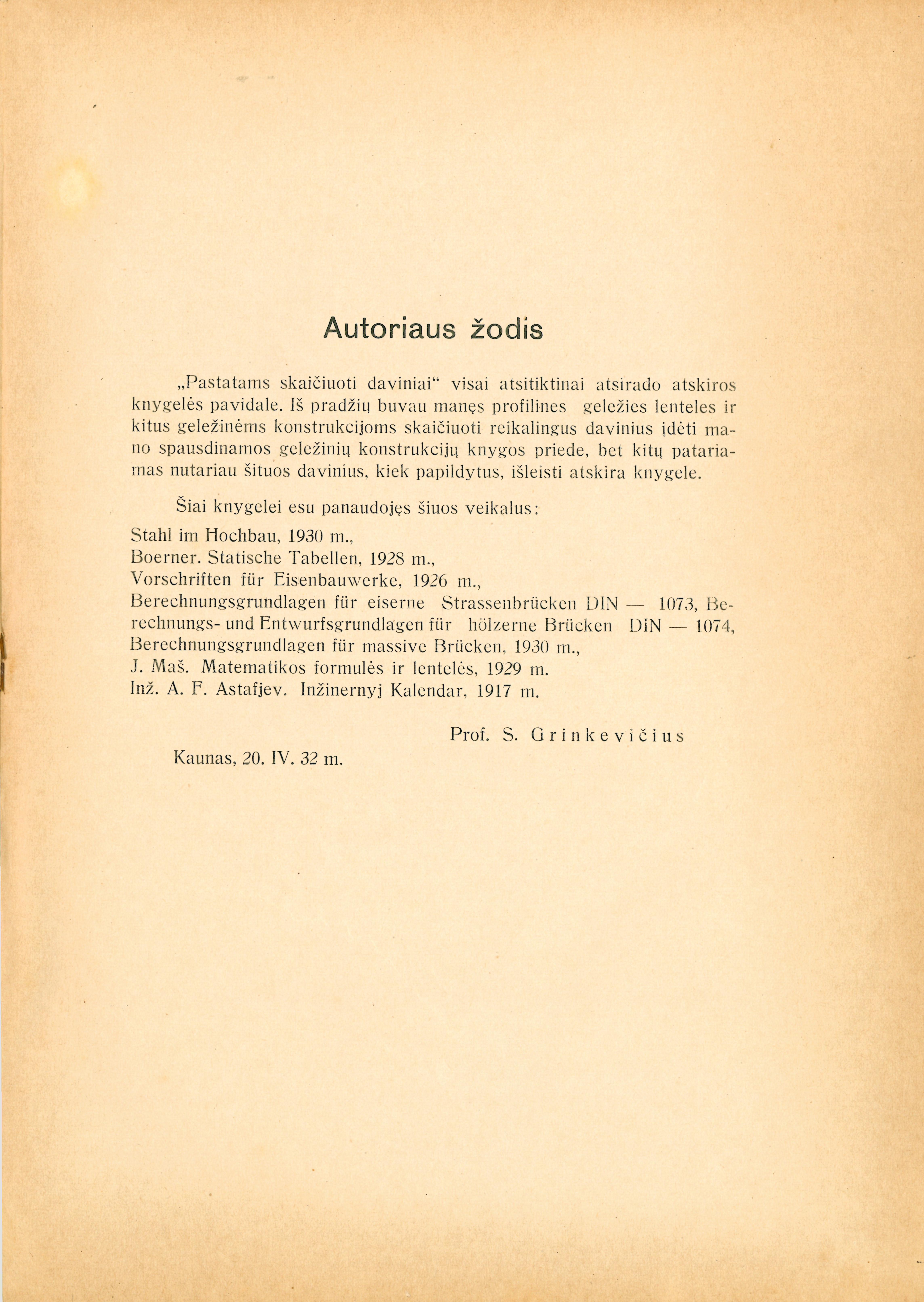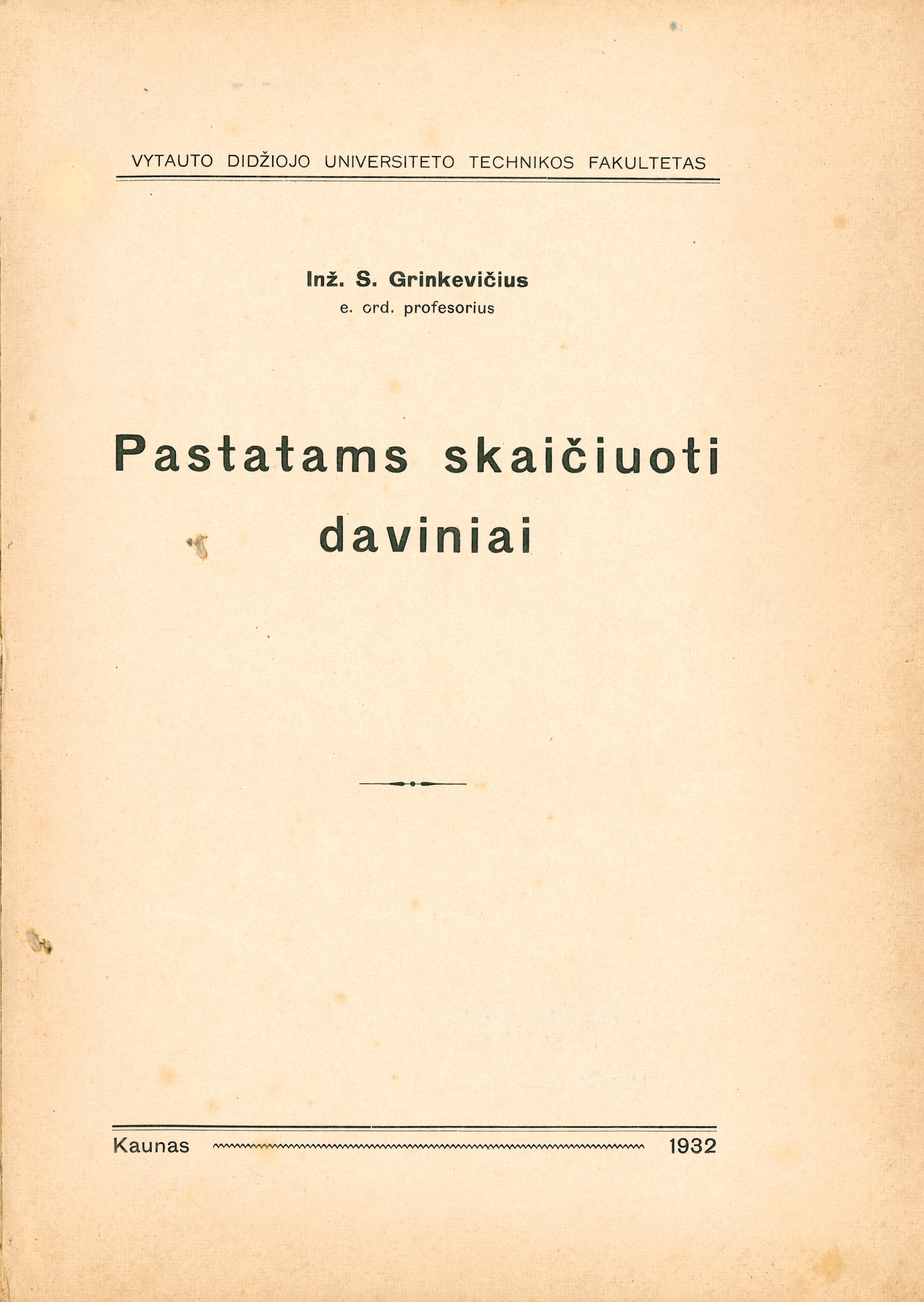 Pastatams skaičiuoti daviniai / inž. S. Grinkevičius. – Kaunas : Vytauto Didžiojo universiteto technikos fakultetas, 1932. – 188 p.