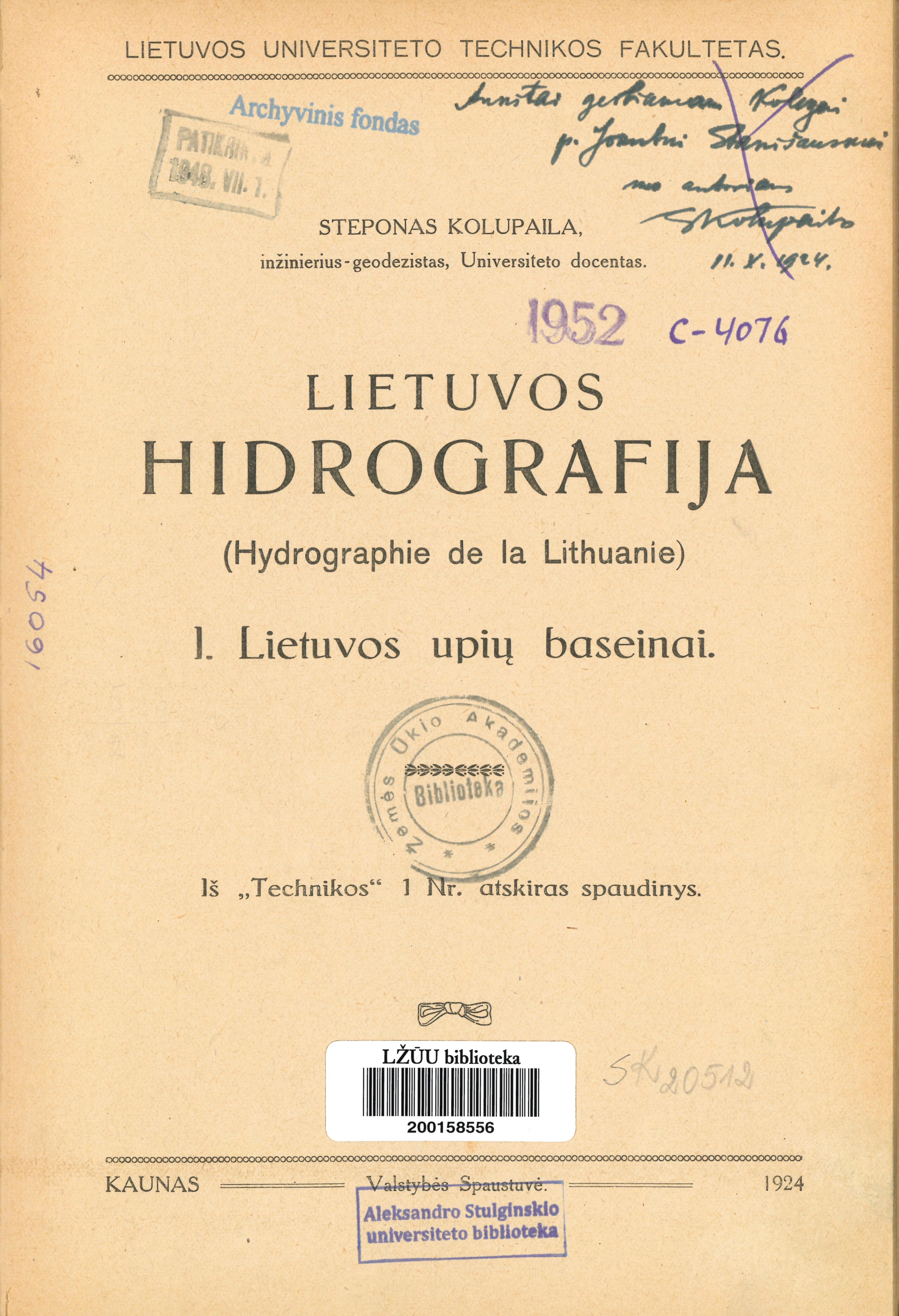 | Autorius | Steponas Kolupaila, Technikos fakultetas |