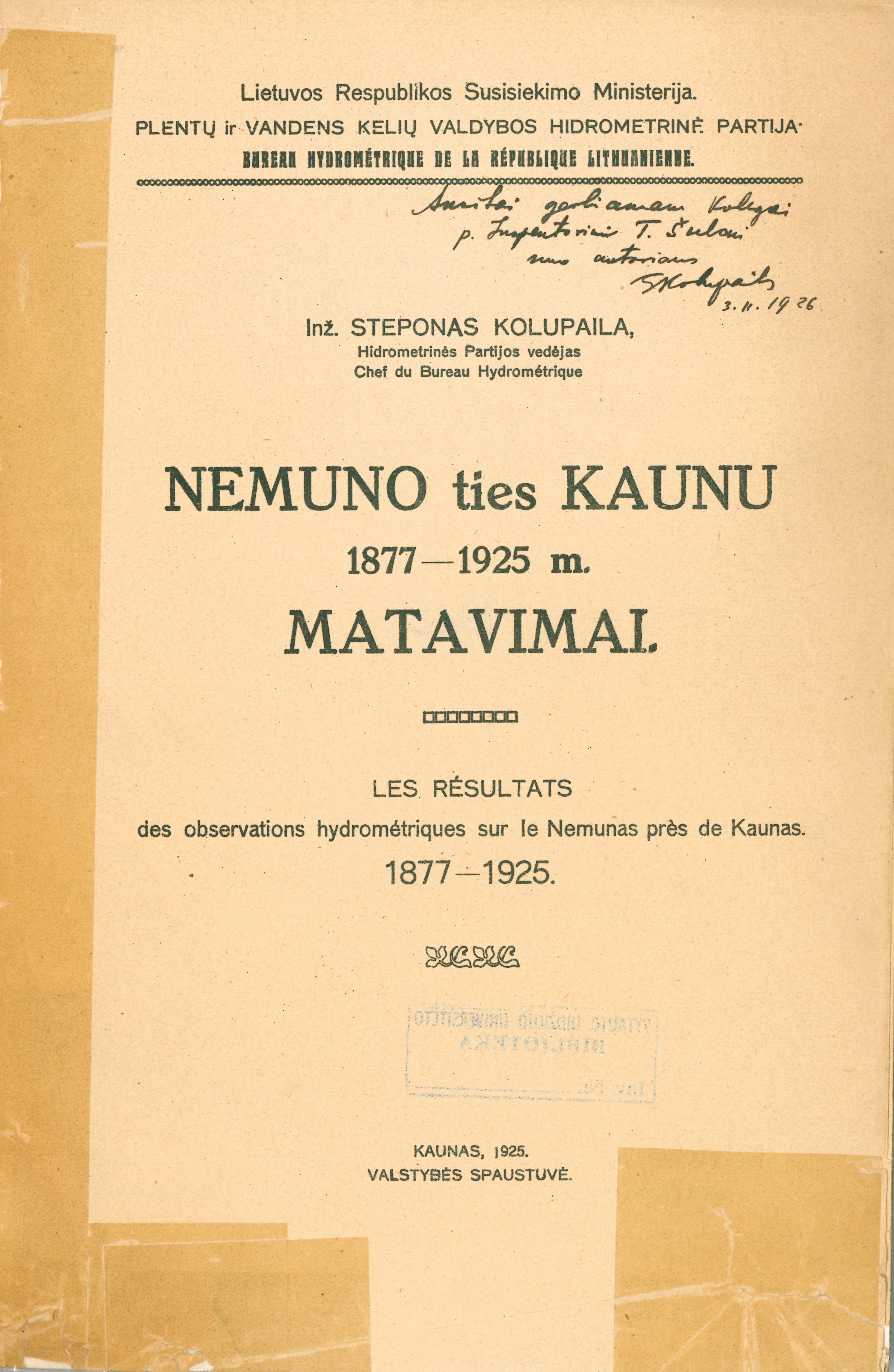 Nemuno ties Kaunu 1877-1925 m. matavimai = Les résultats des observations hydrométriques sur le Nemunas près de Kaunas 1877-1925 / inž. Steponas Kolupaila. – Kaunas, 1925. – 192 p., 4 iliustr. lap.
