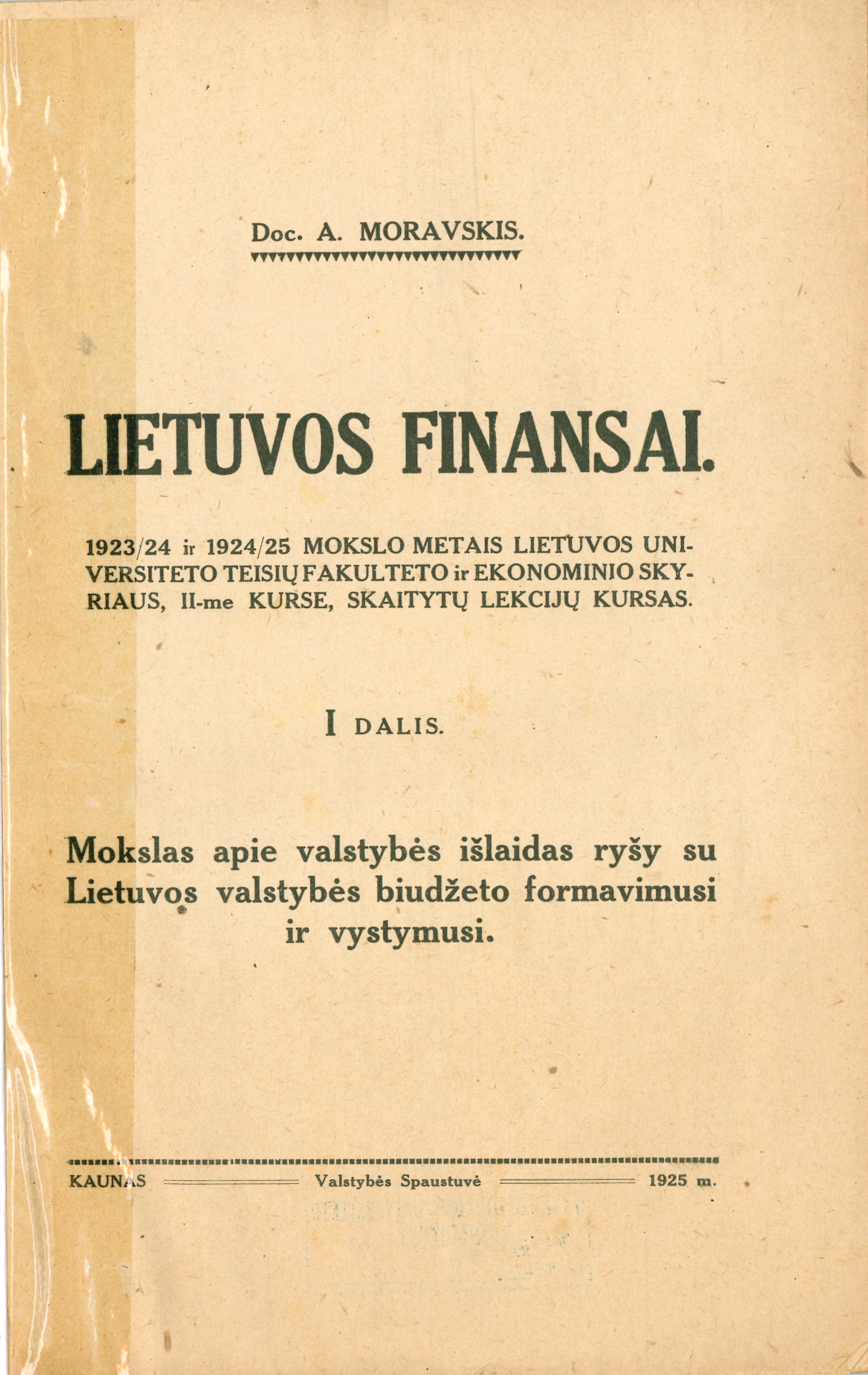 Lietuvos finansai : 1923/24 ir 1924/25 mokslo metais Lietuvos universiteto Teisių fakulteto ir Ekonomikos skyriaus, II-ame kurse, skaitytų lekcijų kursas / A. Moravskis. – Kaunas : Lietuvos universiteto Teisių fakultetas, 1925. – 2 dalys.