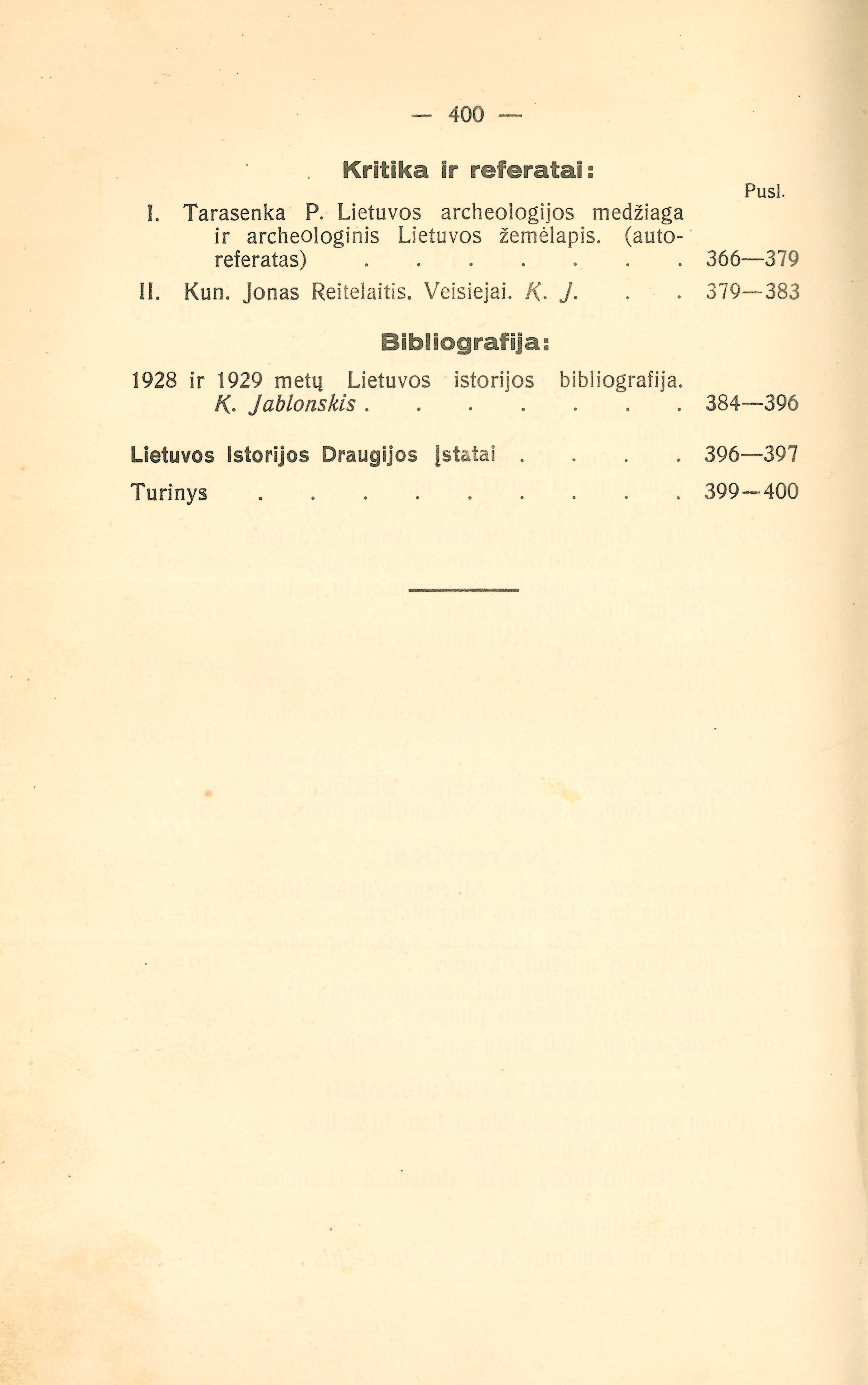 | Janulaitis Augustinas. "Praeities" uždaviniai (p. III-IV); Biržiška Vaclovas. Kryžiuočių keliai į Lietuvą XIV amž. (p. 1-63); Janulaitis Augustinas. Kęstutis Marienburgo pilyje ir jo pabėgimas iš ten (1361 m.) (p. 64-93); Lappo Jonas. Bandymas pavesti lenkui Vilniaus vyskupo katedrą XVI amžiaus pabaigoje (p. 94-138); Sakalauskas Juozas. Mokyklos ir Prūsų mokyklų politika Naujuosiuose Rytų Prūsuose (p. 139-165); Jablonskis Konstantinas. XVI amžiaus belaisviai kaimynai Lietuvoje (p. 166-213); Janulaitis Augustinas. Juodieji Broliai Kražiuose (1823 m.) (p. 214-303); Jablonskis Konstantinas. Apie vergus Didžiojoje Lietuvos Kunigaikštystėje XVI amžiaus pradžioje (p. 304-317); Matusas-Sedauskas Jonas. Albertas Vijūkas-Kojalavičius kaip Lietuvos istorininkas (p. 318-329); Jablonskis Konstantinas. Del 1408 metų Vytauto privilegijos Kauno miestui tikrumo (p. 329-339); Volteris Eduardas. Archeologiniai nesusipratimai. D. 3 (p. 339-342); Prof. Jonas Lappo. (60 metų amž. sukakus) (p. 343-346); Aktai ir dokumentai / parengė Augustinas Janulaitis (p. 347-365); Kritika ir referatai (p. 366-383); 1928 ir 1929 metų Lietuvos istorijos bibliografija / parengė Konstantinas Jablonskis (p. 384-396); Lietuvos Istorijos Draugijos Įstatai (p. 396-397) | |