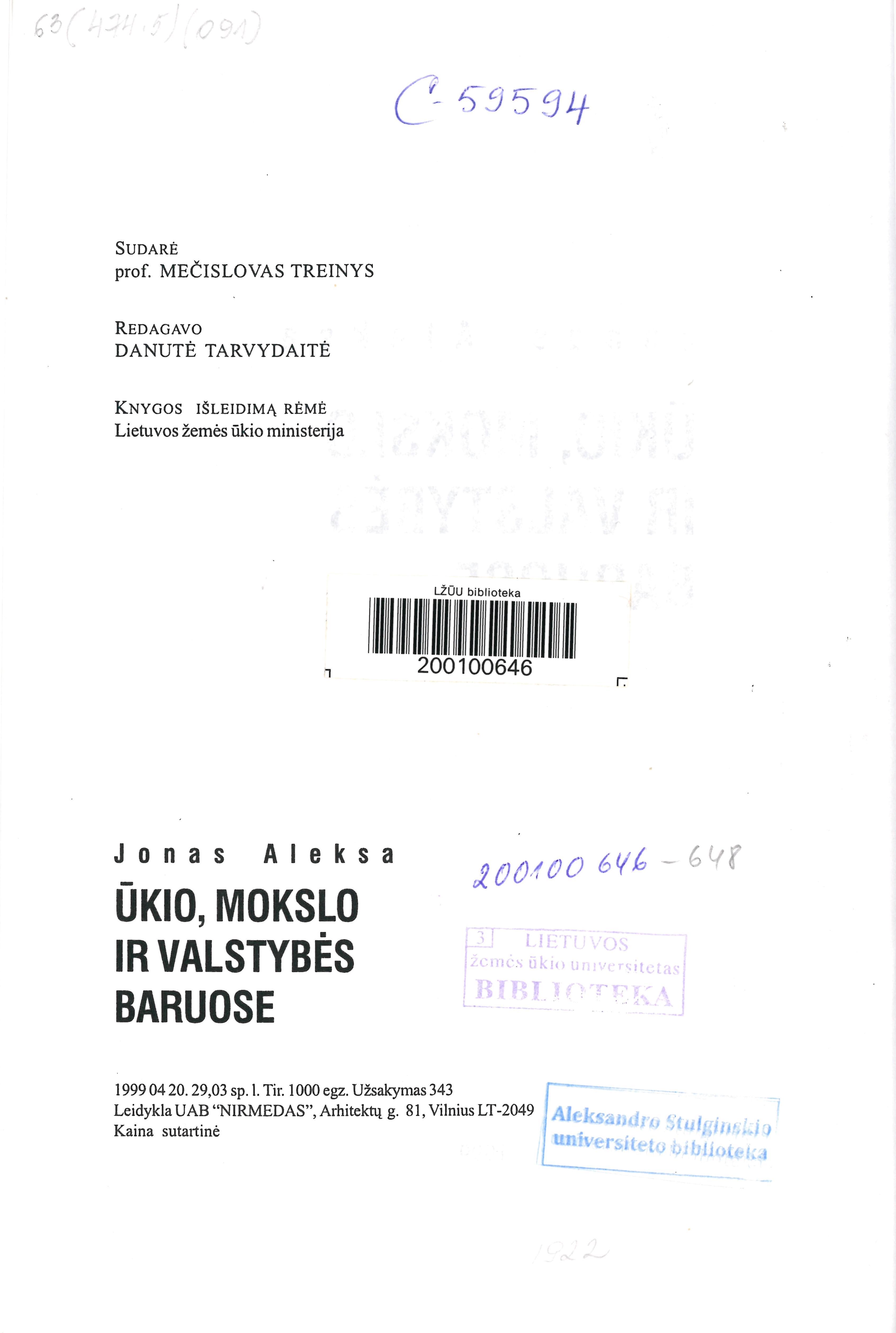 Ūkio, mokslo ir valstybės baruose / Jonas Aleksa ; sudarė Mečislovas Treinys. – Vilnius : Nirmedas, 1999. – 329 p. – Bibliogr.: p.329.