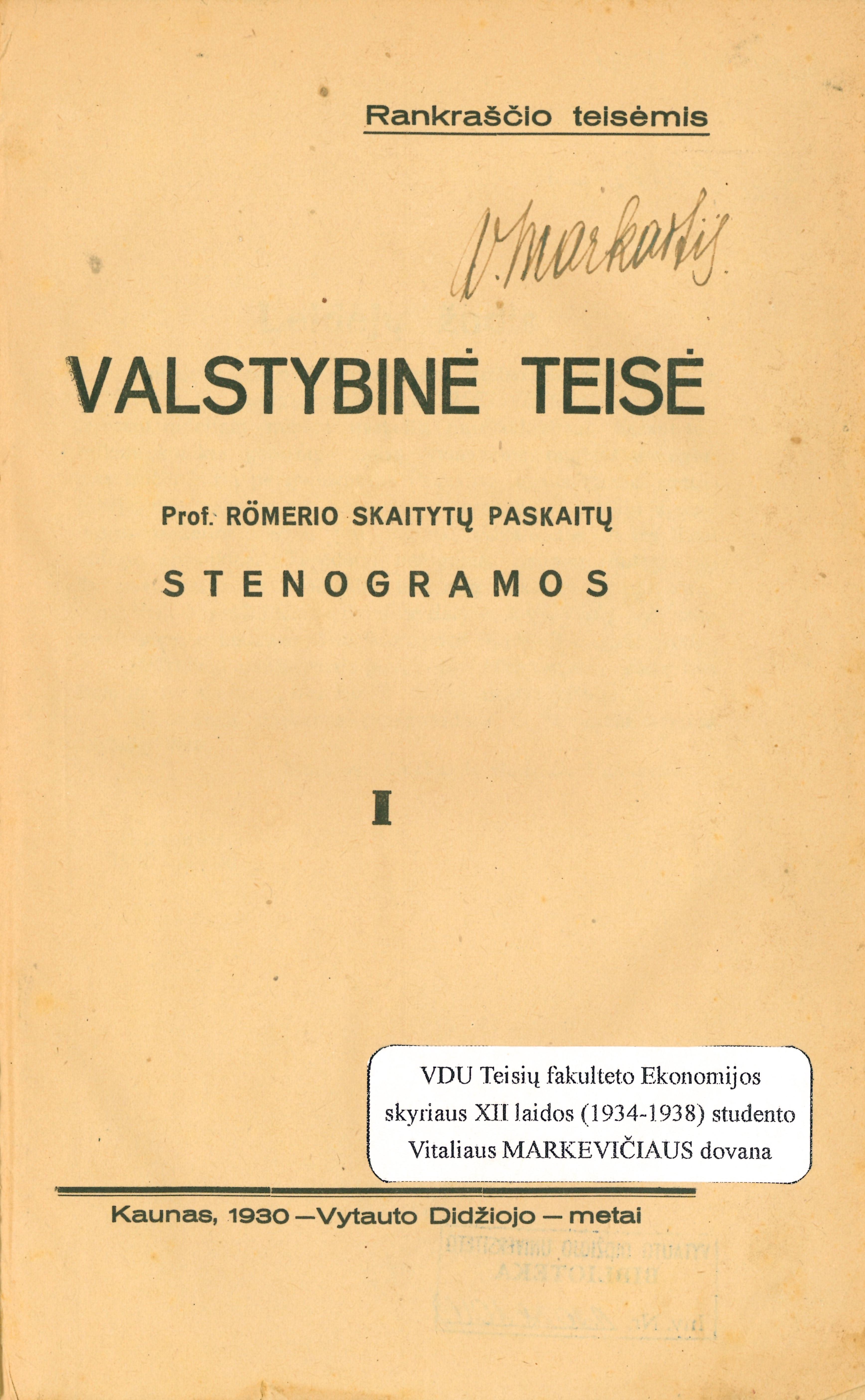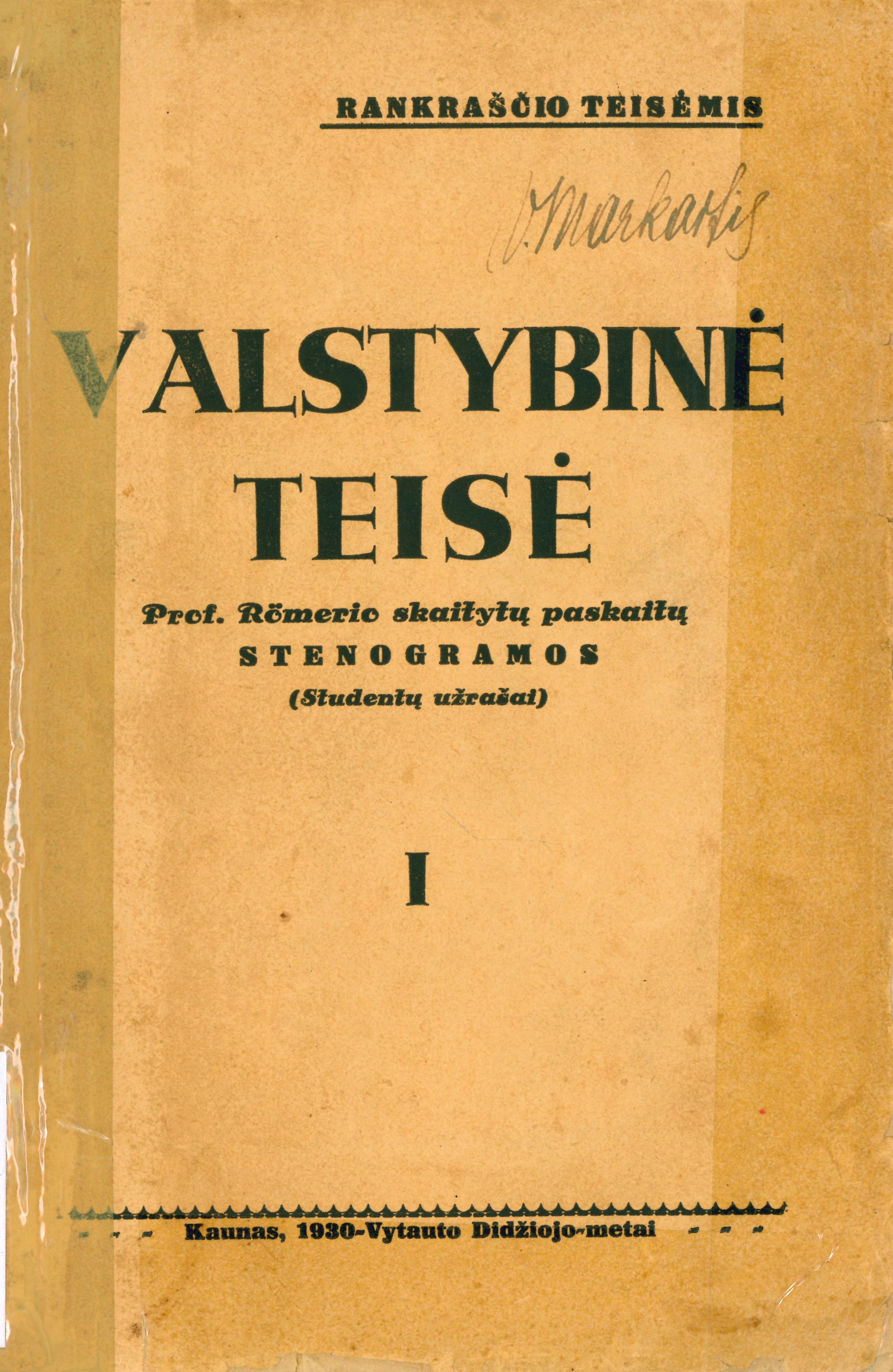 Valstybinė teisė : prof. Römerio skaitytų paskaitų stenogramos (studentų užrašai). – Kaunas, 1930. – 2 tomai. – Rankraščio teisėmis.
