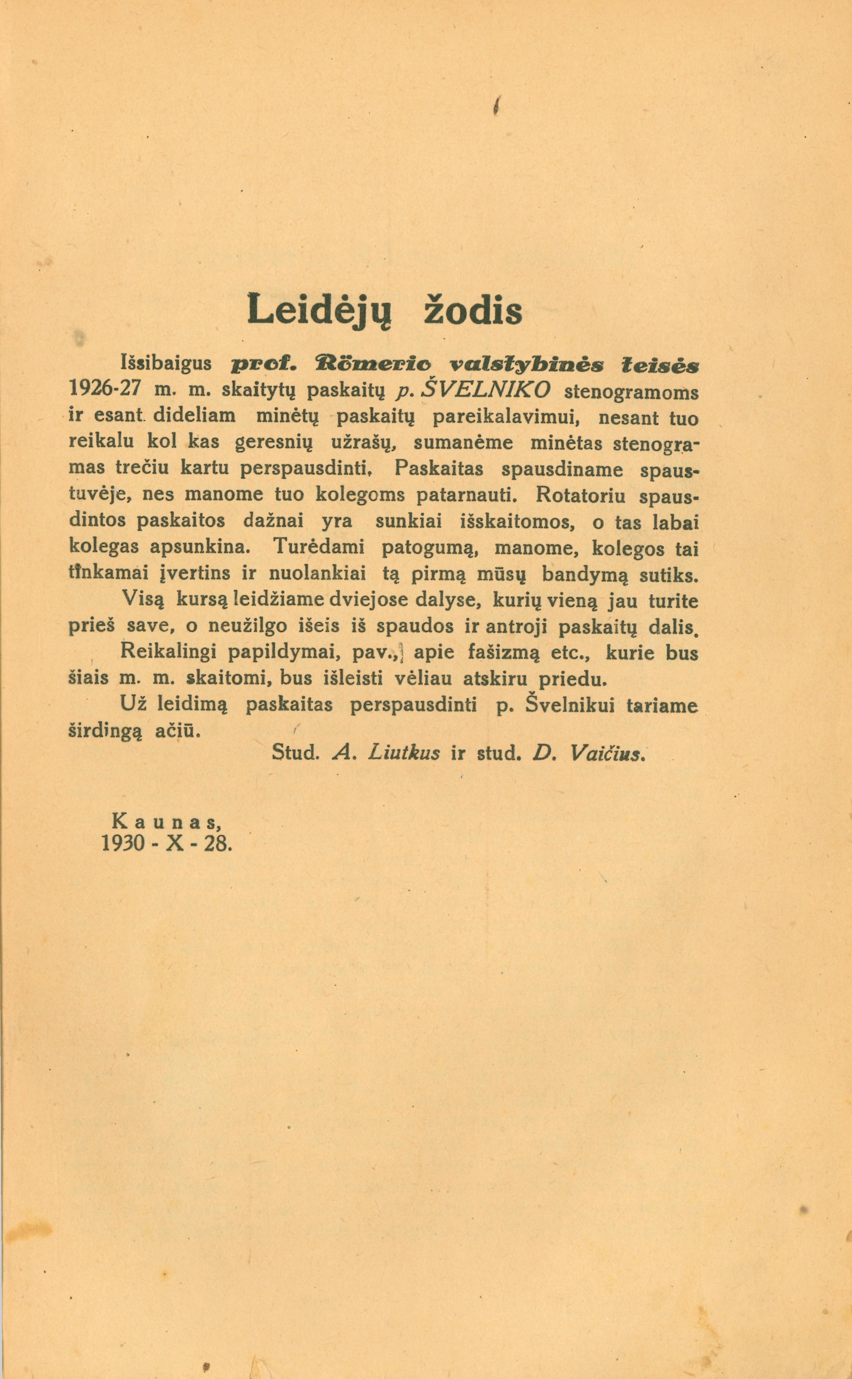 Published Kaunas: [A. Liutkus ir D. Vaičius], 1930