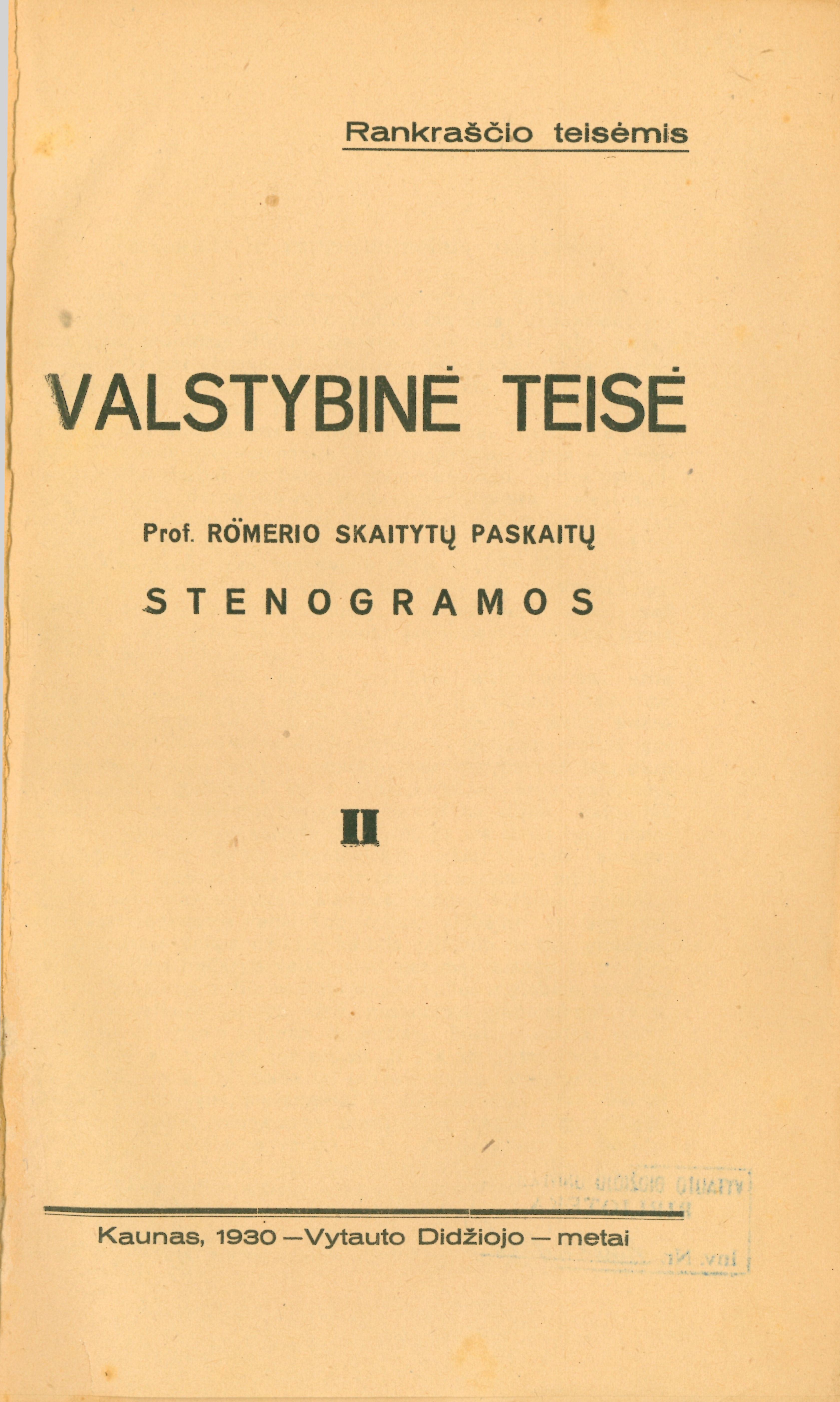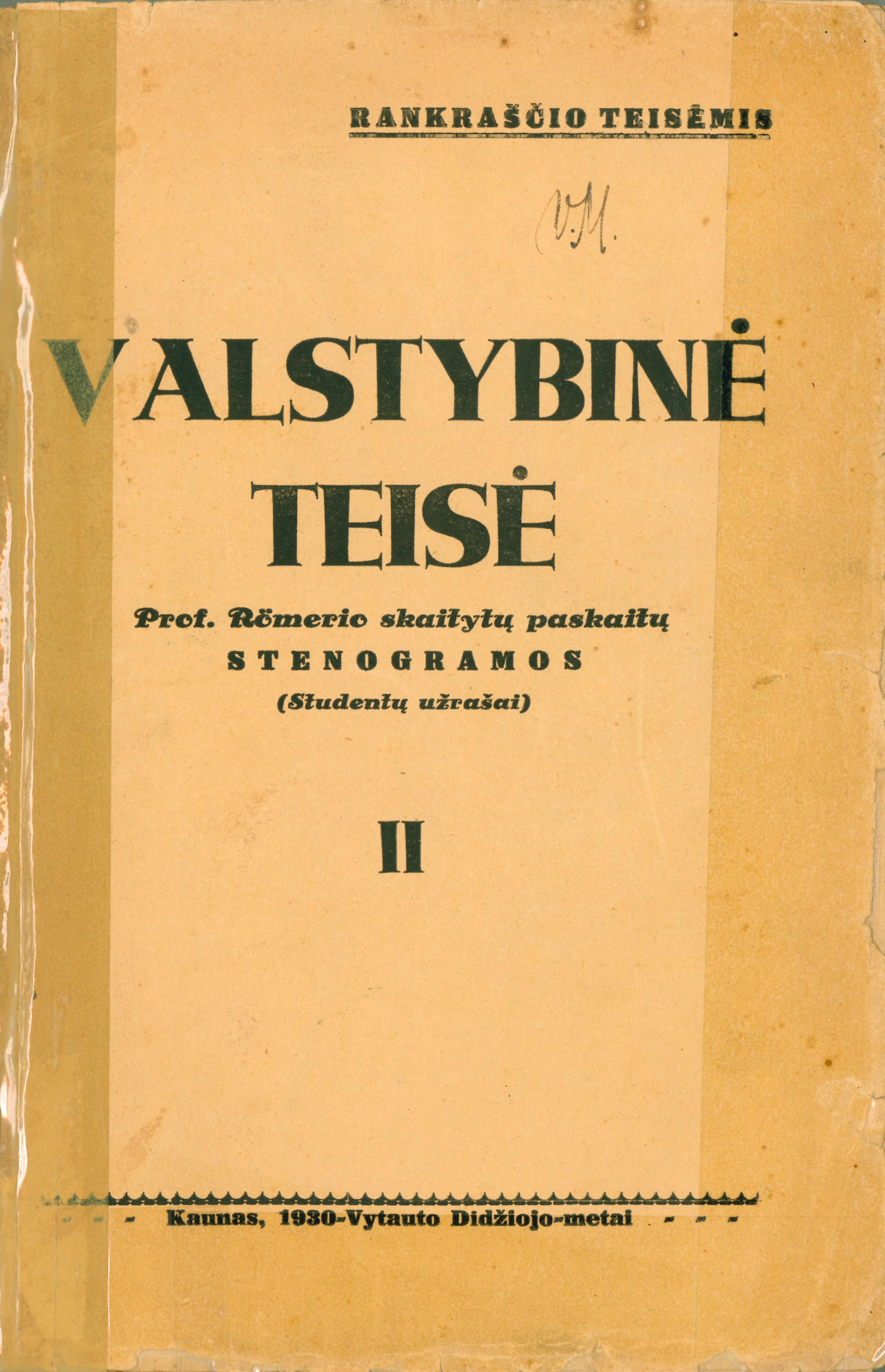 Valstybinė teisė : prof. Römerio skaitytų paskaitų stenogramos (studentų užrašai). – Kaunas, 1930. – 2 tomai. – Rankraščio teisėmis.