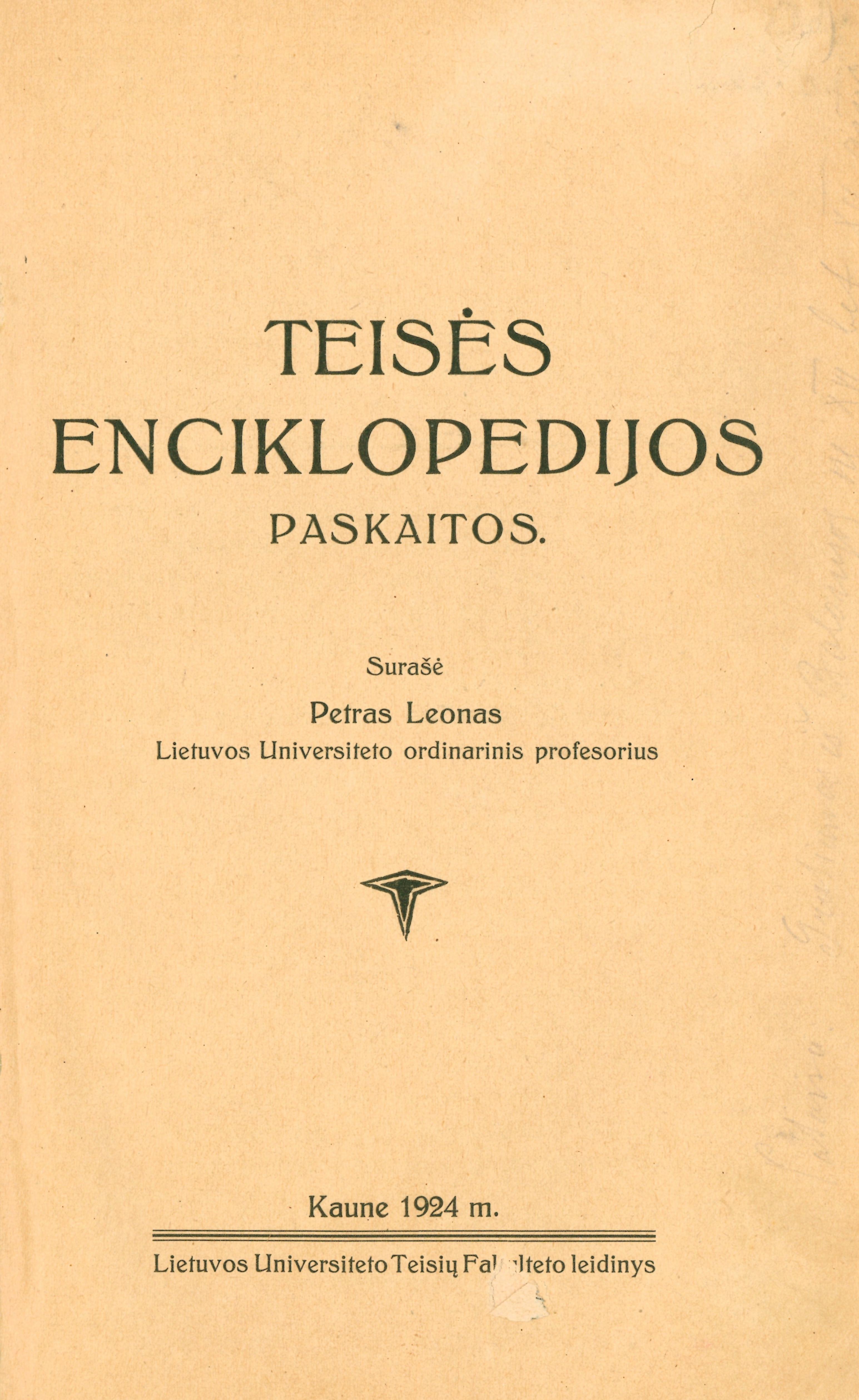 Teisės enciklopedijos paskaitos / surašė Petras Leonas. – Kaunas : Lietuvos universiteto Teisių fakultetas, 1924. – 189 p.