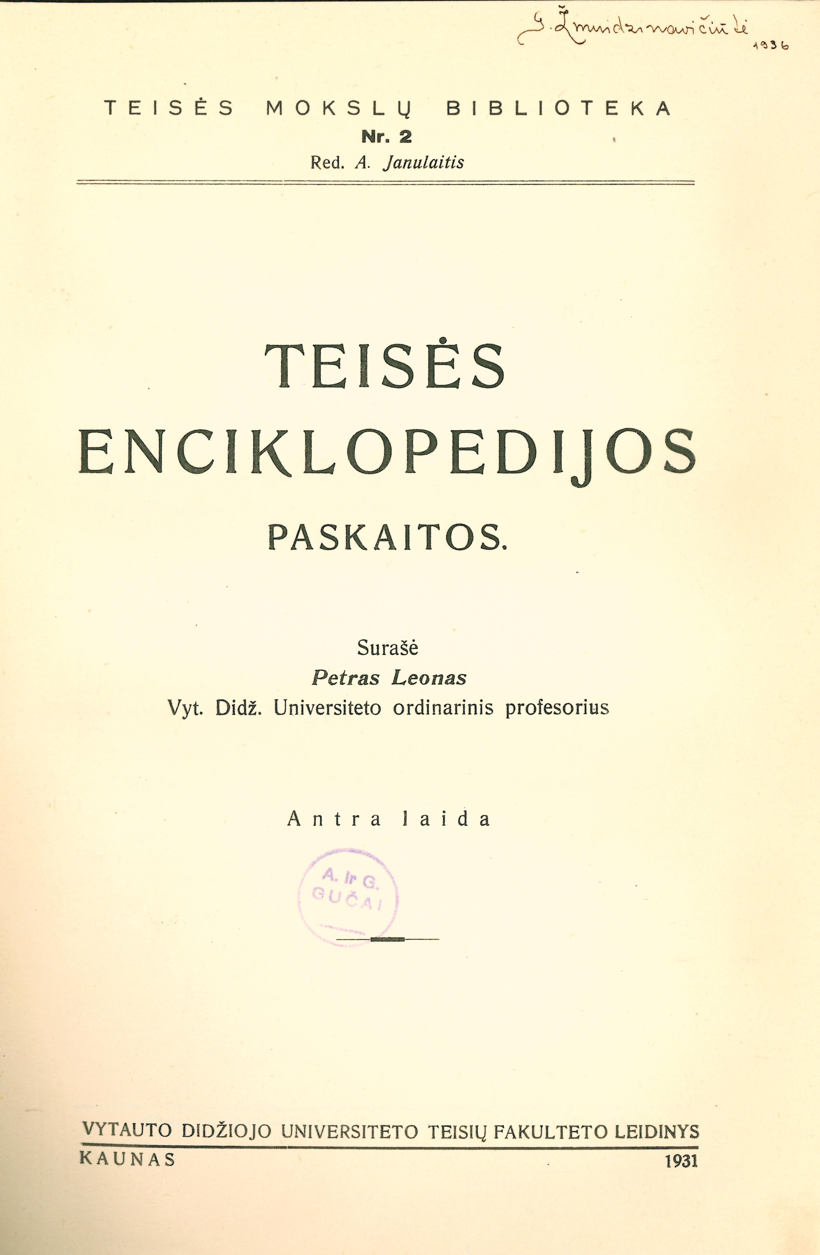 | Antraštė | Teisės enciklopedijos paskaitos (1931) |