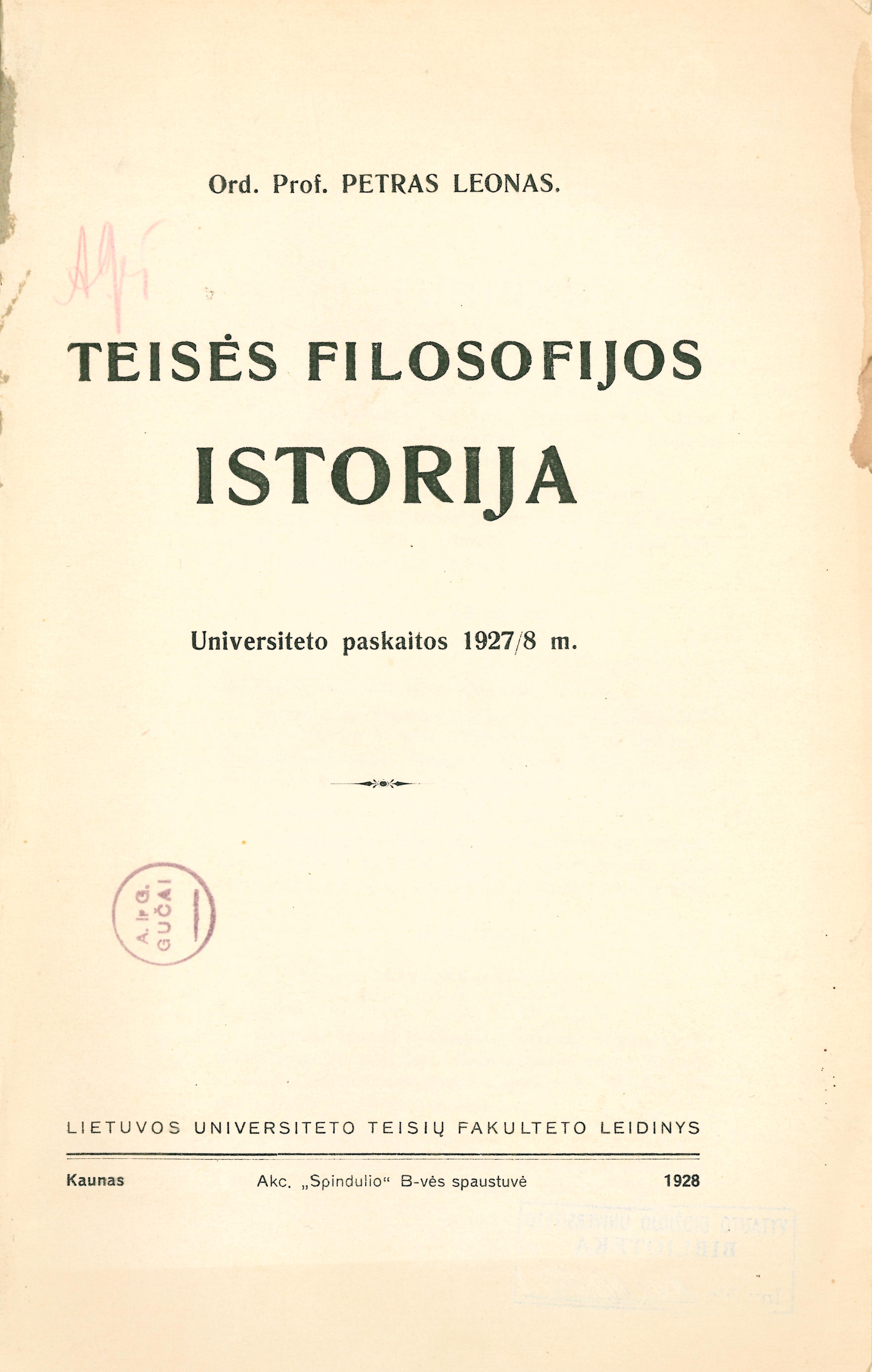 Teisės filosofijos istorija : universiteto paskaitos 1927/8 m. / Petras Leonas. – Kaunas : Lietuvos universiteto Teisių fakultetas, 1928. – VIII, 429 p.