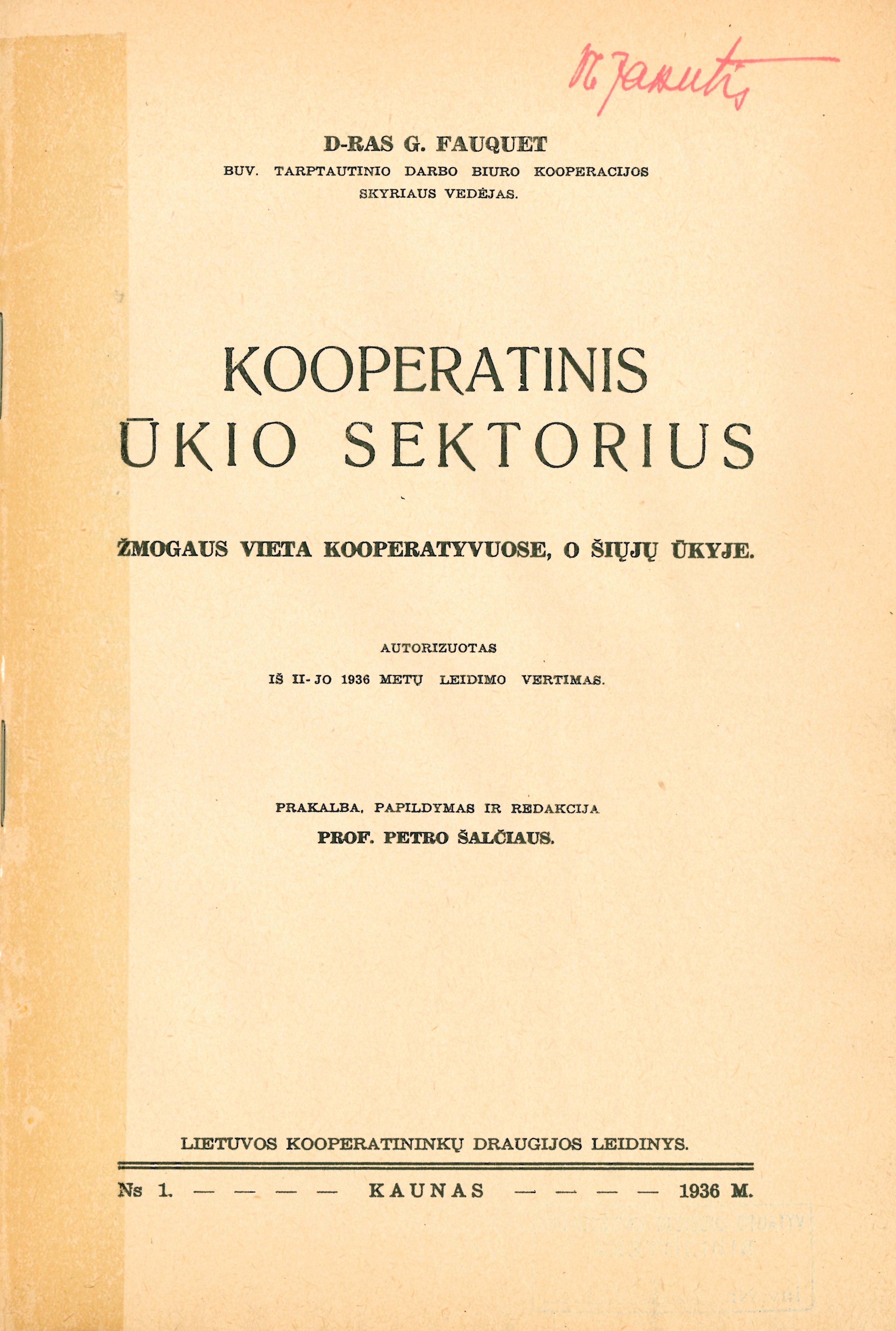 Kooperatinis ūkio sektorius : žmogaus vieta kooperatyvuose, o šiųjų ūkyje : autorizuotas iš II-ojo 1936 metų leidimo vertimas / G. Fauquet ; prakalba, papildymas ir redakcija Petro Šalčiaus. – Kaunas : Lietuvos kooperatininkų draugija, 1936. – 48 p.
