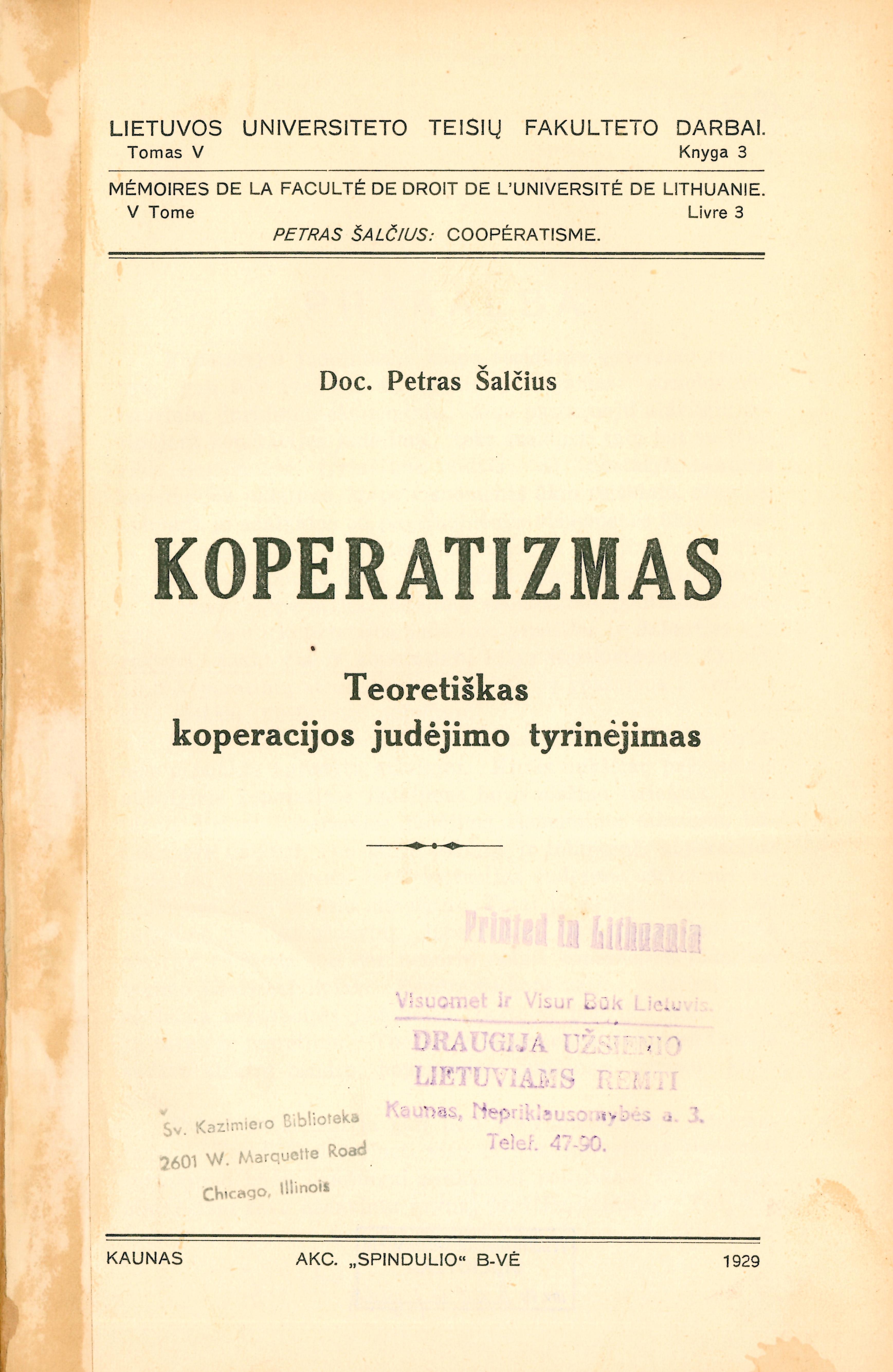 Koperatizmas : teoretiškas koperacijos judėjimo tyrinėjimas / Petras Šalčius. – Kaunas, 1929. – 135 p. – (Lietuvos universiteto Teisių fakulteto darbai ; T. 5, Kn. 3)
