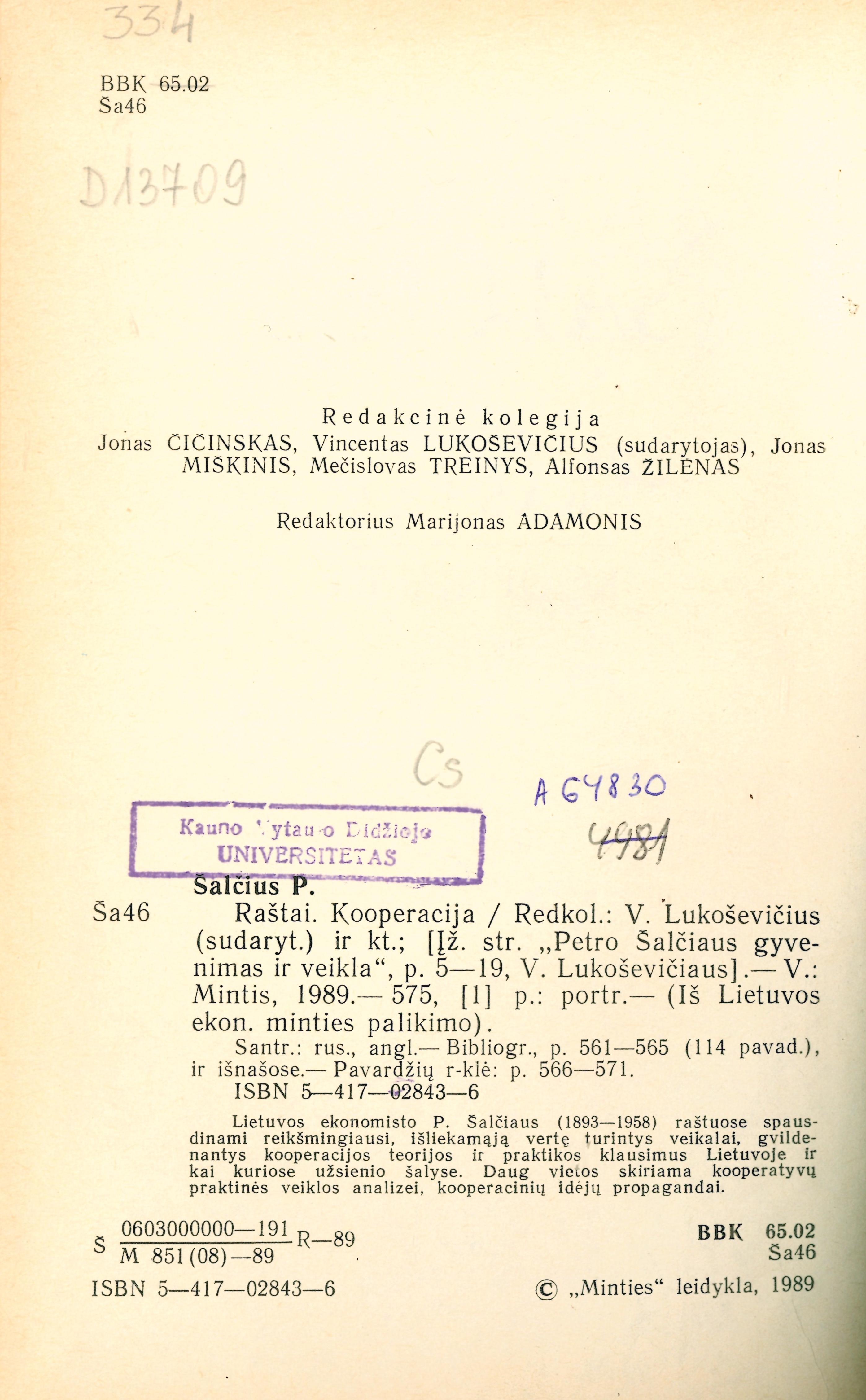 T. 1 : Kooperacija. – Vilnius : Mintis, 1989. – (Iš Lietuvos ekonominės minties palikimo)