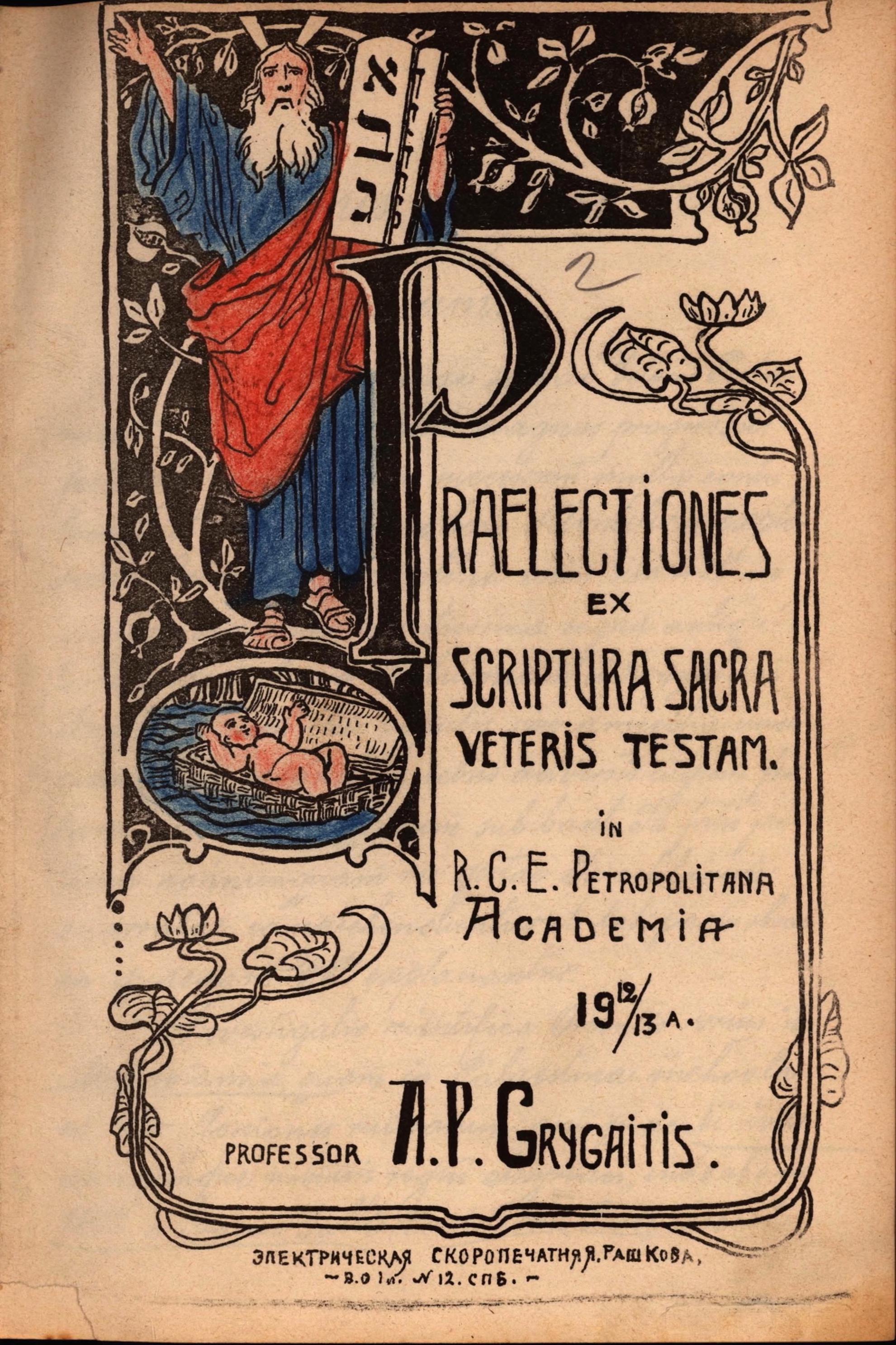 | Praelectiones ex Scriptura Sacra Veteris Testam[enti] in R[omanae] C[atholicae] E[cclesiae] Petropolitana Academia 1912/13 / A. P. Grygaitis. – [Petropoli: Academia Cæsarea Romano–Catholica Ecclesiastica Petropolitana], [1913]. – 256 p. [rankraštinė litografija] [lt] | |