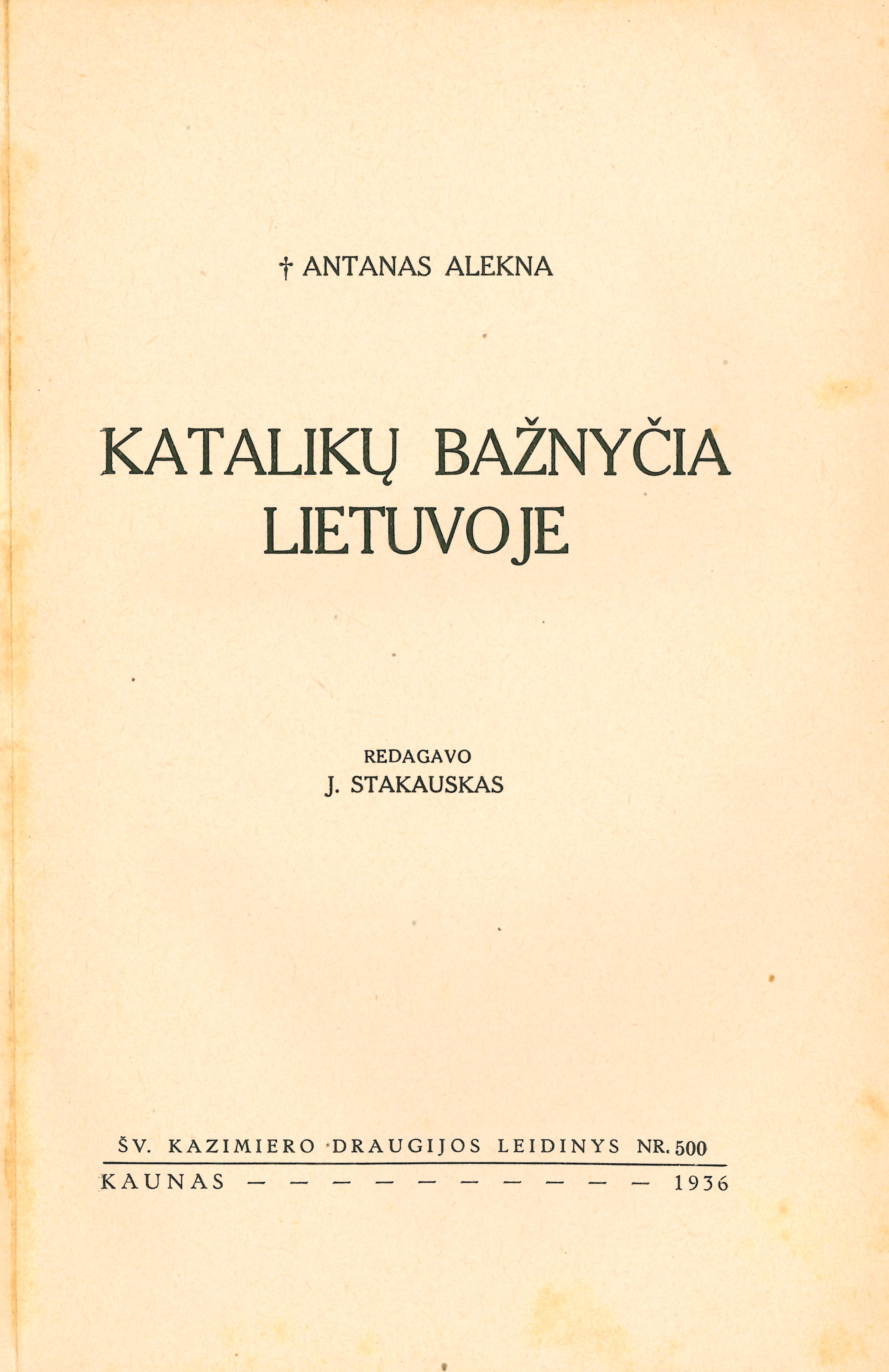 Antraštė Katalikų Bažnyčia Lietuvoje / Antanas Alekna; redagavo J. Stakauskas. – Kaunas: Šv. Kazimiero draugijos leidinys, 1936. – 154, 4 p. (Šv. Kazimiero draugijos leidinys, nr. 500) [lt]