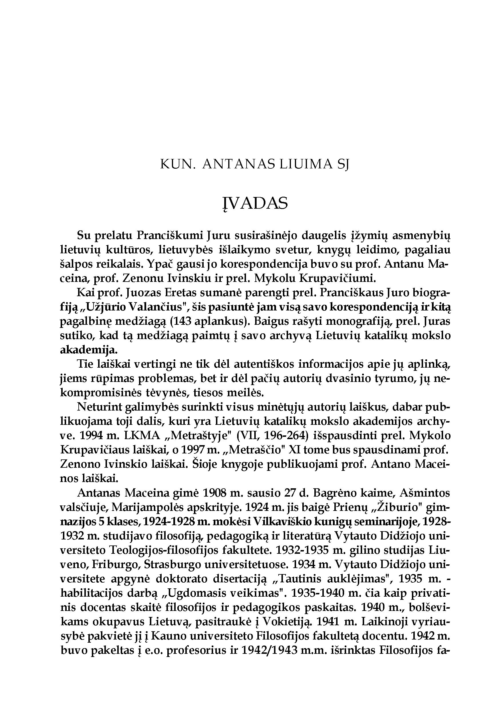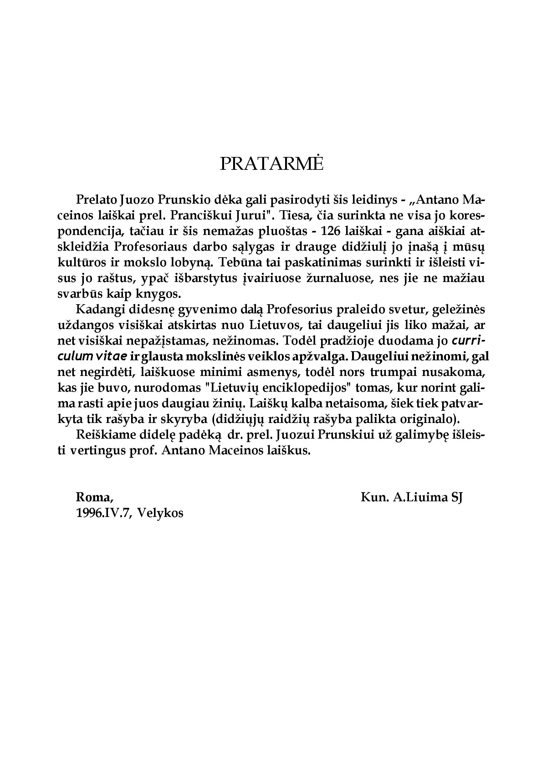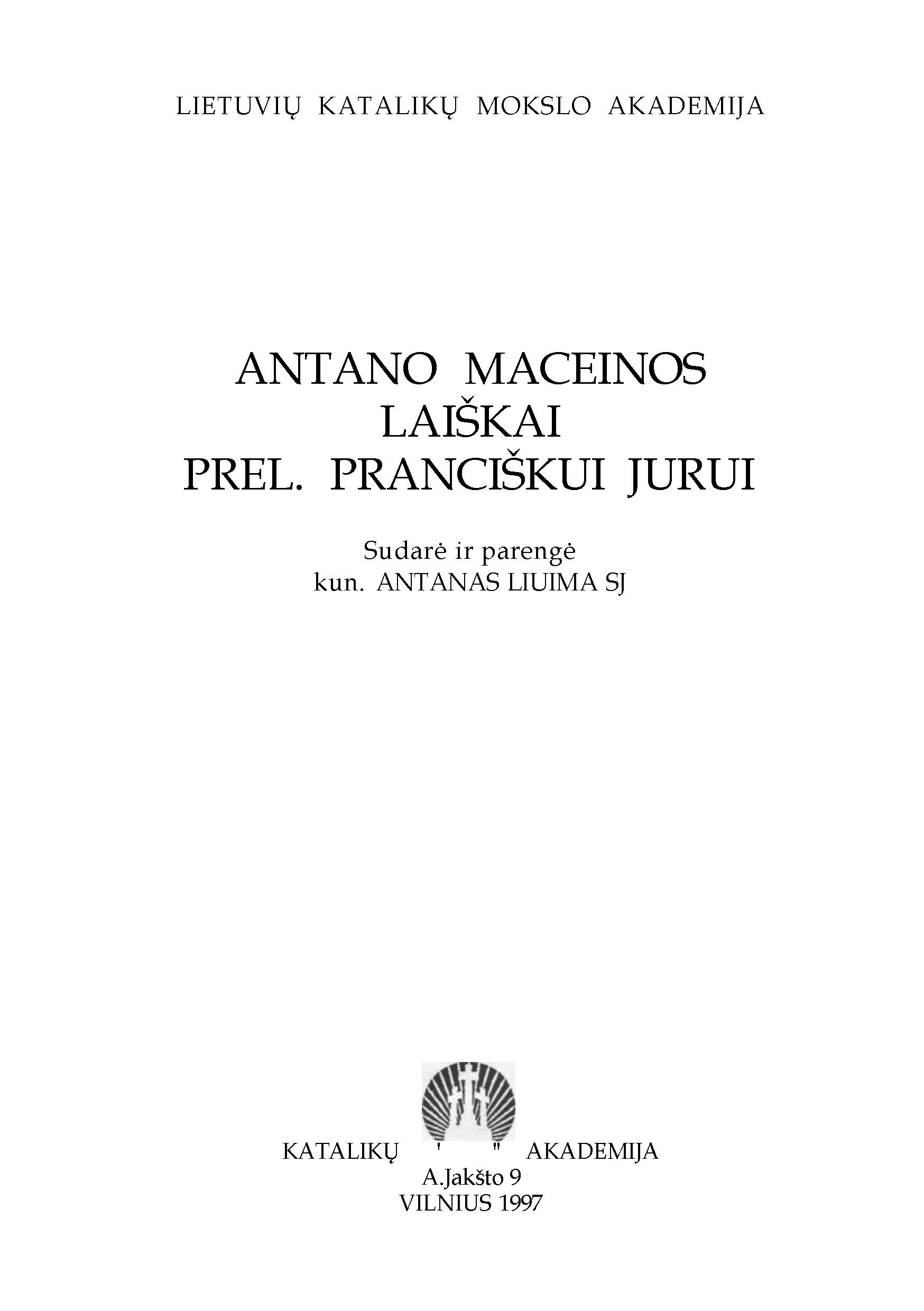 | Antraštė | Antano Maceinos laiškai prel. Pranciškui Jurui / sudarė ir parengė Antanas Liuima. – Vilnius: Lietuvių katalikų mokslo akademija, 1997. – 332 p. [lt] |