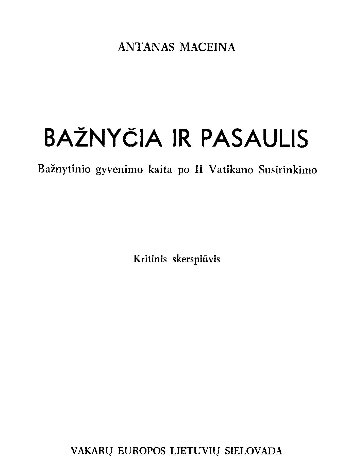 | Antraštė | Bažnyčia ir pasaulis: bažnytinio gyvenimo kaita po II Vatikano Susirinkimo: kritinis skerspiūvis / Antanas Maceina. – Chicago: Vakarų Europos Lietuvių Sielovada, 1970. – 157 p. [lt] |
