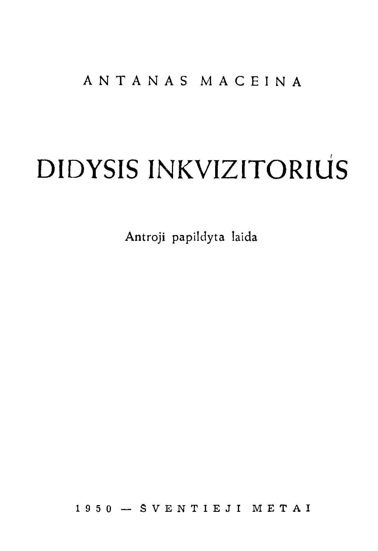 | Antraštė | Didysis inkvizitorius / Antanas Maceina. – 2–oji papildyta laida. – Bielefeld: Venta, 1950. – 221 p [lt] |