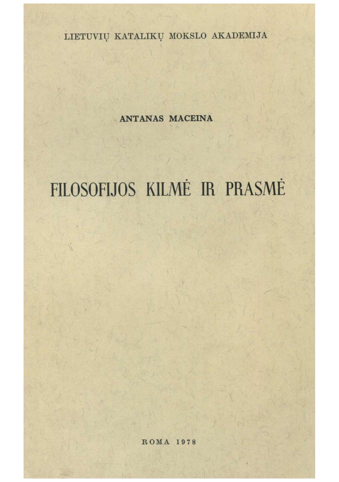 | Antraštė | Filosofijos kilmė ir prasmė = Ursprung und Sinn der Philosophie / Antanas Maceina. – Roma: Lietuvių katalikų mokslo akademija, 1978. – XII, 328 p [lt] |