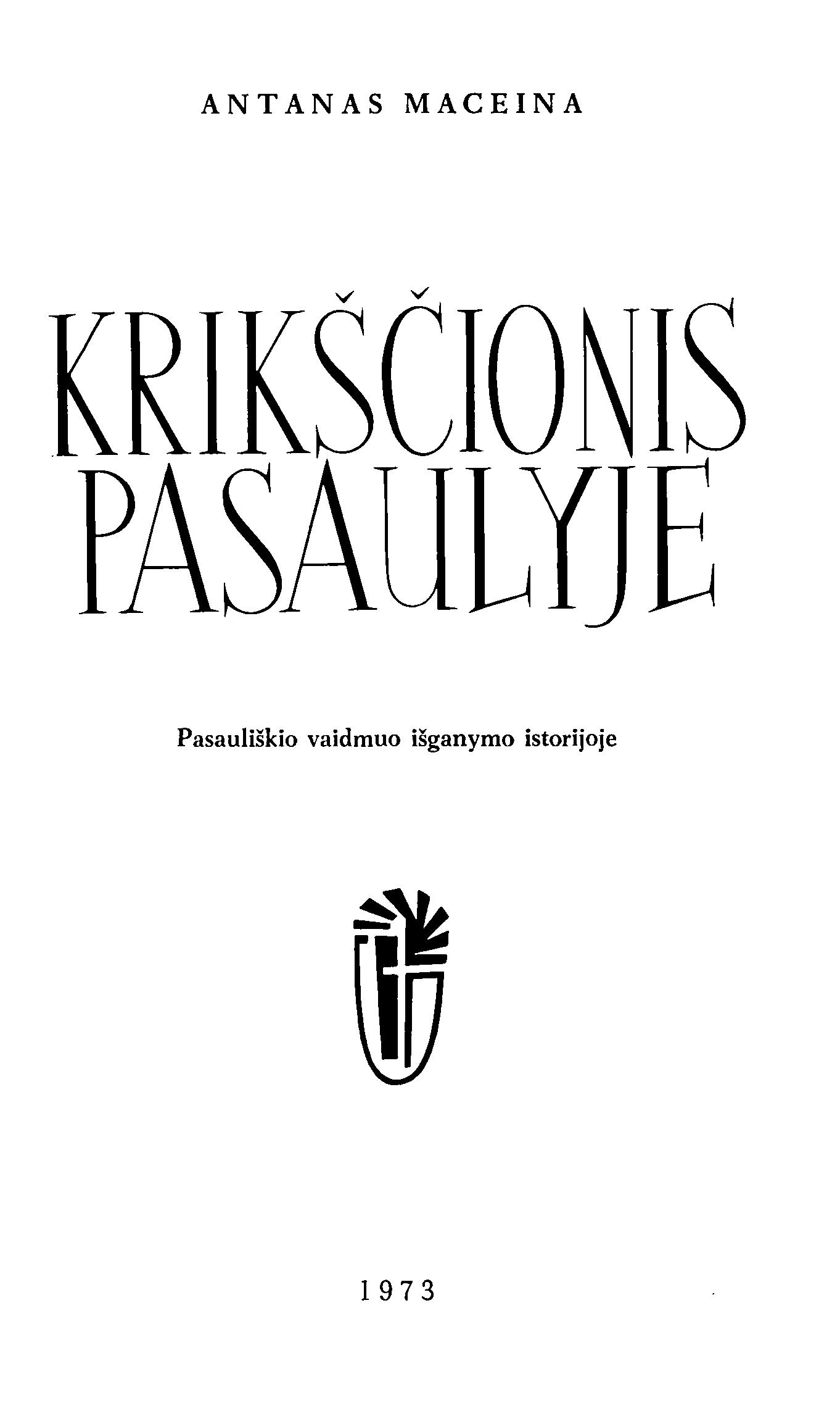 | Krikščionis pasaulyje: pasauliškio vaidmuo išganymo istorijoje / Antanas Maceina. – Chicago: Krikščionis gyvenime, 1973. – 402 p. (Krikščionis gyvenime, nr. 10) [lt] | |