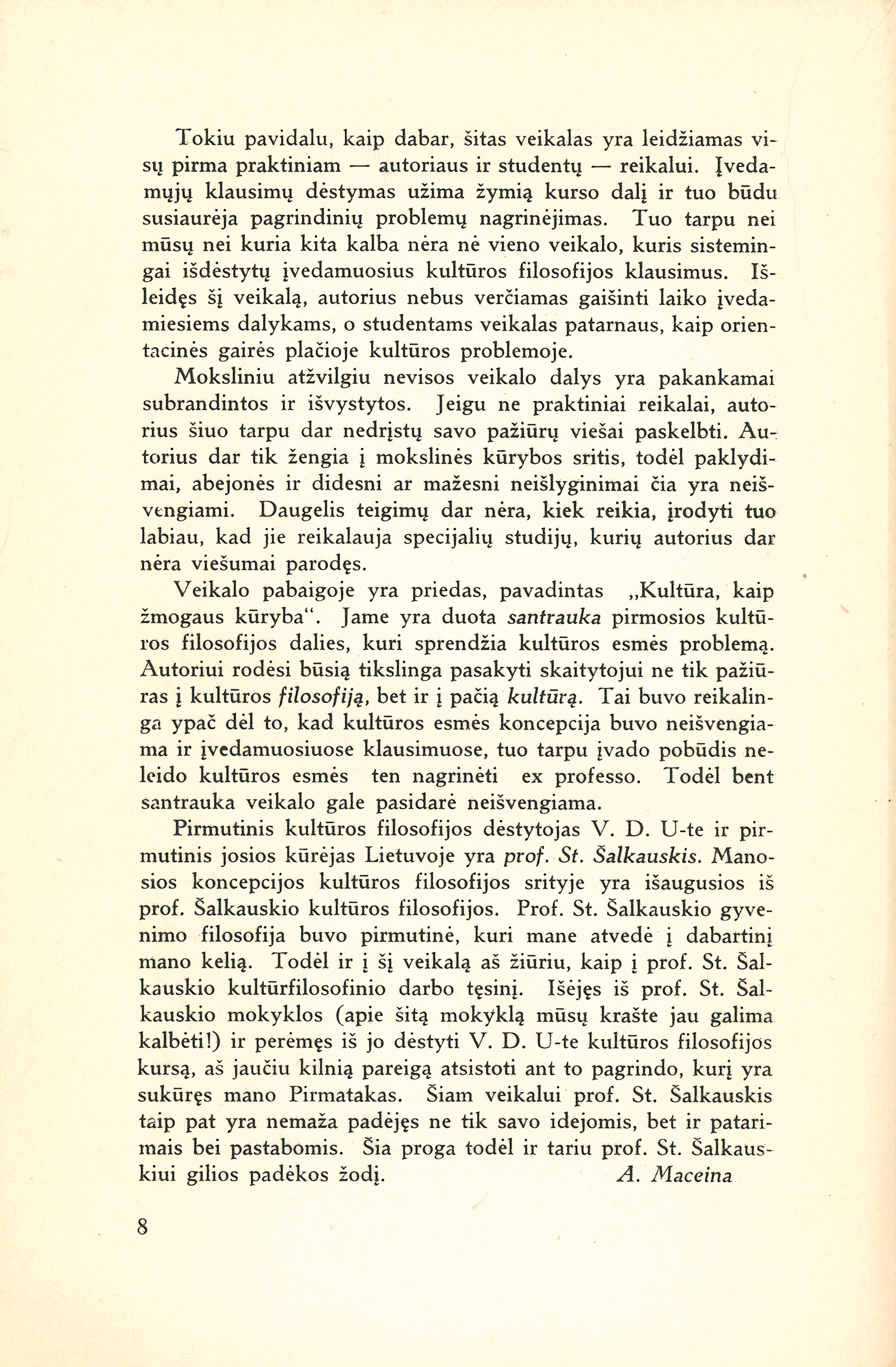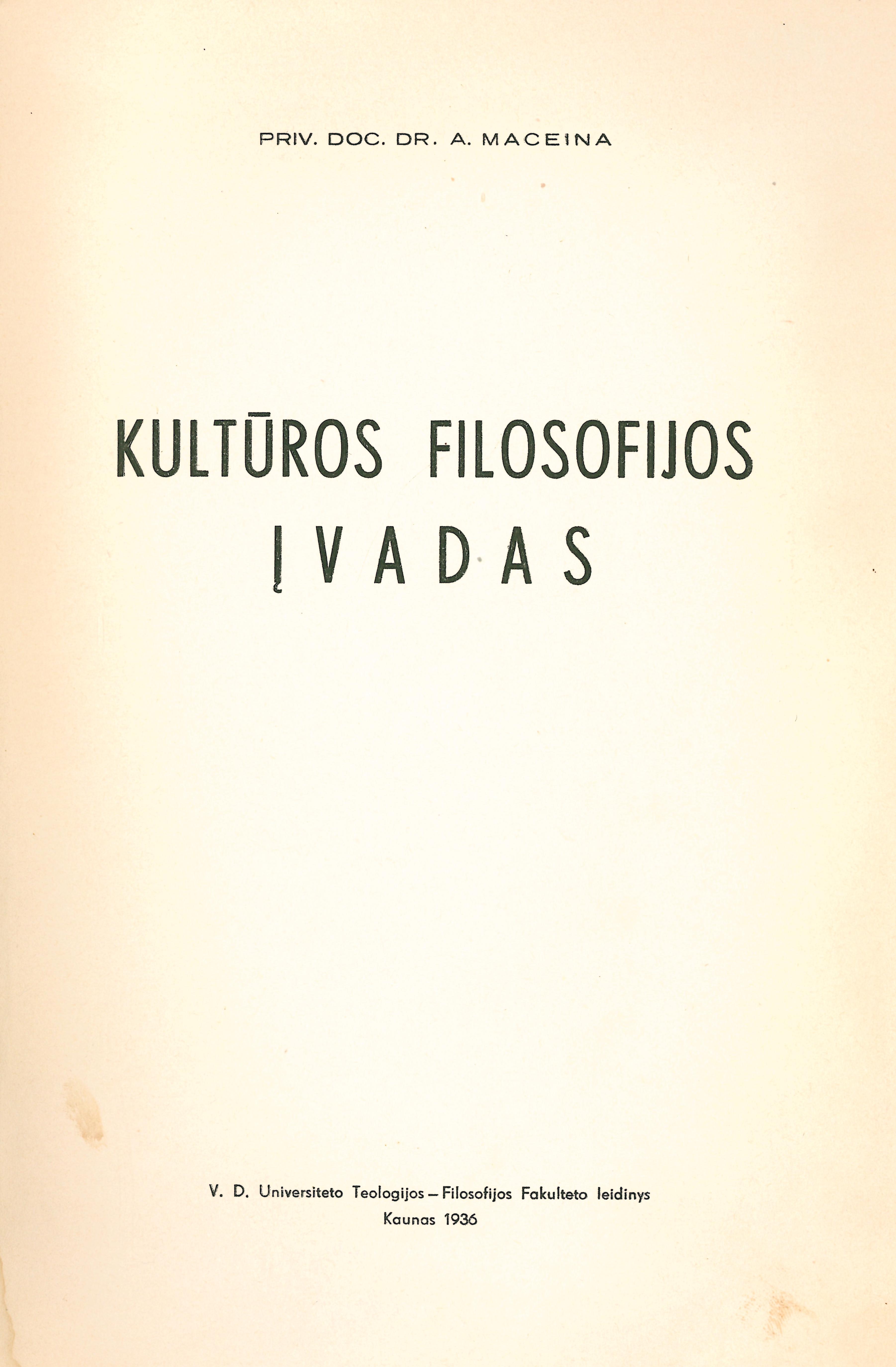 | Kultūros filosofijos įvadas = Introduction a la philosophie de la culture / A. Maceina ; Vytauto Didžiojo universitetas. Filosofijos fakultetas. – Kaunas : Vytauto Didžiojo universitetas, 1936. – 225 p. [lt] | |