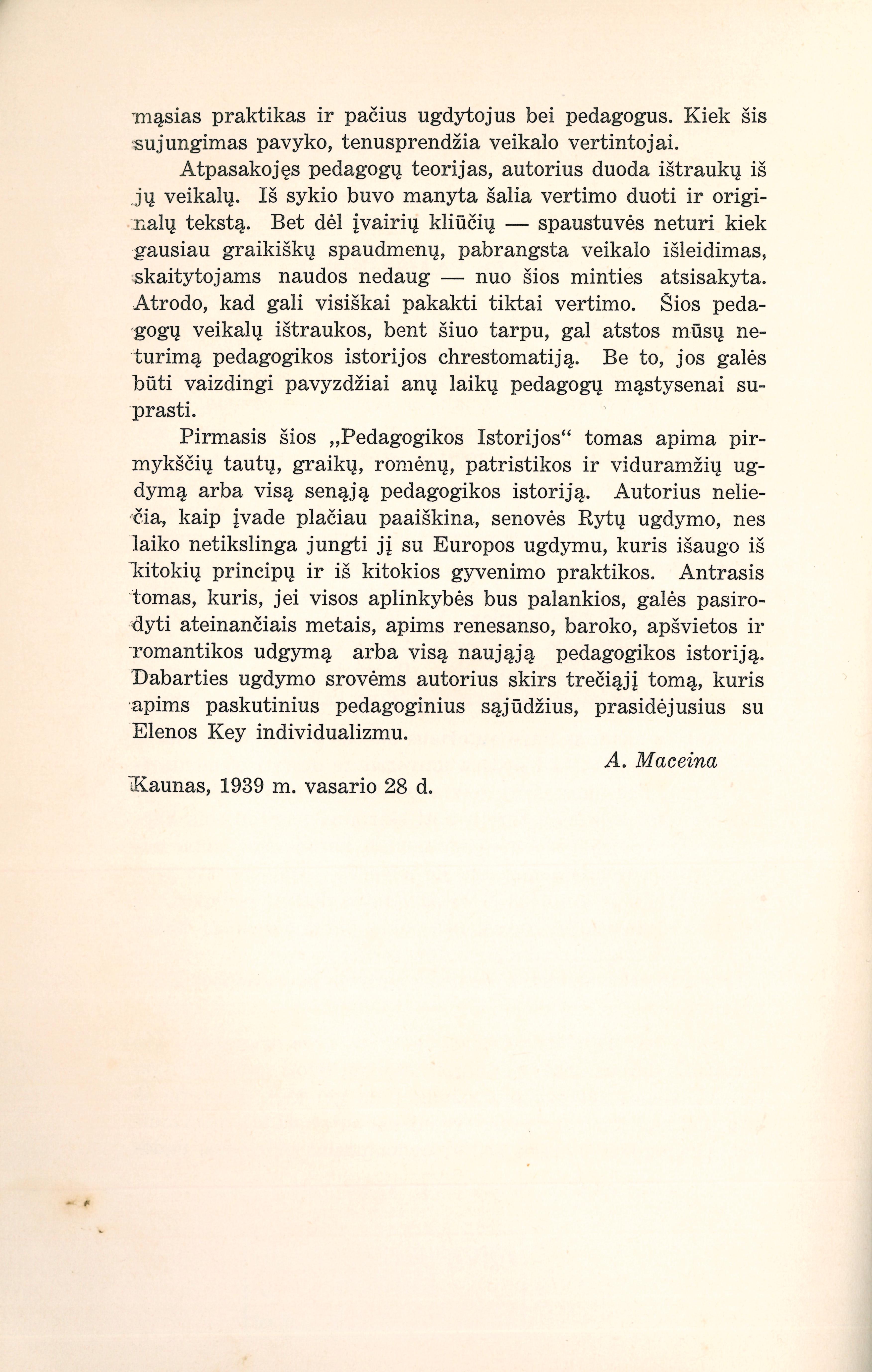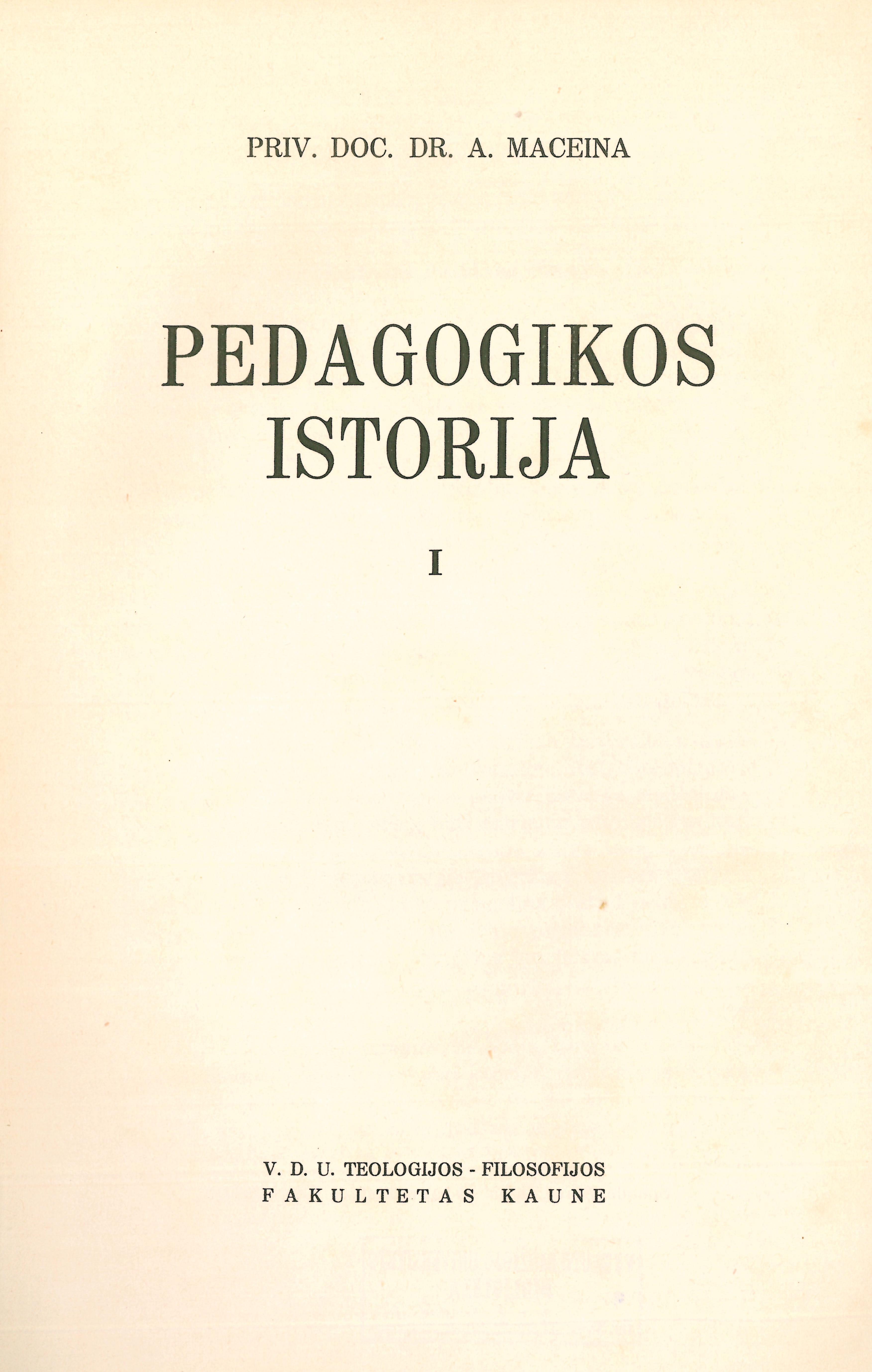 Pedagogikos istorija. T. 1 / A. Maceina. – Kaunas: V.D.U. Teologijos-filosofijos fakultetas, 1939. – VIII, 392 p.