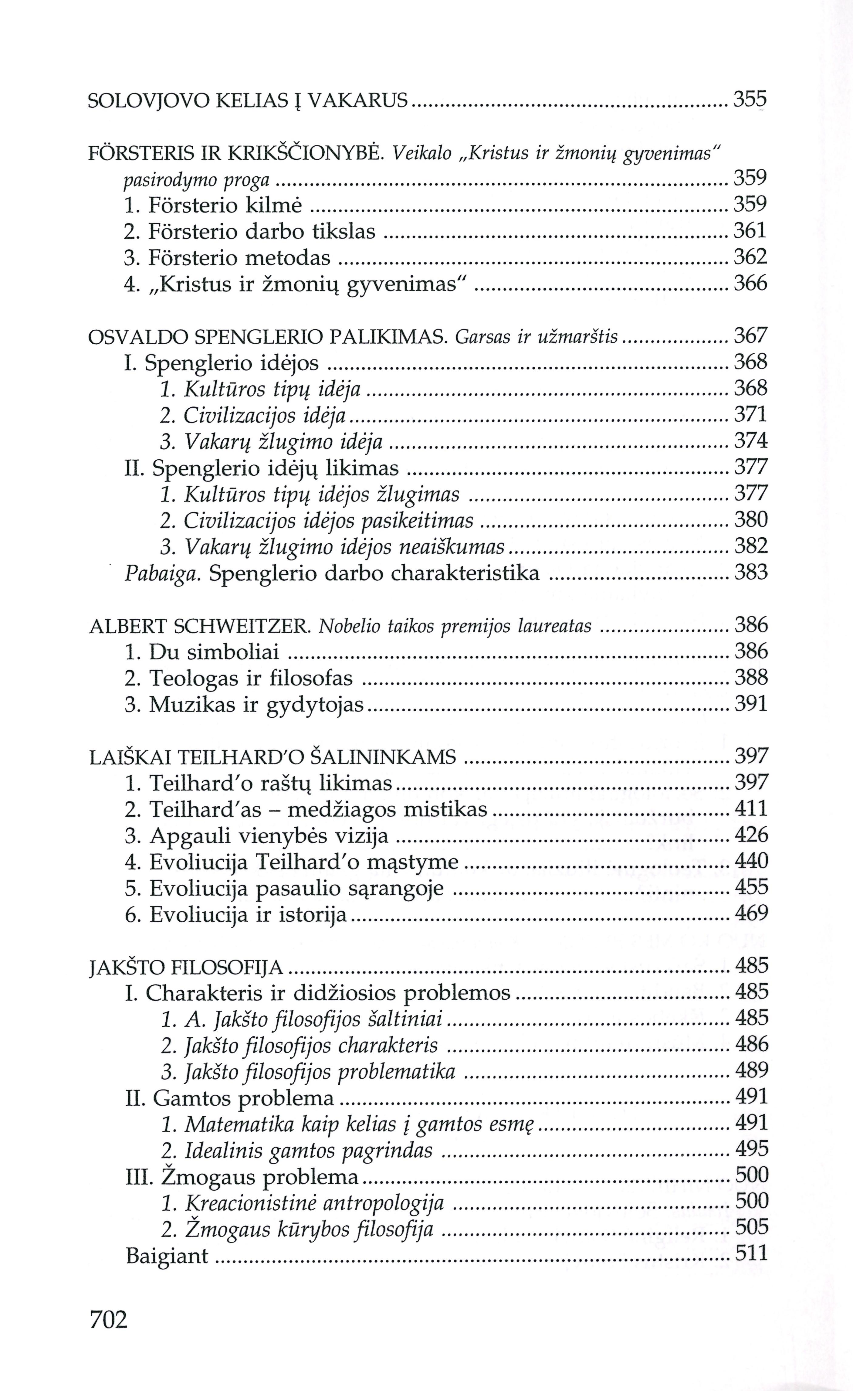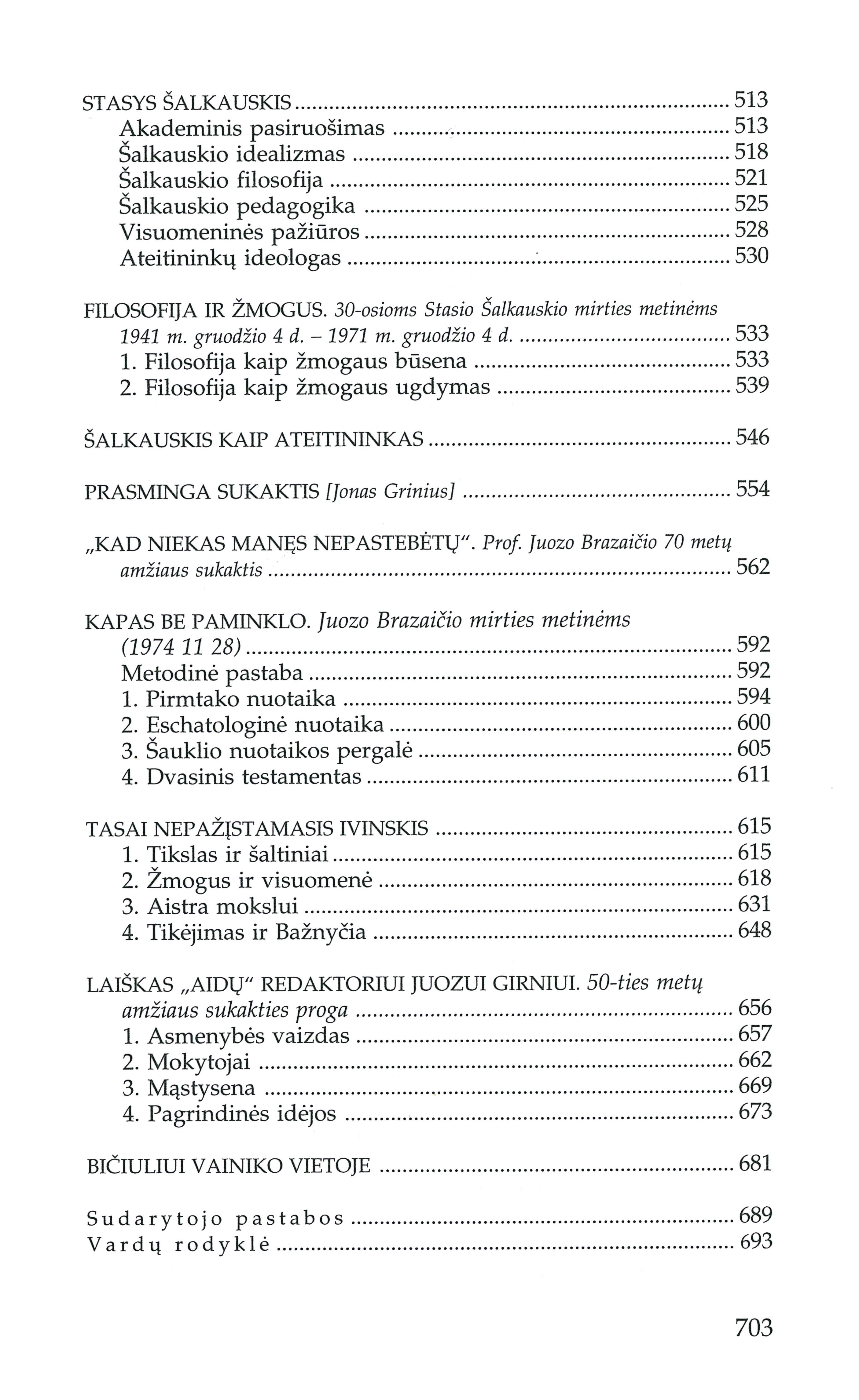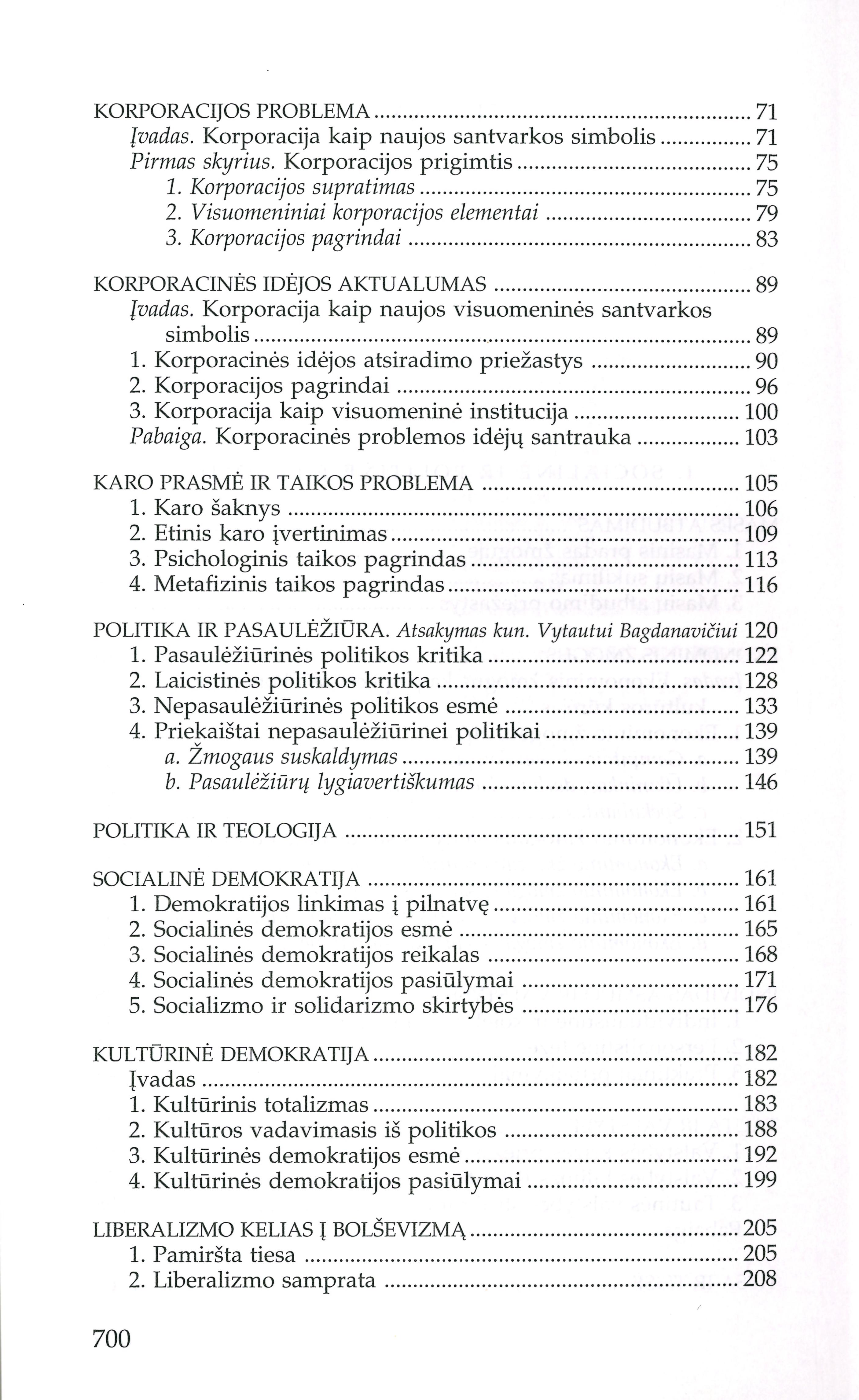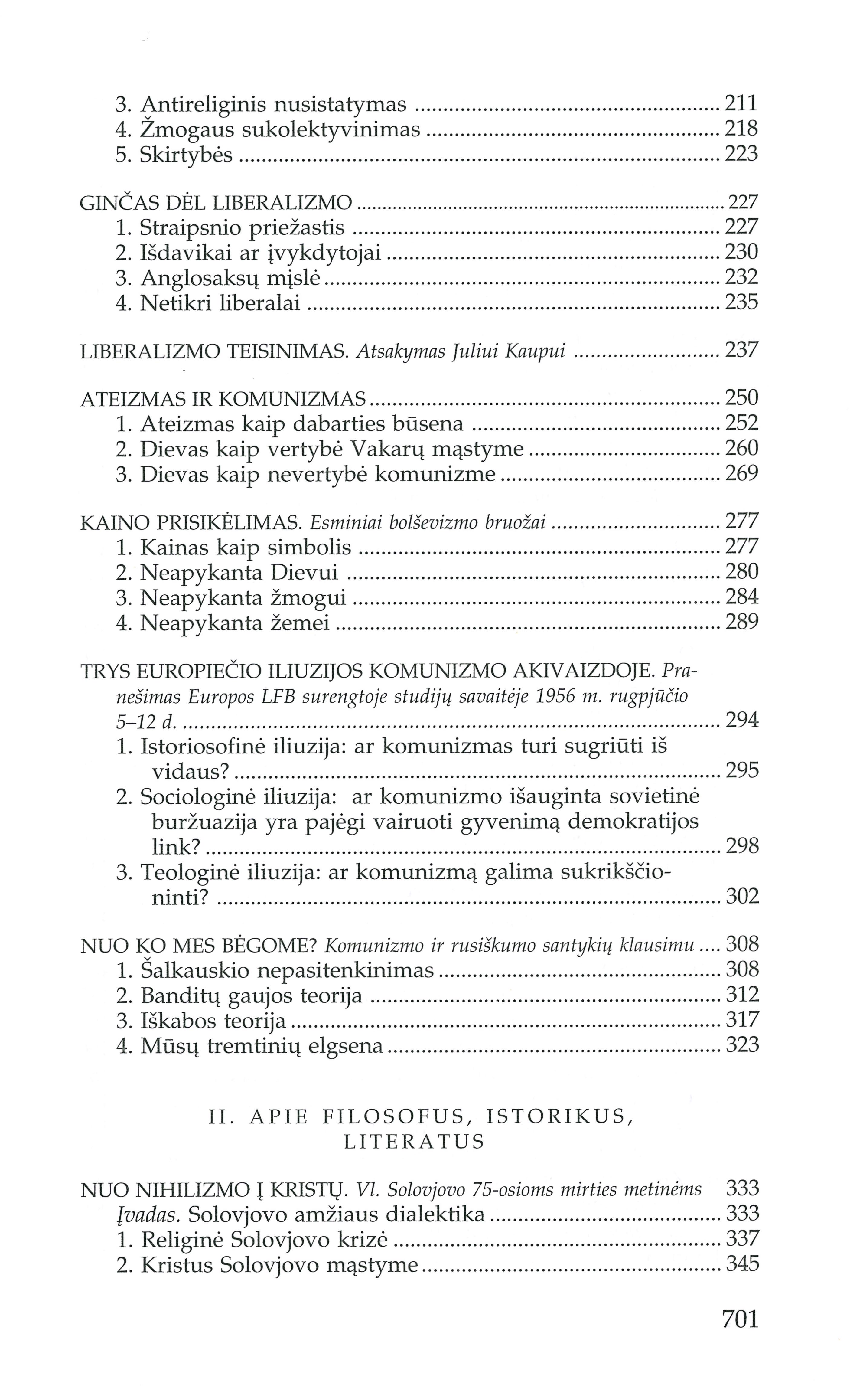 | Turinys: Masės atbudimas (1938); Ekonominis žmogus (1938); Individas-asmuo ir valstybė (1936); Tauta ir valstybė (1939-1941); Tiesa ir teisė (1952); Korporacijos problema (1935); Korporacinės idėjos aktualumas (1936); Karo prasmė ir taikos problema (1932); Politika ir pasaulėžiūra (1948); Politika ir teologija (1969); Socialinė demokratija (1947); Kultūrinė demokratija (1947); Liberalizmo kelias į bolševizmą (1948); Ginčas dėl liberalizmo (1948); Liberalizmo teisinimas (1948); Ateizmas ir komunizmas (1969); Kaino prisikėlimas (1949); Trys europiečio iliuzijos komunizmo akivaizdoje (1957); Nuo ko mes bėgome? (1971); Nuo nihilizmo į Kristų (1975); Solovjovo kelias j Vakarus (1953); Förstern ir krikščionybė (1931); Osvaldo Spenglerio palikimas (1936); Albert Schweitzer (1954); Laiškai Teilhard'o šalininkams (1973); Jakšto filosofija (1938); Stasys Šalkauskis (1946); Filosofija ir žmogus (1971); Šalkauskis kaip ateitininkas (1949); Prasminga sukaktis (1953); „Kad niekas manęs nepastebėtų" (1973); Kapas be paminklo (1975); Tasai nepažįstamasis Ivinskis (1972); Laiškas „Aidų" redaktoriui Juozui Girniui (1965); Bičiuliui vainiko vietoje (1975). [lt] | |