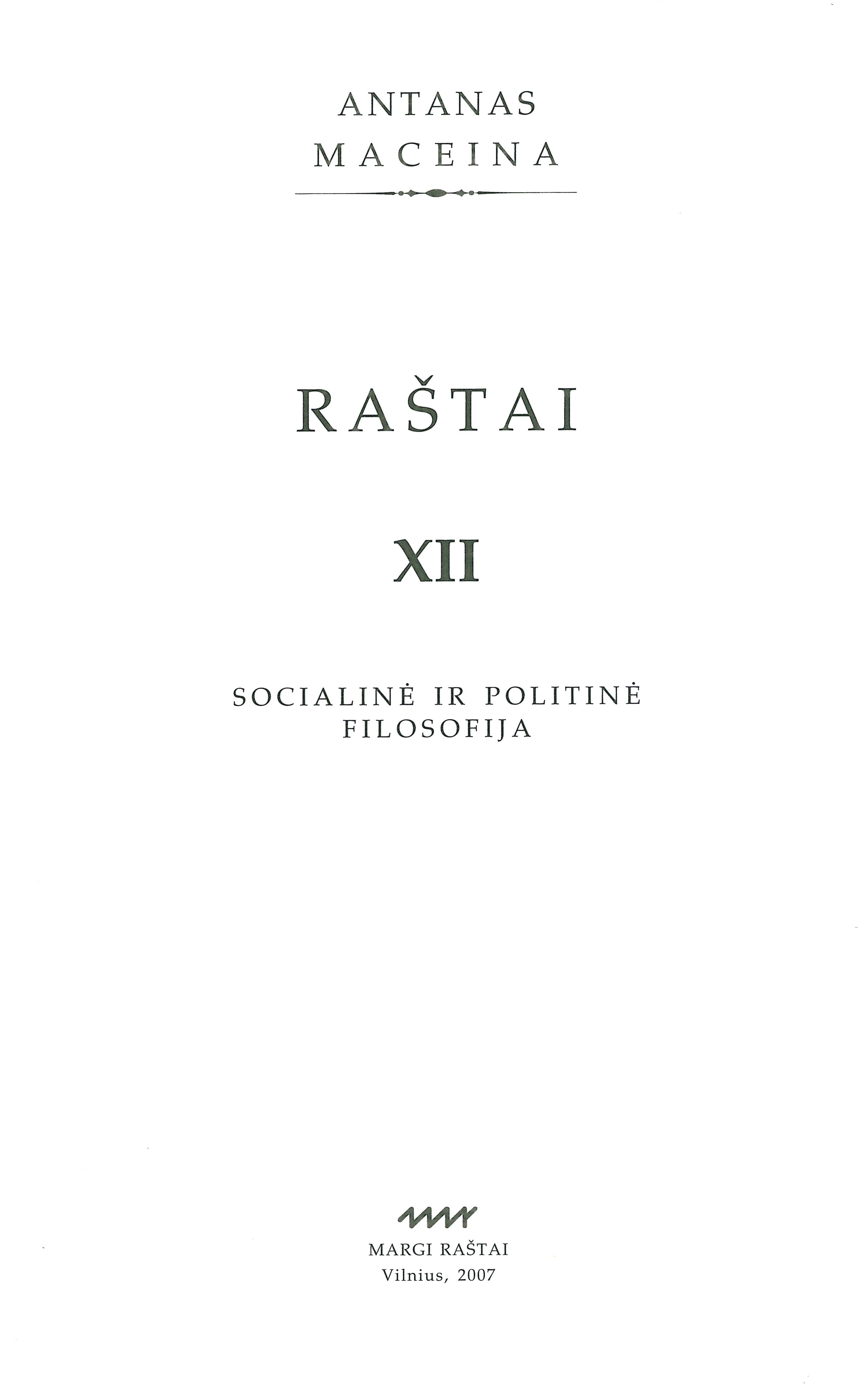 | Antraštė | Raštai. T. 12: Socialinė ir politinė filosofija / Antanas Maceina; parengė Antanas Rybelis. – Vilnius: Margi raštai, 2007. – 703 p. [lt] |