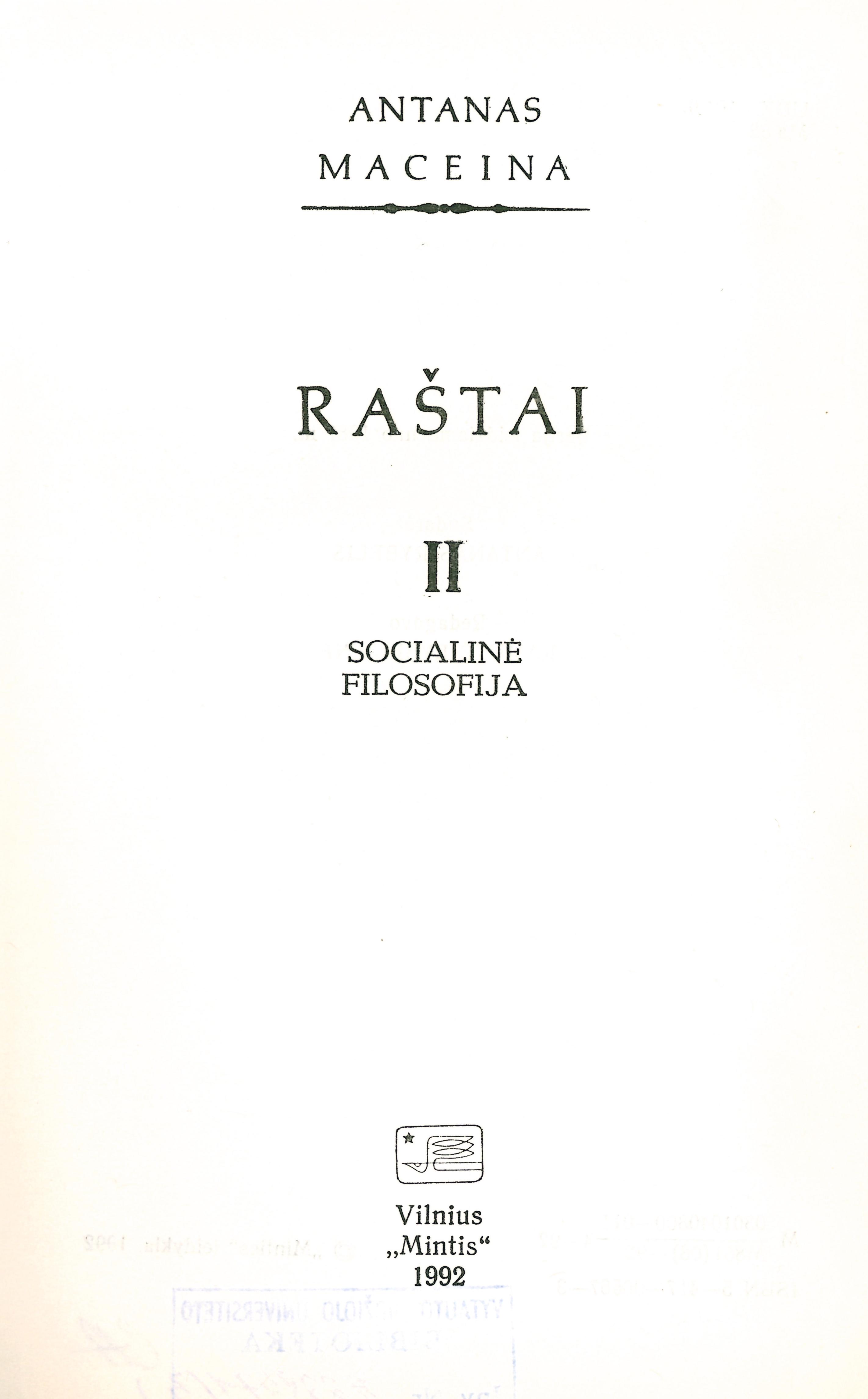 | Antraštė | Raštai. T. 2: Socialinė filosofija / Antanas Maceina; sudarė Antanas Rybelis. – Vilnius: Mintis, 1992. – 477 p. [lt] |